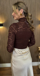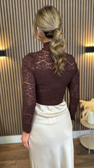 Elevate your style with the Jinx Brown Lace High Neck Top! This playful piece features a delicate all-over lace design and a chic high neckline. Its cropped length adds a flirty touch, while long sleeves balance the look with elegant coverage. Lined from the bust down for comfort and confidence, this top is perfect for making a statement at your next night out or special occasion.