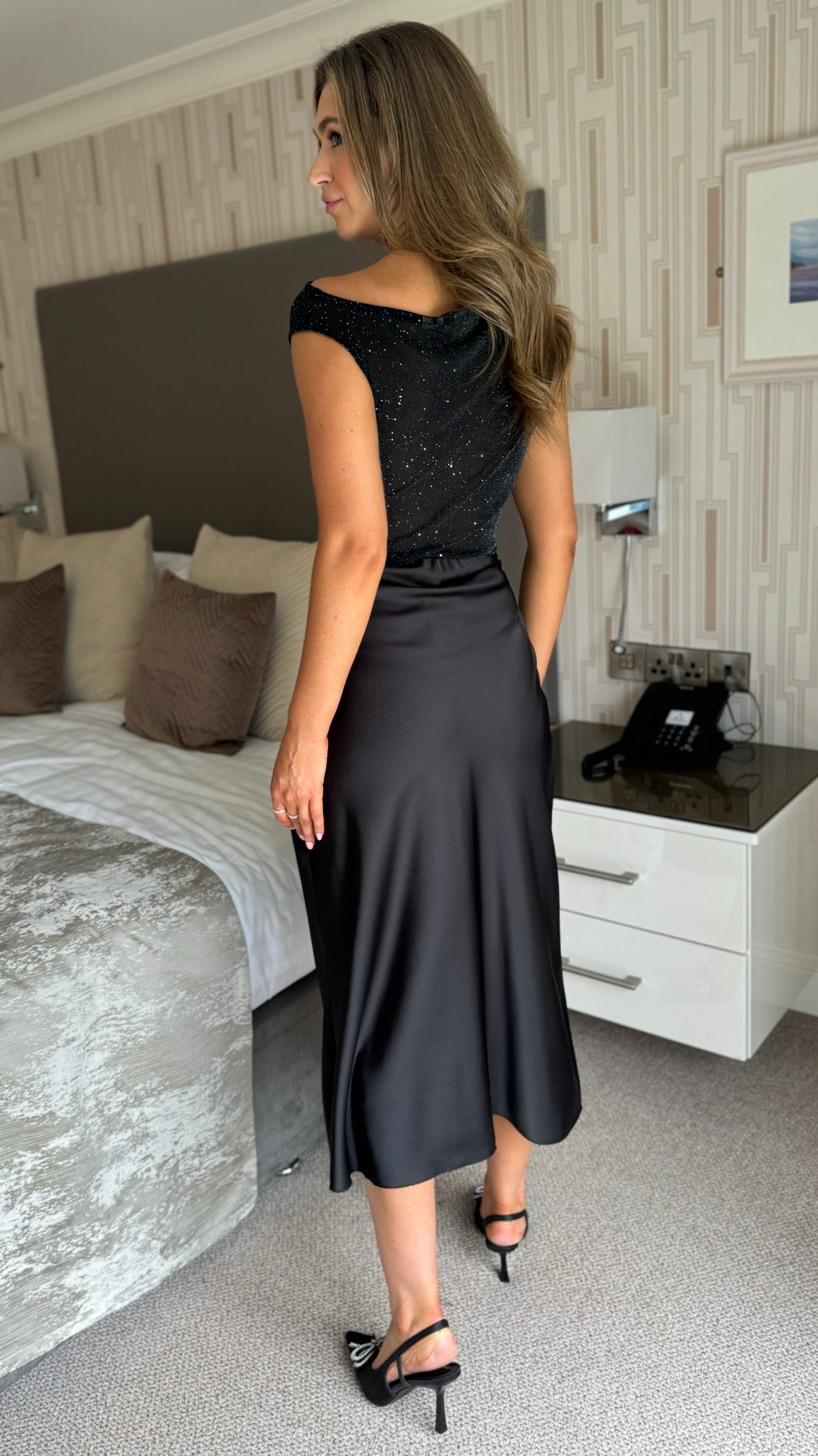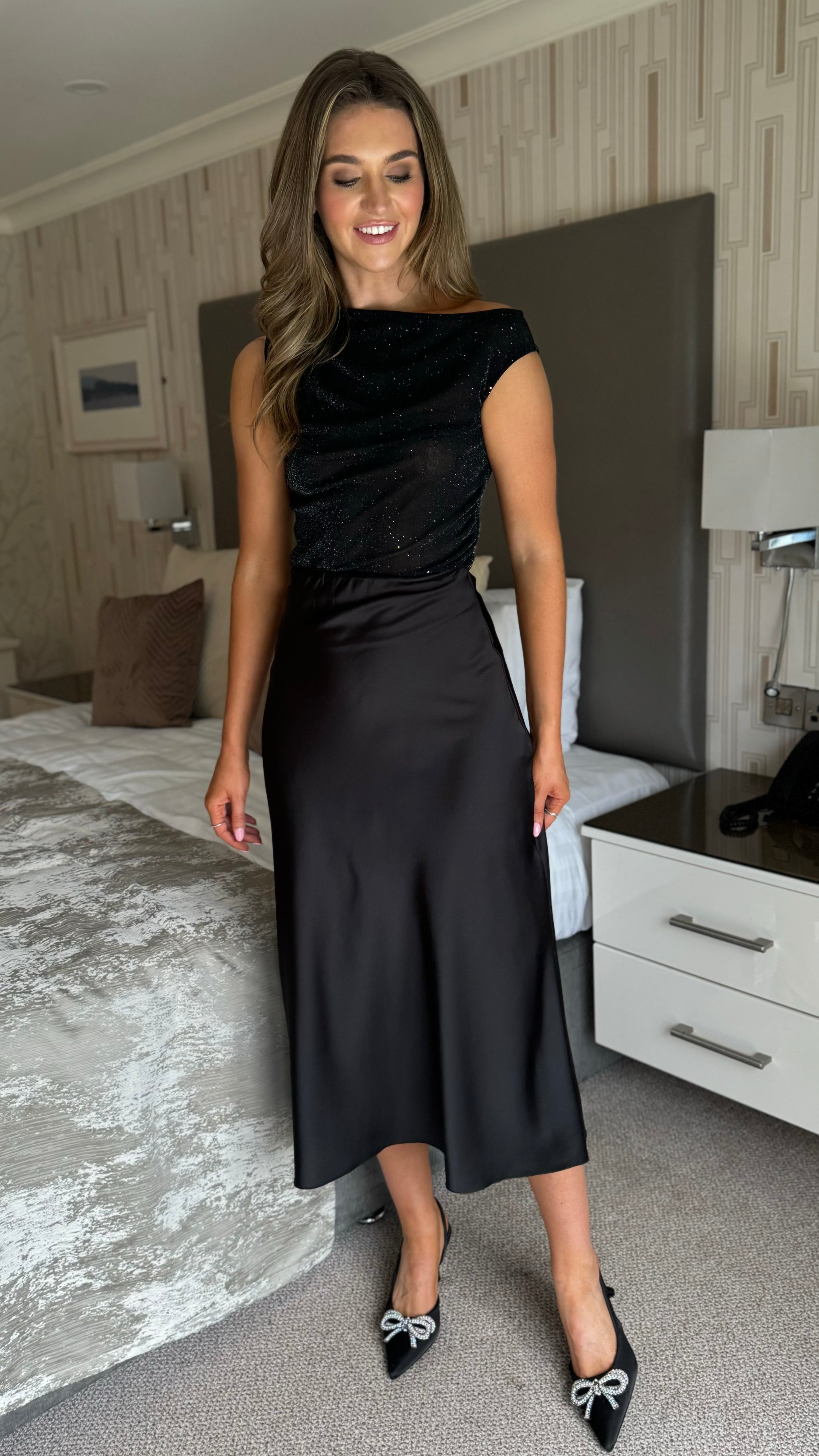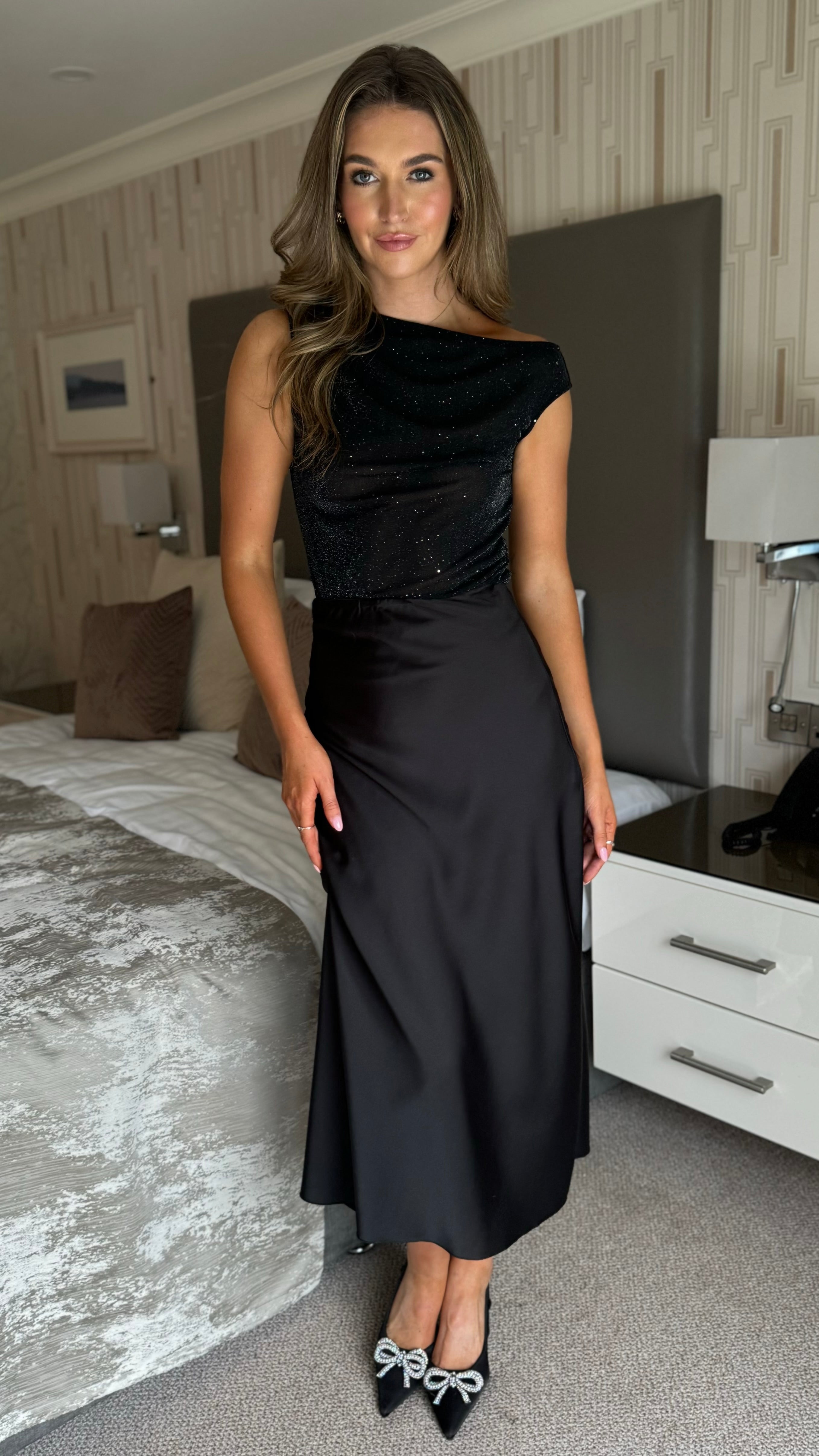 The Jolene Black Sparkle Sleeveless Top ✨ adds a touch of glam and can be rocked off the shoulder for a cheeky look! 😘