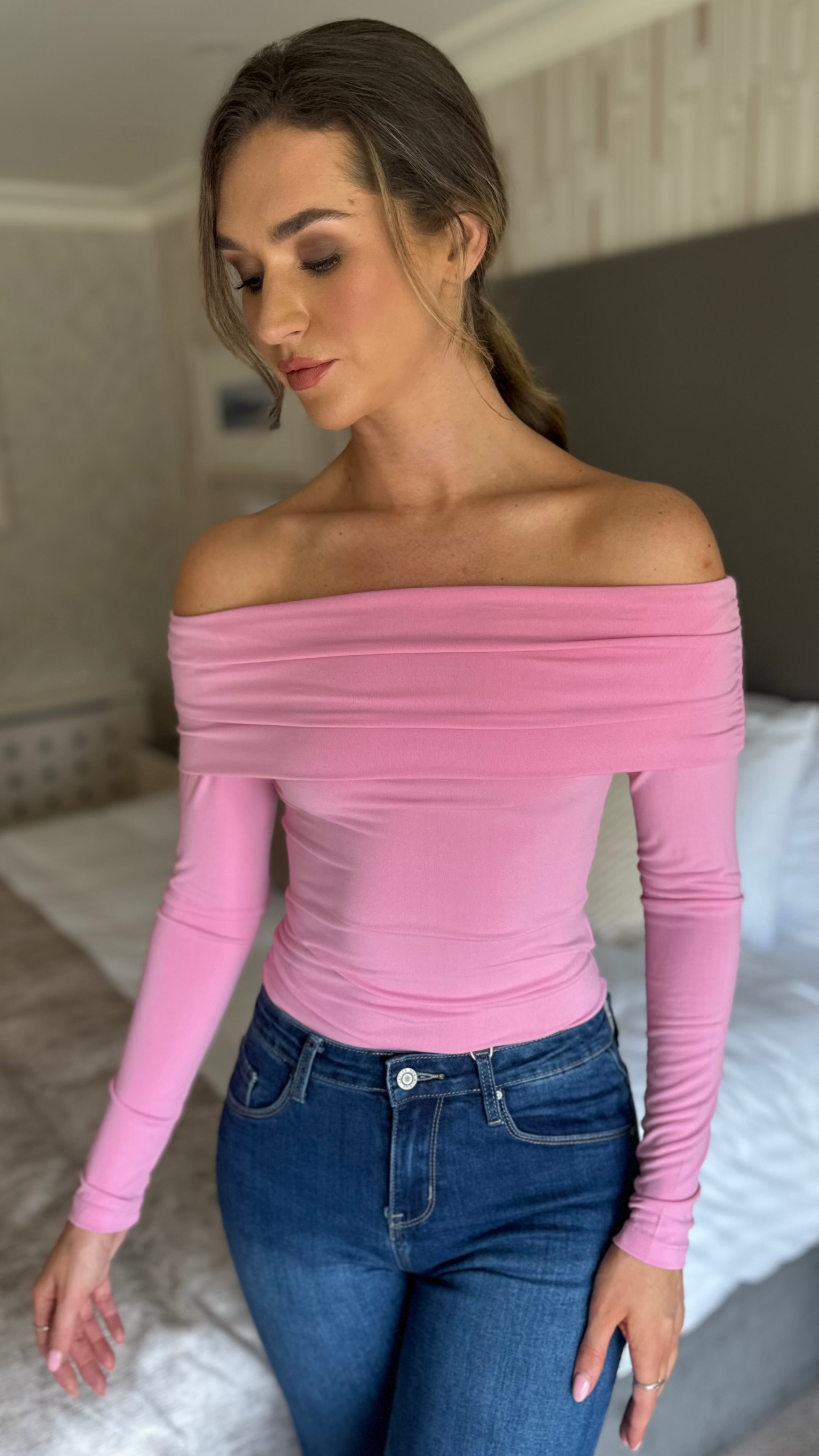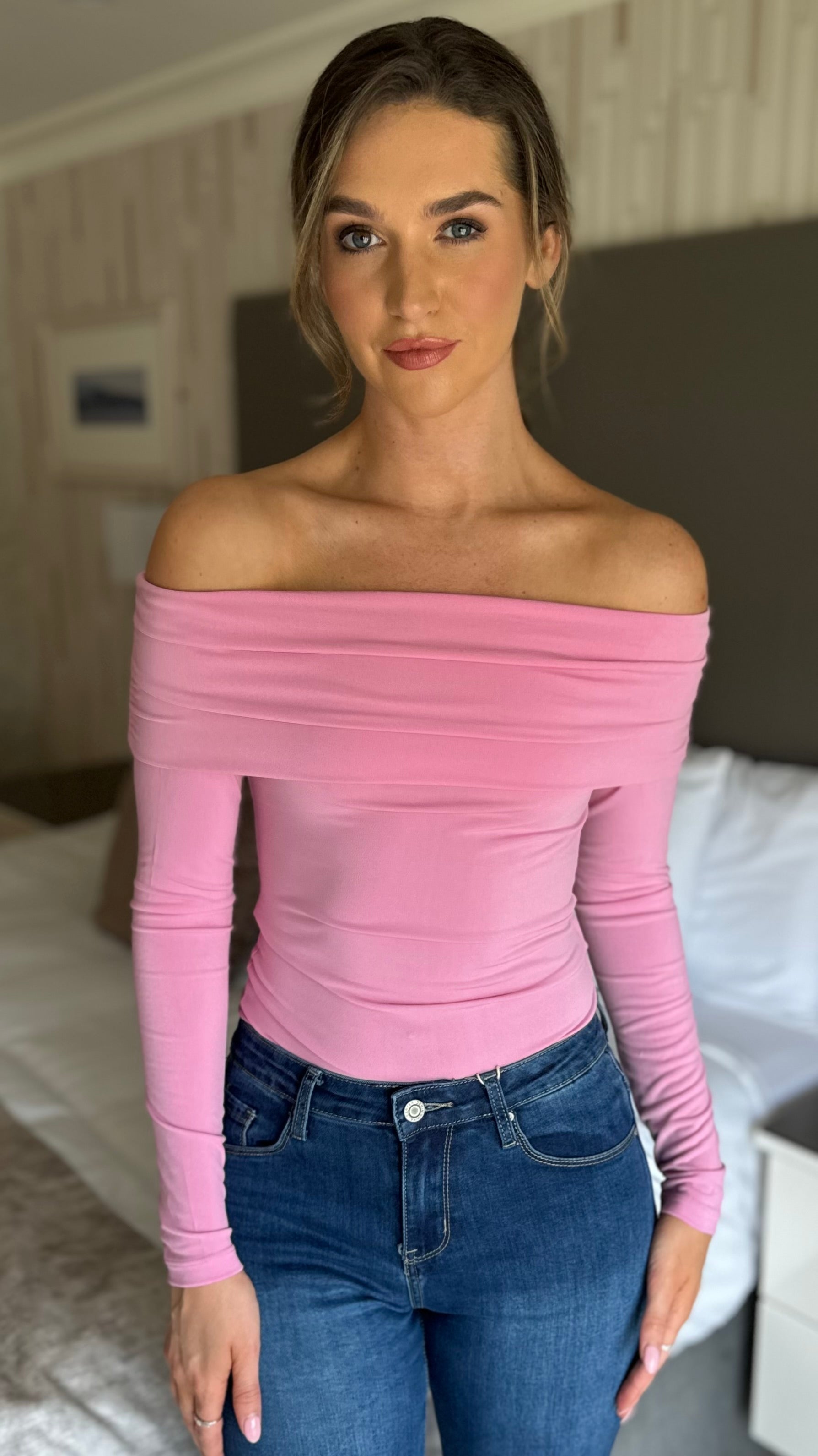 Kacie Pink Off the Shoulder Long Sleeve Jersey Top