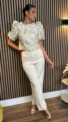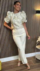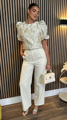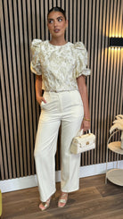 Elegantly crafted cream trousers featuring a refined straight leg silhouette. These tailored Kalie trousers offer timeless sophistication with a contemporary edge. Perfect for elevating your professional wardrobe or adding polished charm to casual ensembles.