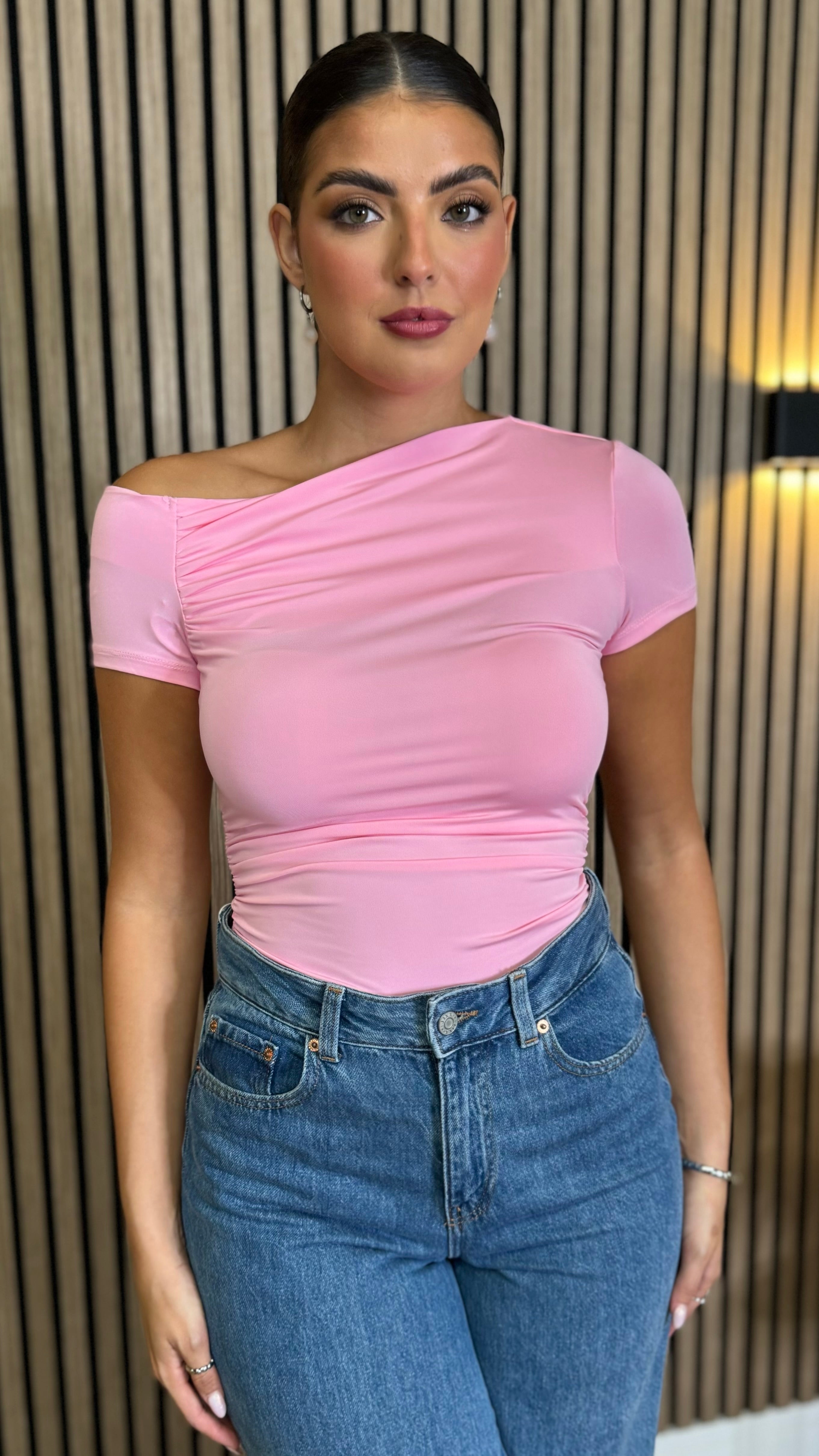 The Kayleigh Pink One Shoulder Ruched Top offers a stylish and flattering fit with its elegant one-shoulder design and ruched detailing. Perfect for adding a touch of sophistication to your wardrobe, this top pairs effortlessly with both casual and dressy outfits. Its unique silhouette enhances your natural shape while providing comfortable wear throughout the day or evening. Embrace confidence and style with this versatile piece that supports your fashion needs.