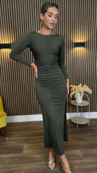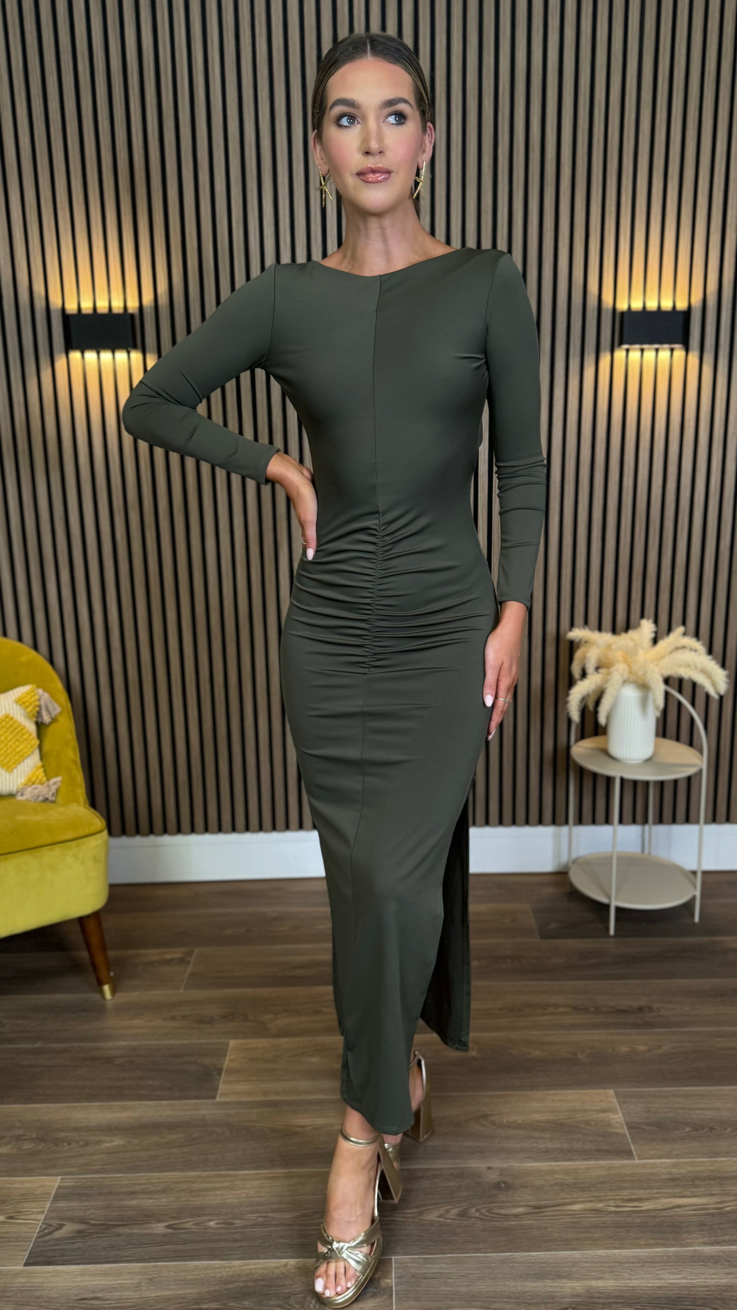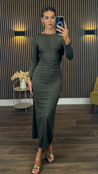 Keelin Khaki High Neck Open Back Ruched Midi Dress