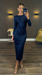 Keelin Navy High Neck Open Back Ruched Midi Dress