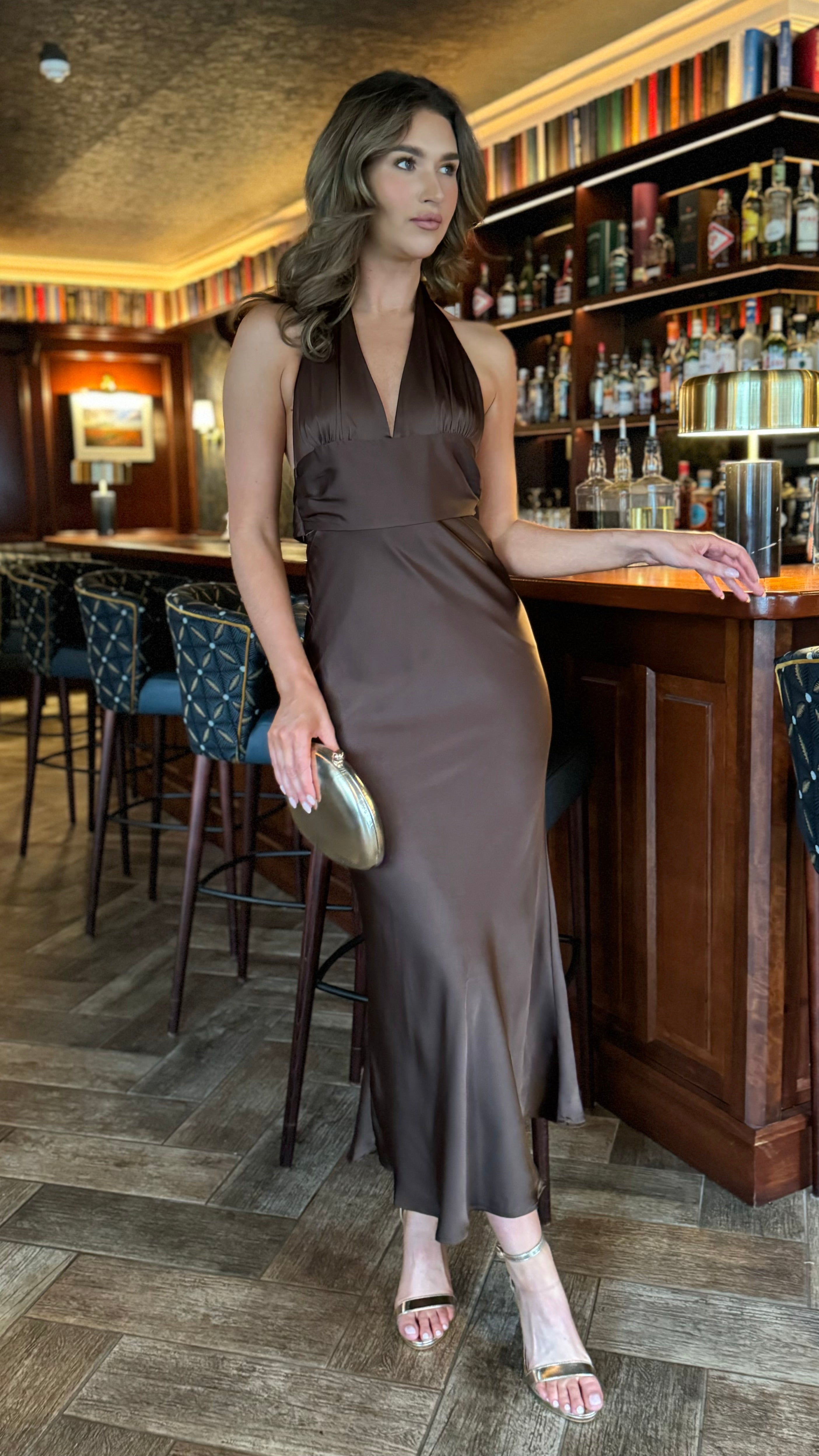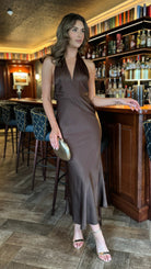 Keeva Brown Satin Halter Neck Backless Midi Dress