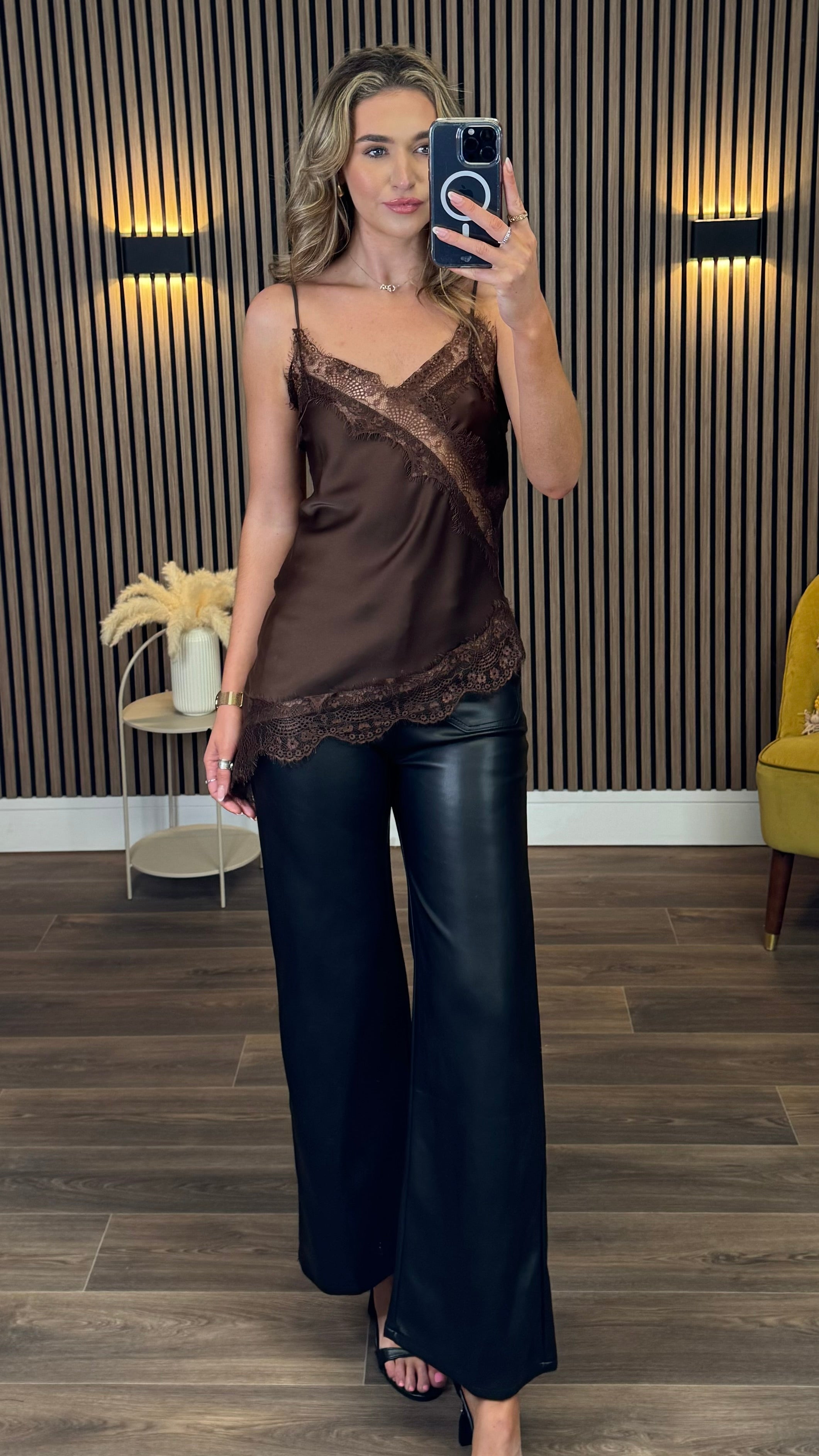 Slip into effortless elegance with the Kelsey Brown Lace Detail Asymmetric Top. Delicate cami straps frame the shoulders while luxe satin fabric drapes beautifully against your skin. The playful asymmetric hem adds movement and intrigue, while intricate lace trim details bring a touch of romance to every wear. Perfect for dressing up or down, this versatile piece transitions seamlessly from day to night.