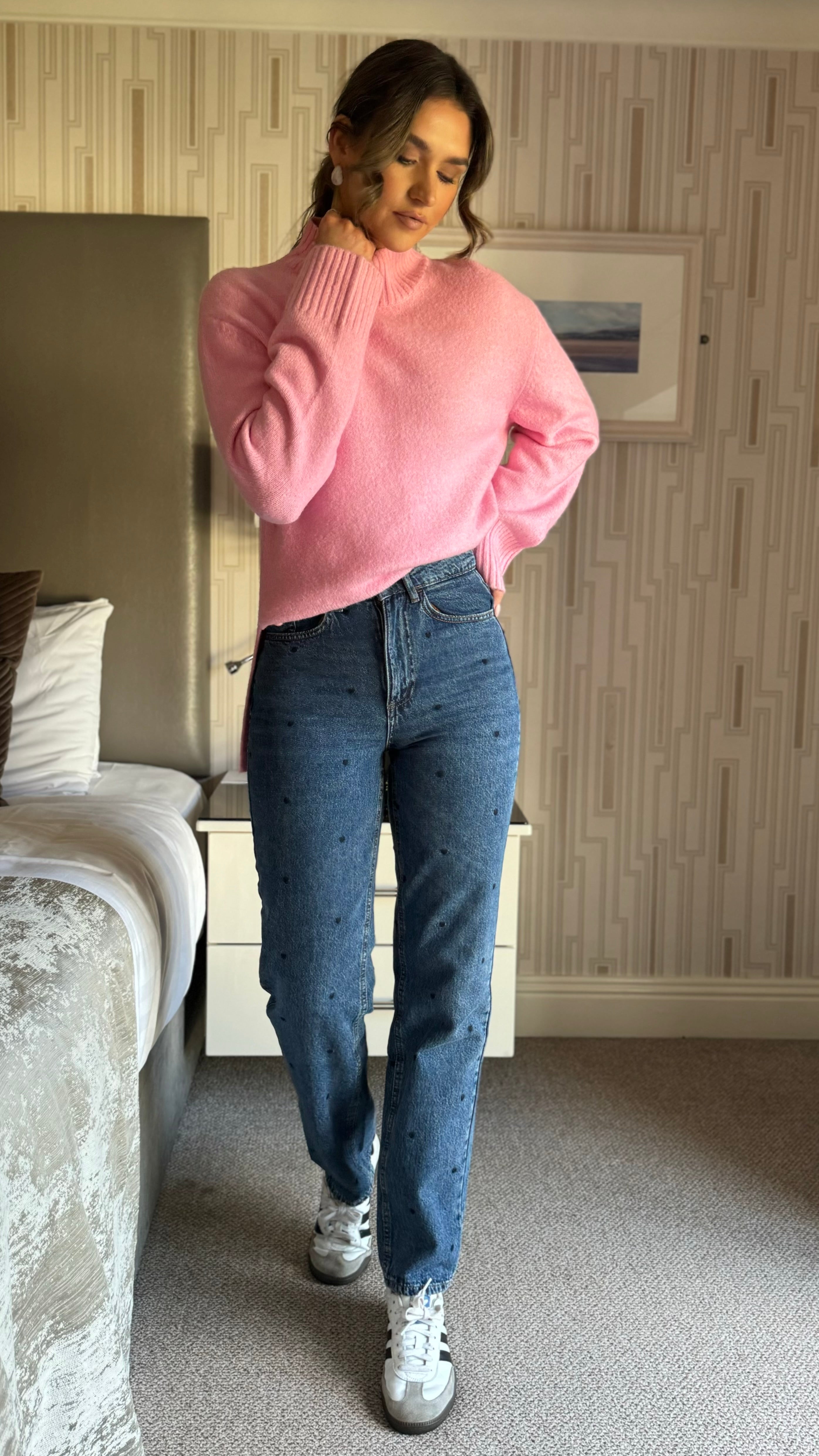 Introducing the Khloe jeans – your new denim obsession! These mid-blue beauties feature an adorable heart pattern that adds a fun twist to classic styling. With a flattering high-waisted cut and straight-leg silhouette, they're designed to flatter and elongate. Dual fastening with button and zip keeps everything secure, while five functional pockets offer practical storage. Signature stitching details add character and durability. Perfect for dressing up or down, these jeans are your go-to for effortless style with personality.