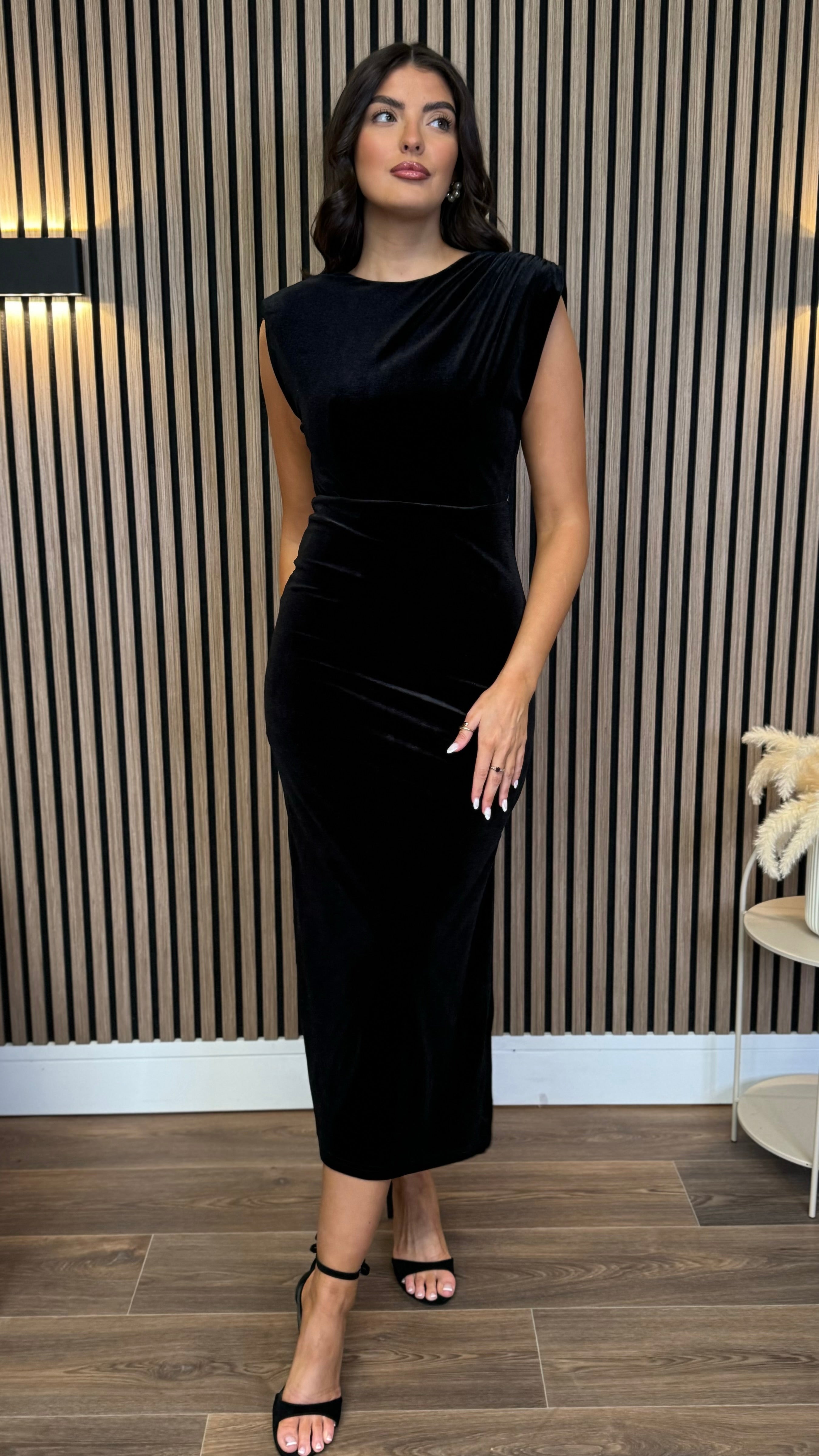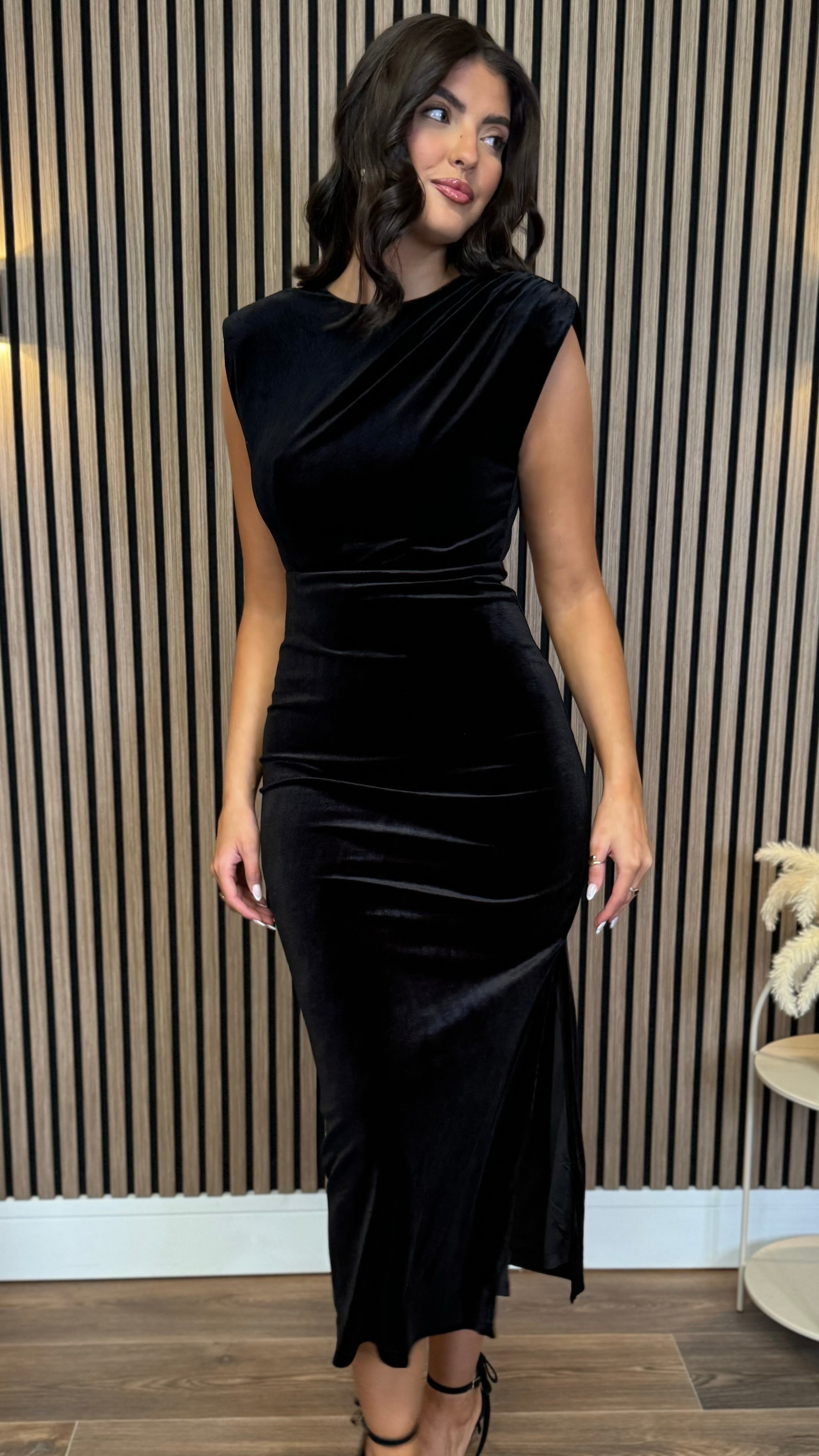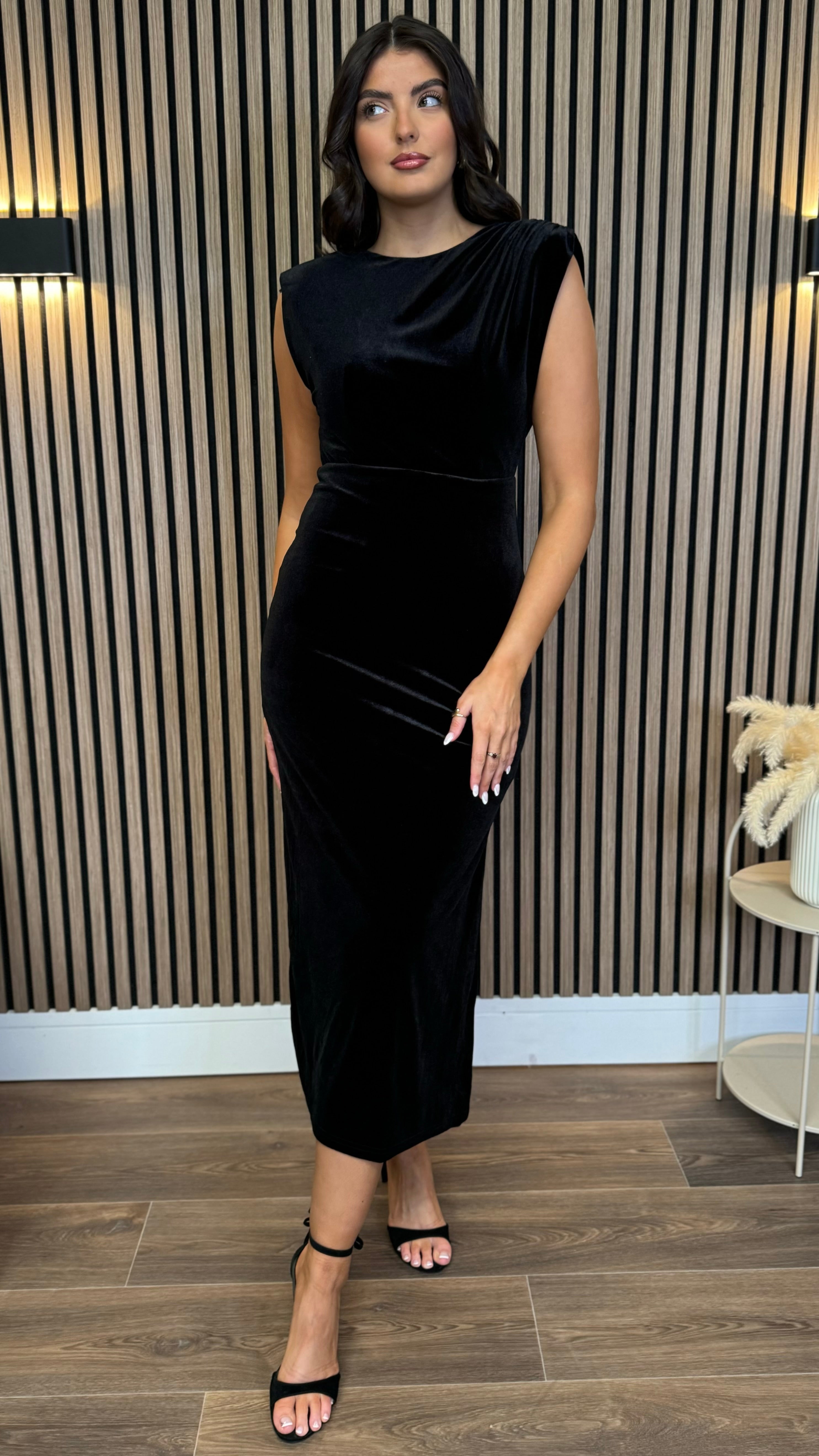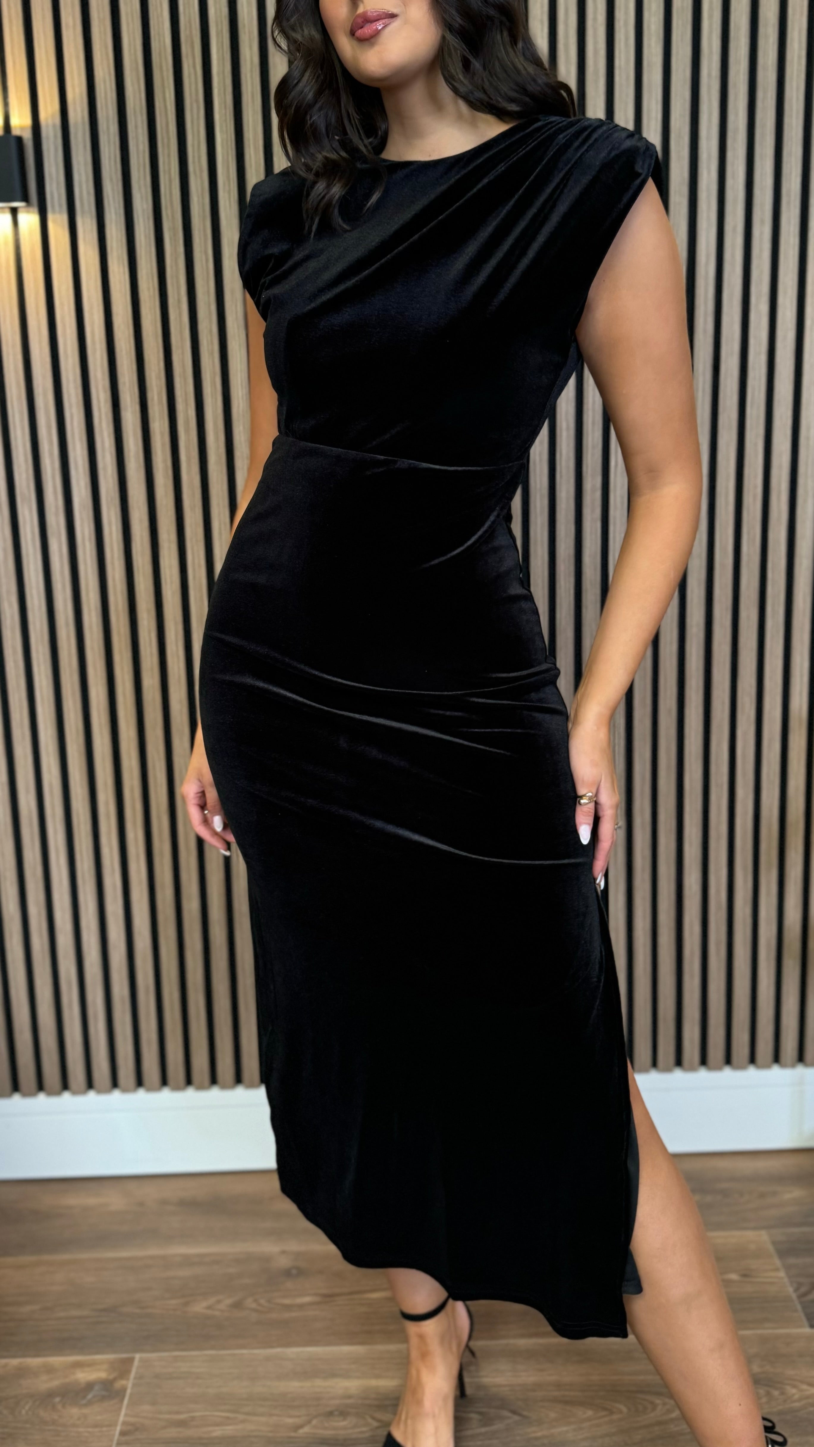 Kimberley Black Velvet Cap Sleeve Ruched Midi Dress