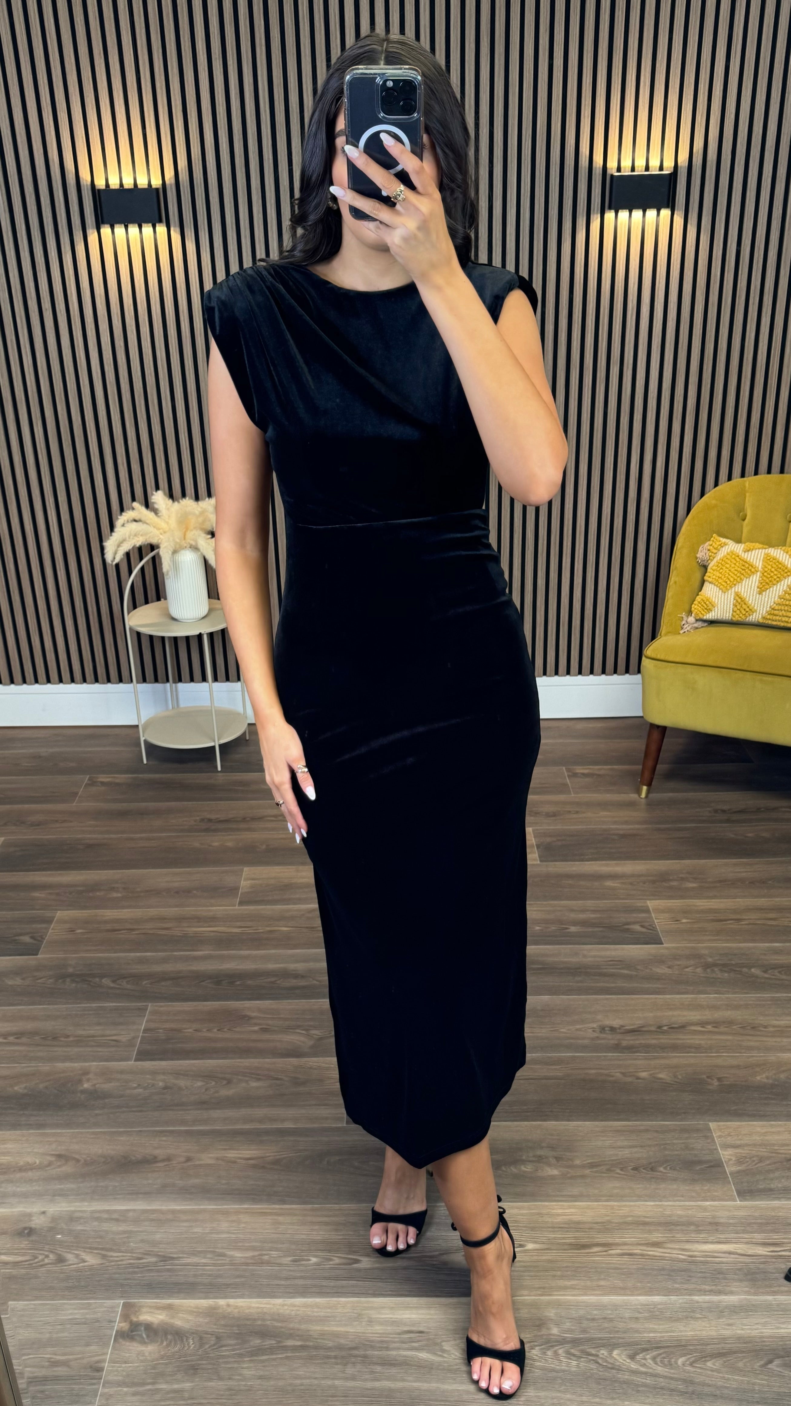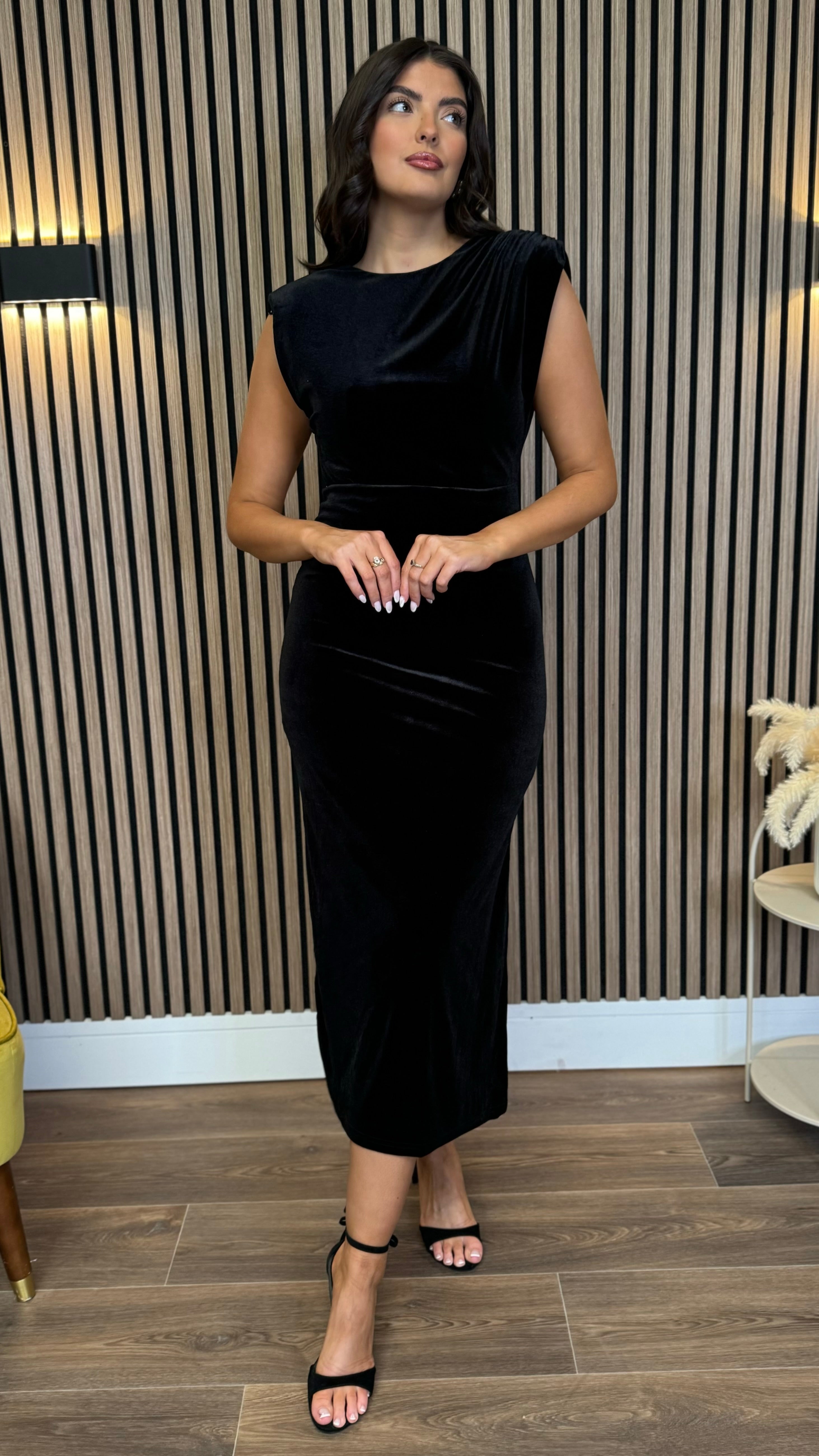 This Kimberley Black Velvet Midi Dress is a playful mix of elegance and comfort. Featuring flirty cap sleeves and a ruched bodice that flatters your figure, it’s finished with an open back for a touch of allure. The elasticated waistband ensures a perfect fit, while the slit at the back adds a dash of drama and ease of movement. Perfect for turning heads at any event!