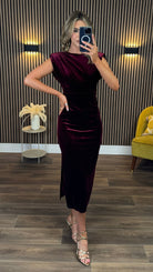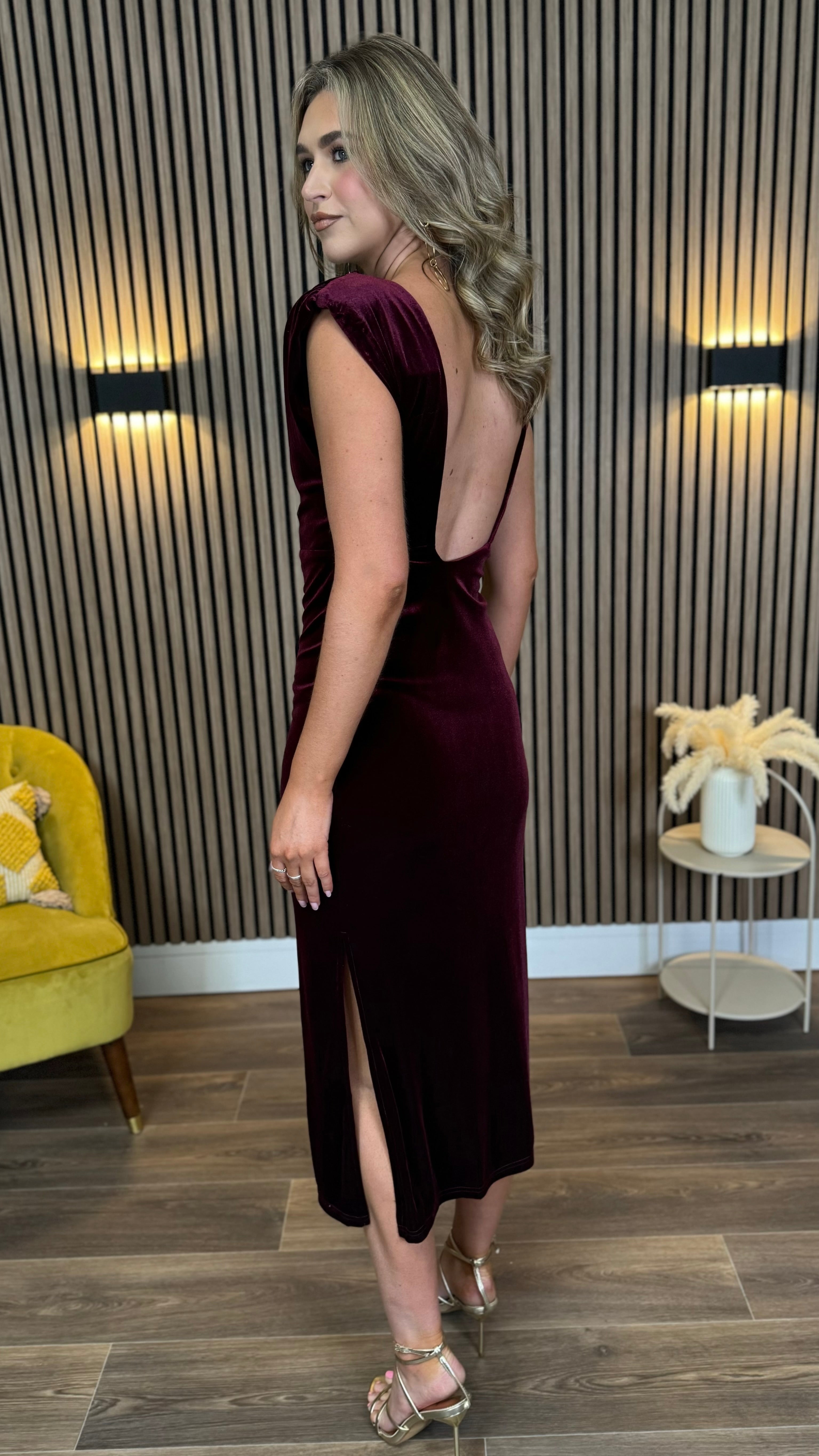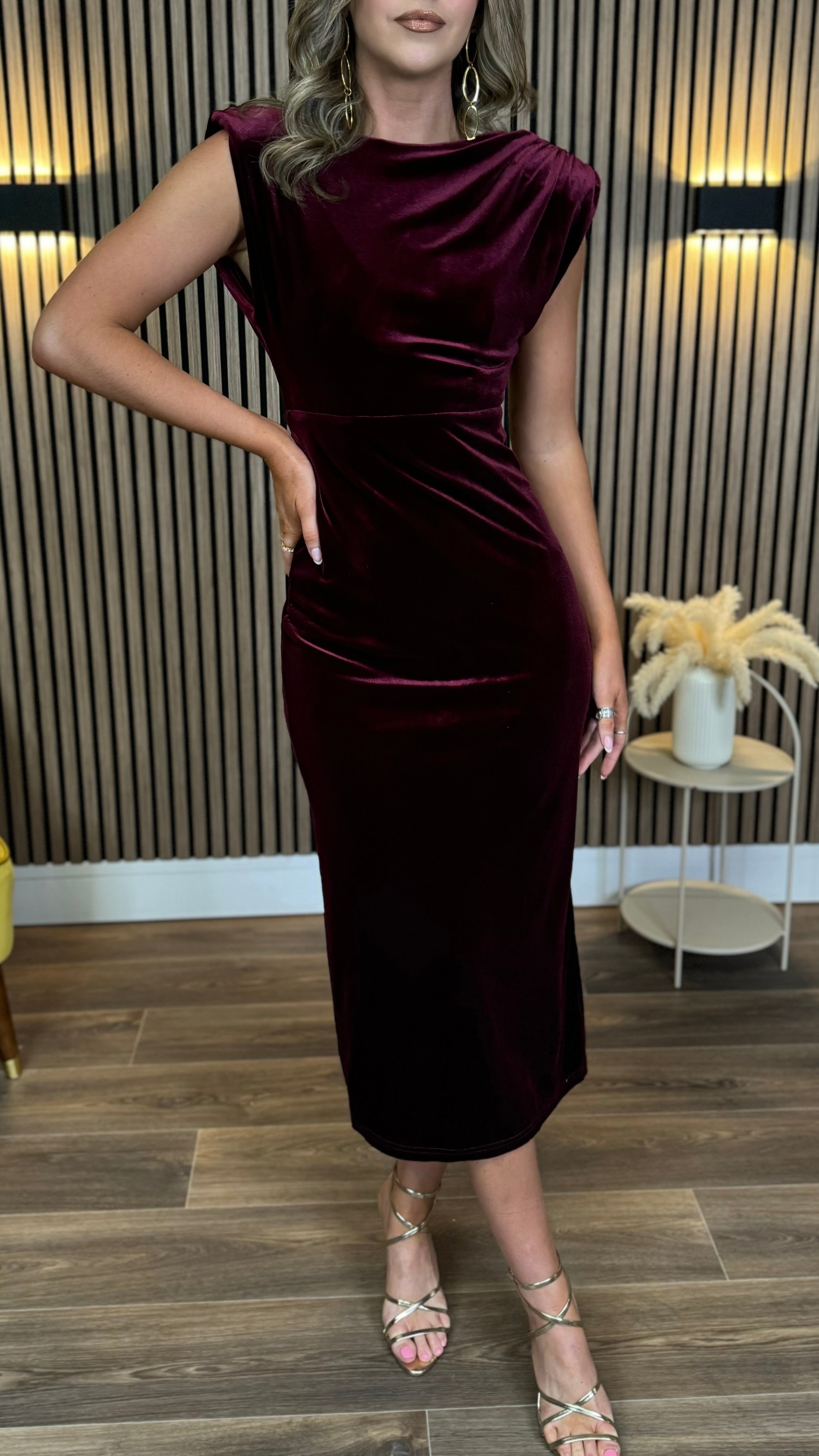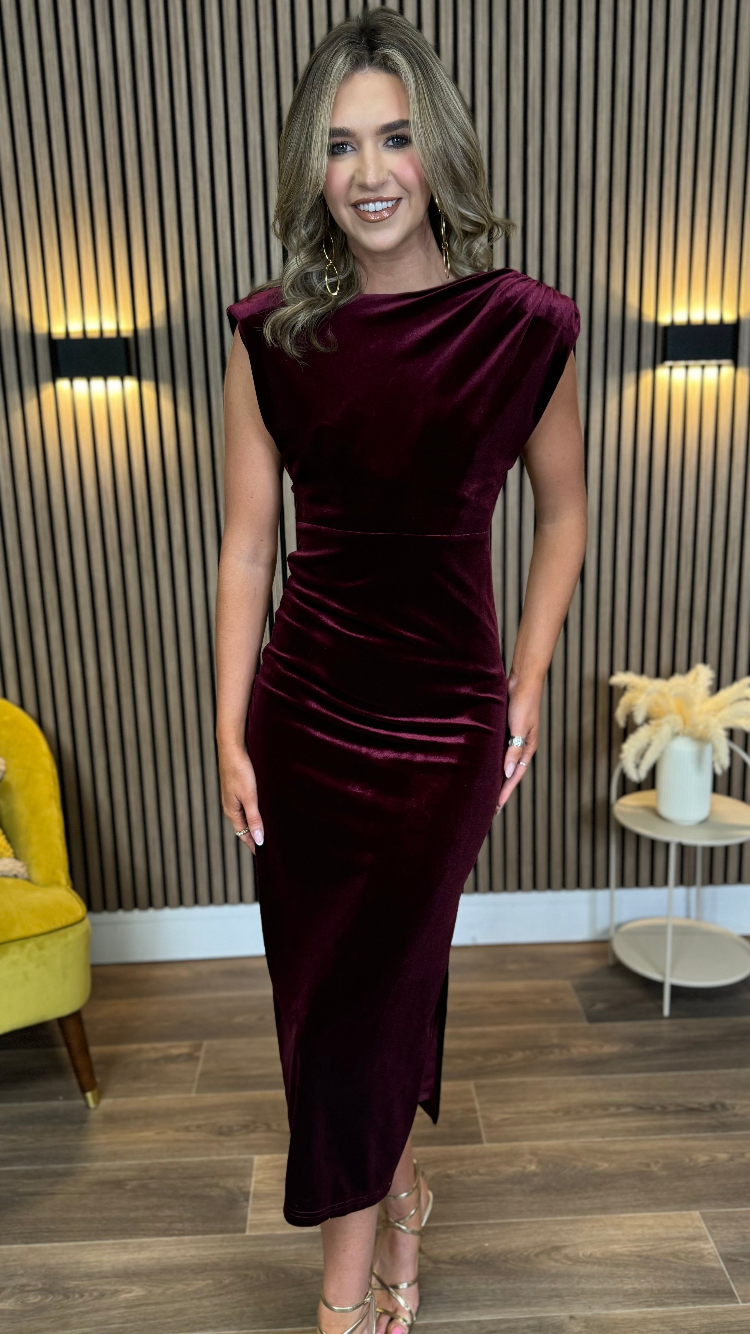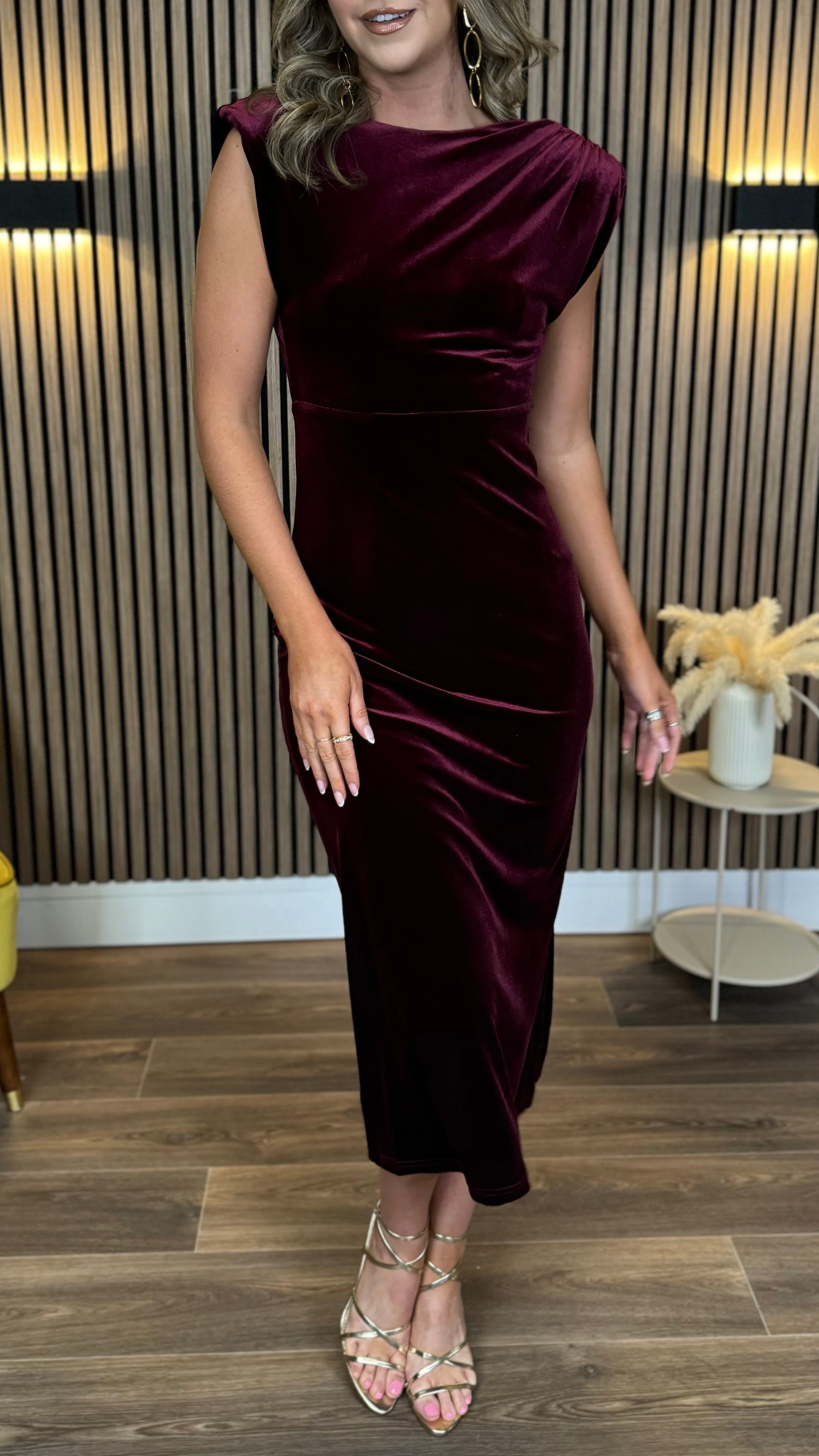 Kimberley Burgundy Velvet Cap Sleeve Ruched Midi Dress