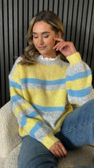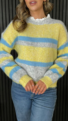 Meet your new go-to jumper! This cosy knit features a cheerful grey, blue, and yellow stripe pattern that's impossible not to love. The delicate lace detail at the neckline adds a touch of elegance, while the soft fabric wraps you in comfort all day long. Perfect for layering or wearing solo, it's the kind of piece that makes getting dressed actually fun. Snuggle up in style!