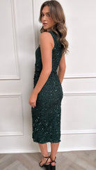 Kona Green Sequin Ruched Side Split Leg Midi Dress