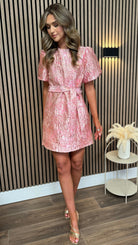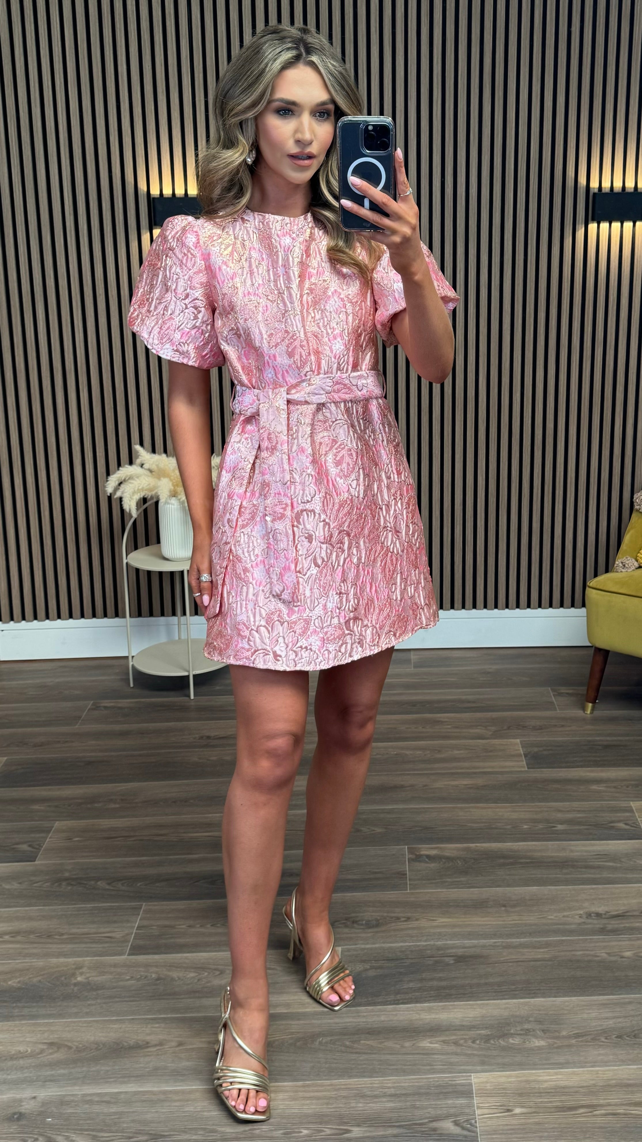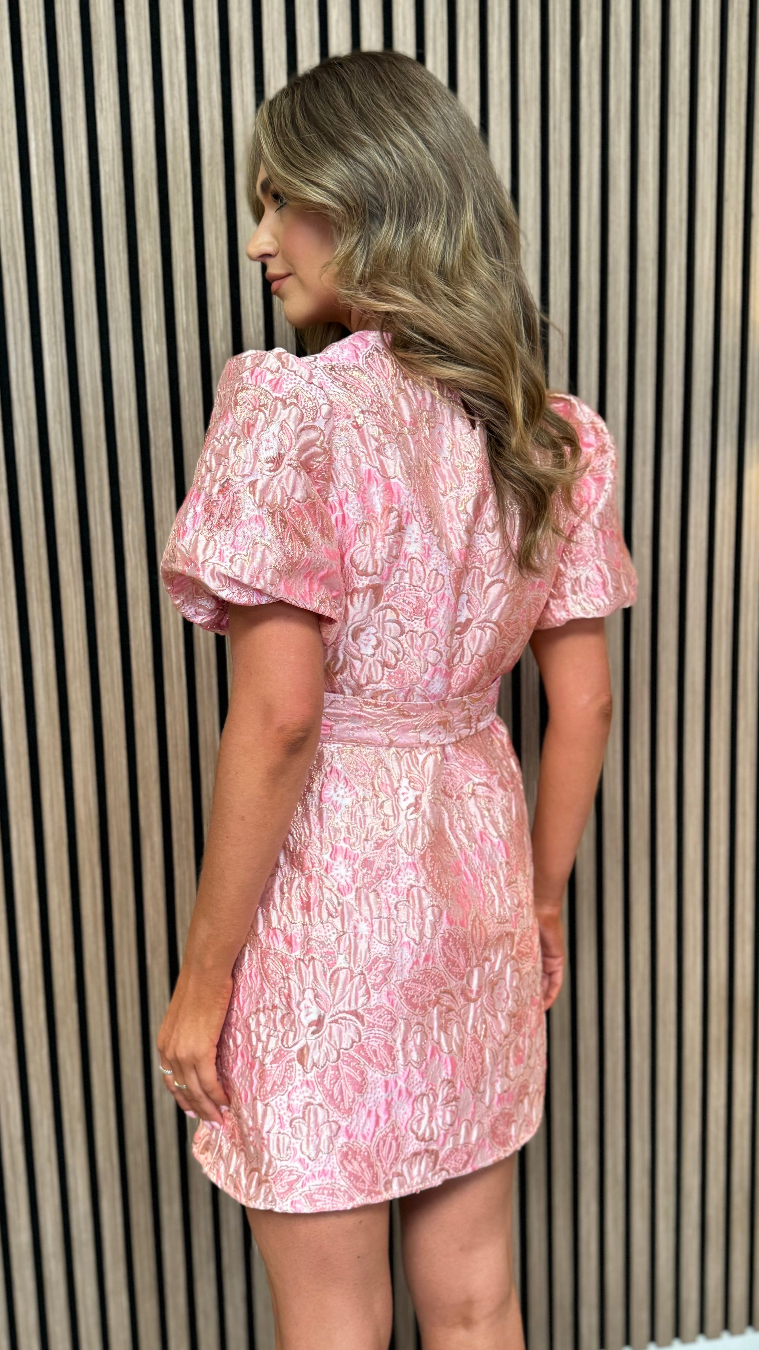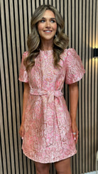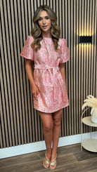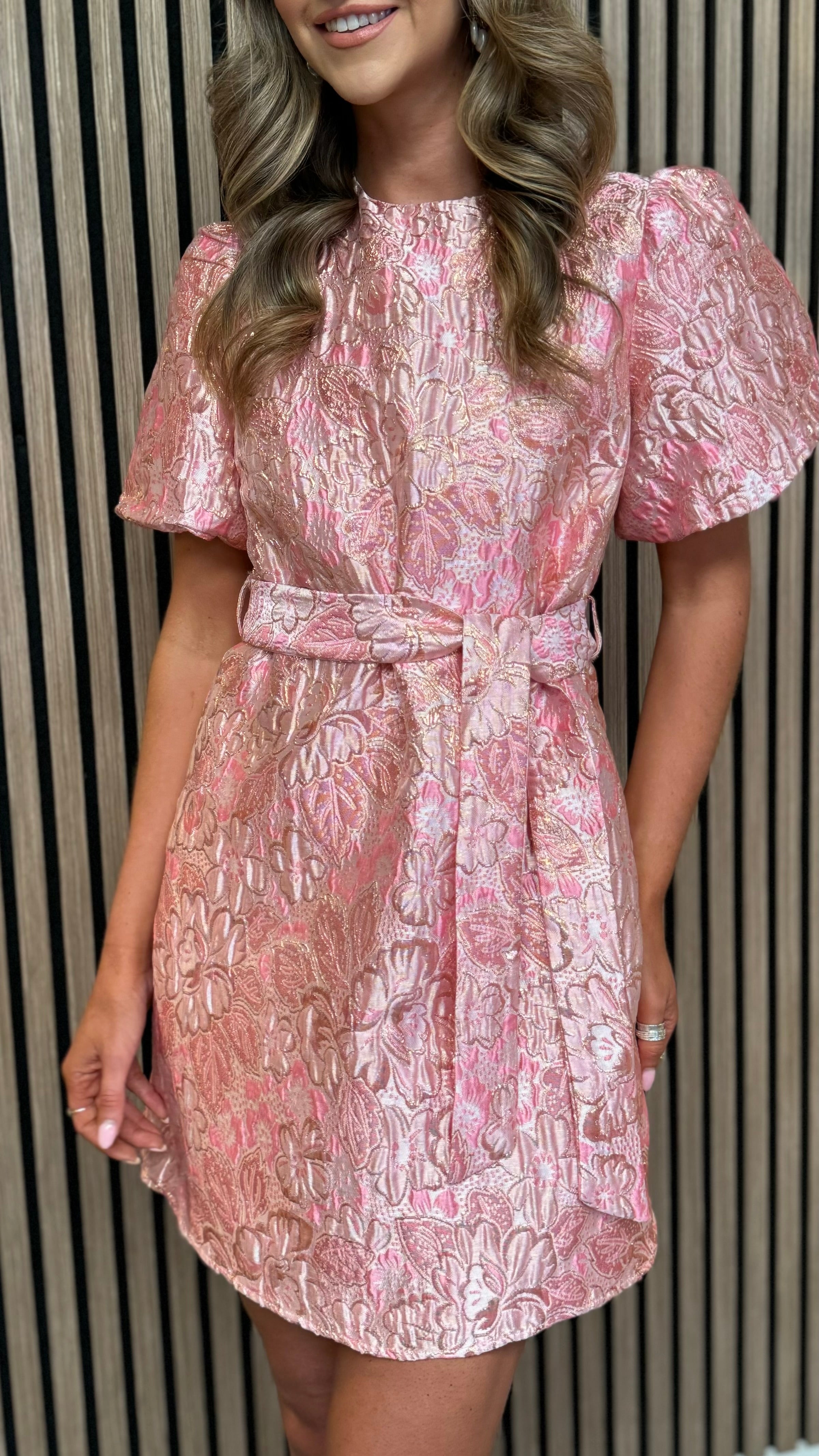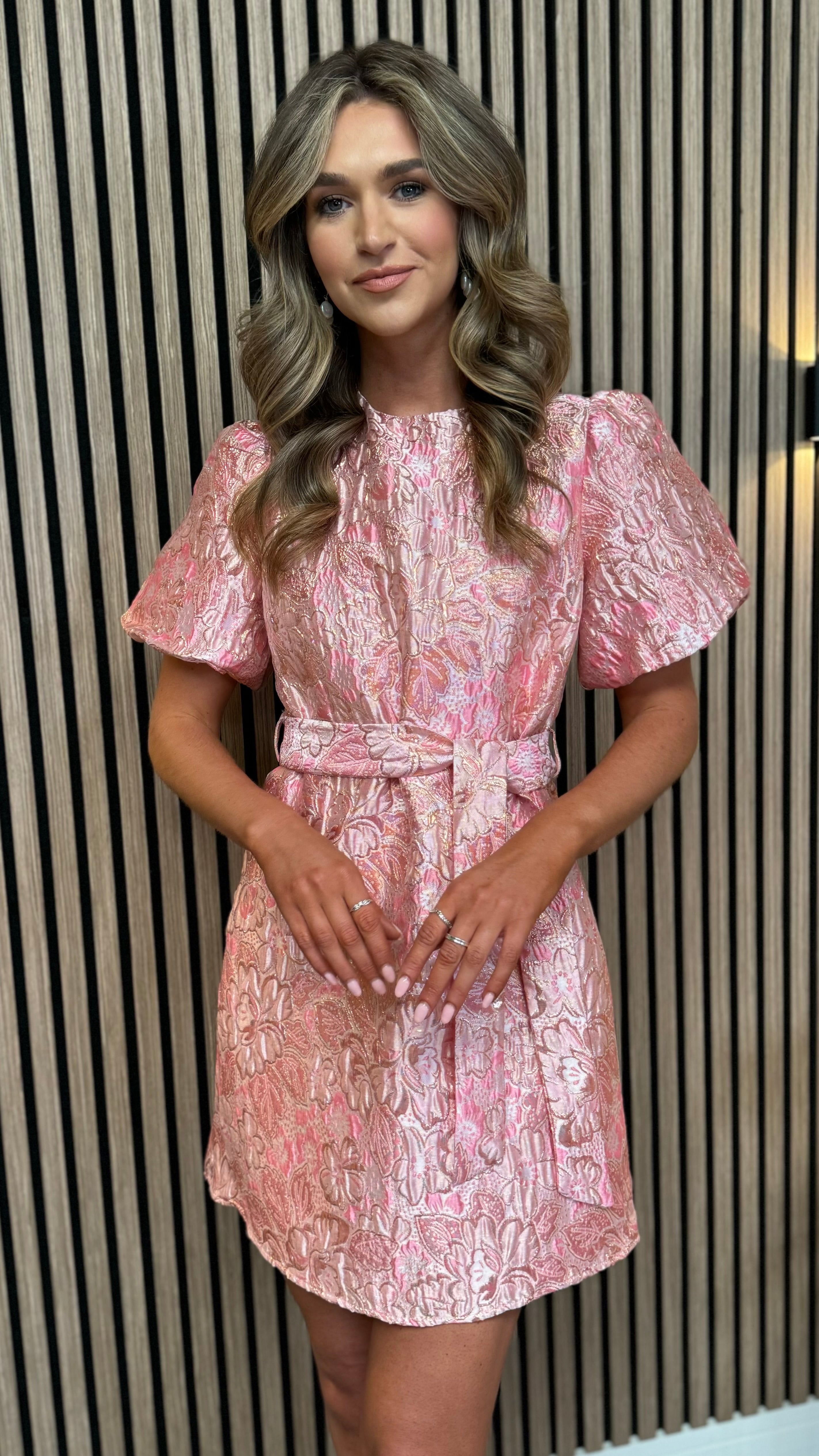 Make a stunning entrance in the Lauren mini dress, where luxurious pink and gold floral patterns create an eye-catching statement. The elegant puff sleeves offer a touch of drama, while the belted waistline defines your silhouette with polished precision. This refined piece transitions effortlessly from cocktail parties to special occasions.🌺