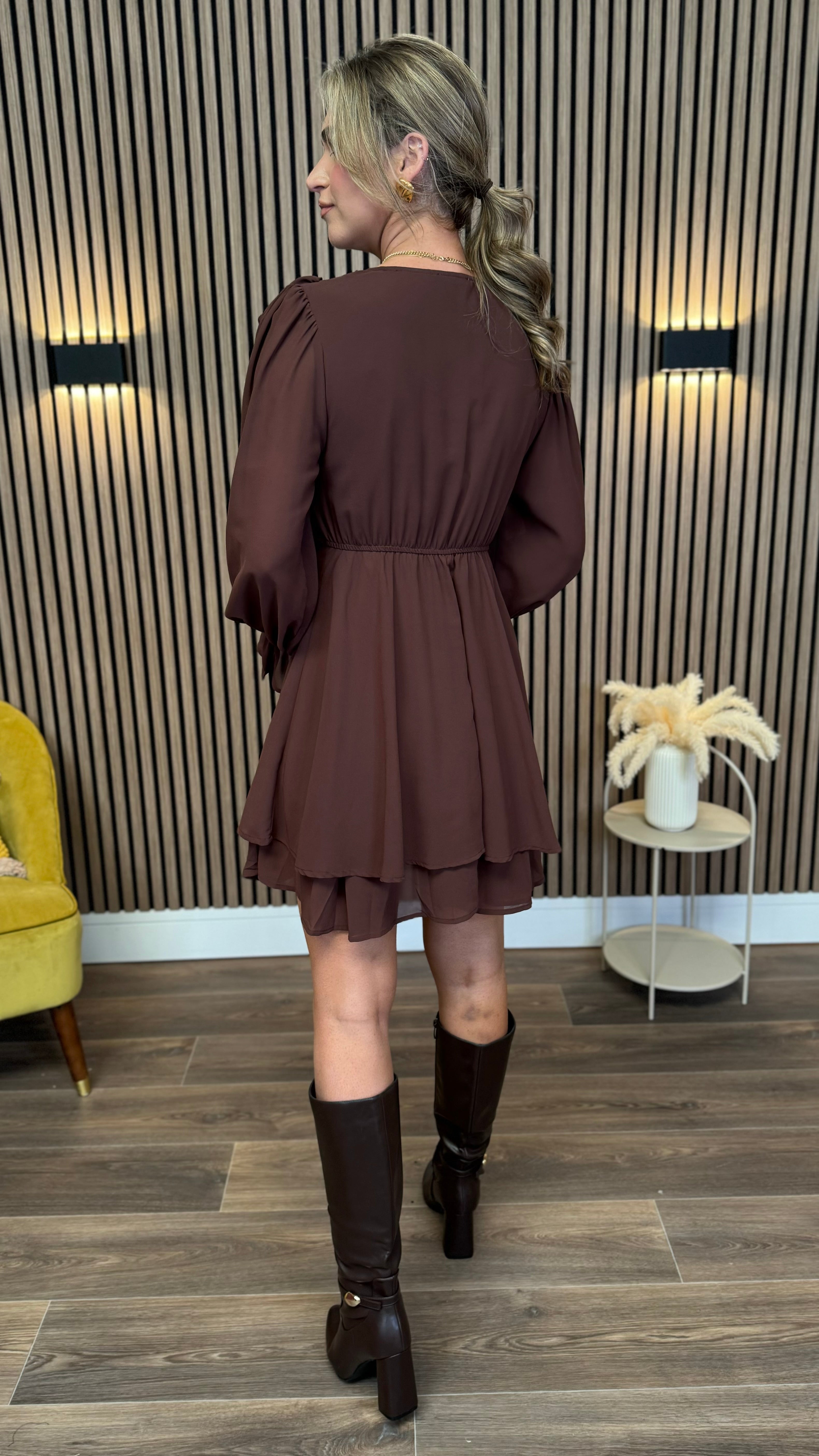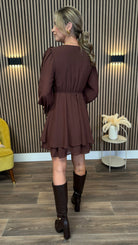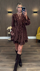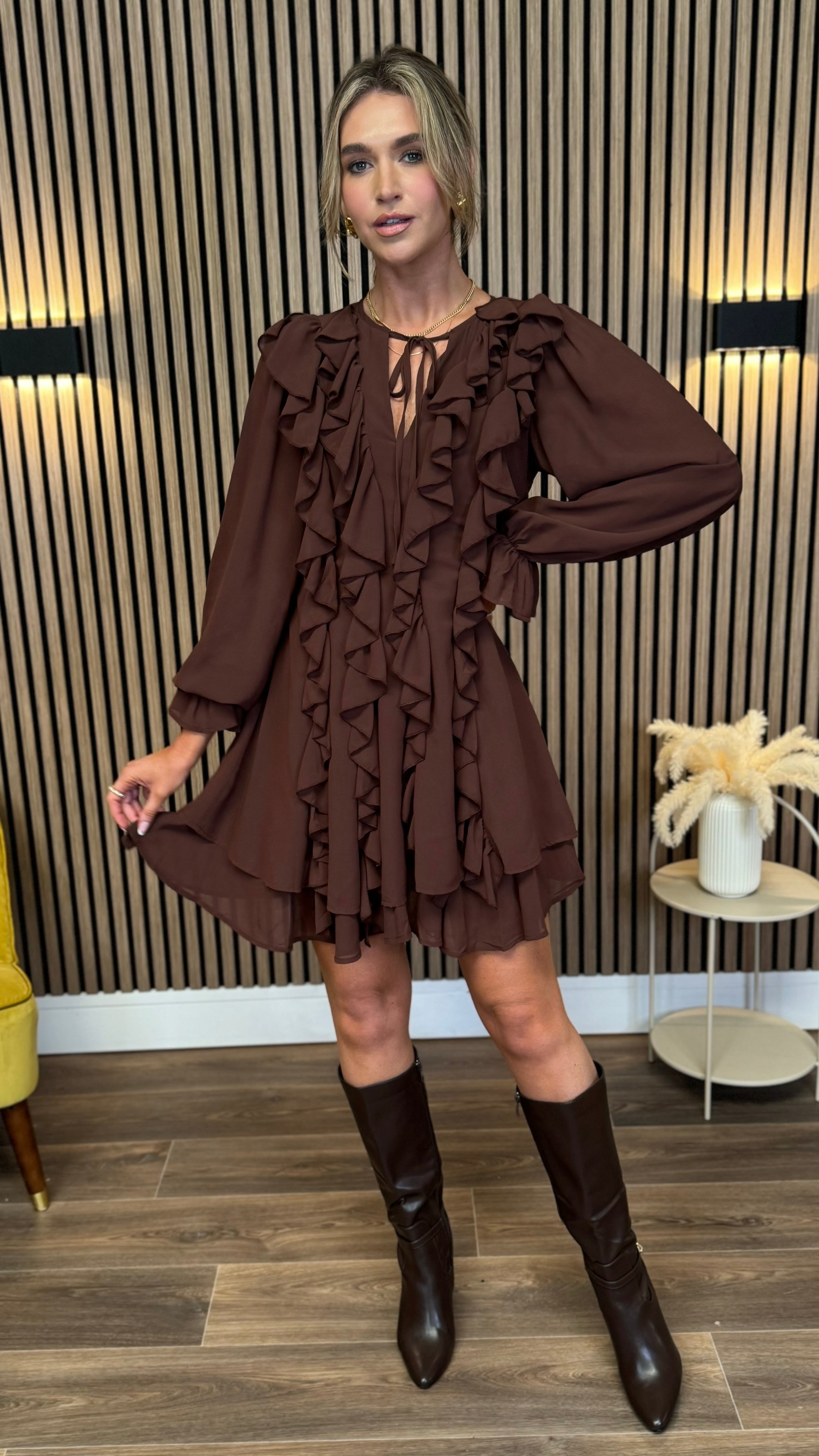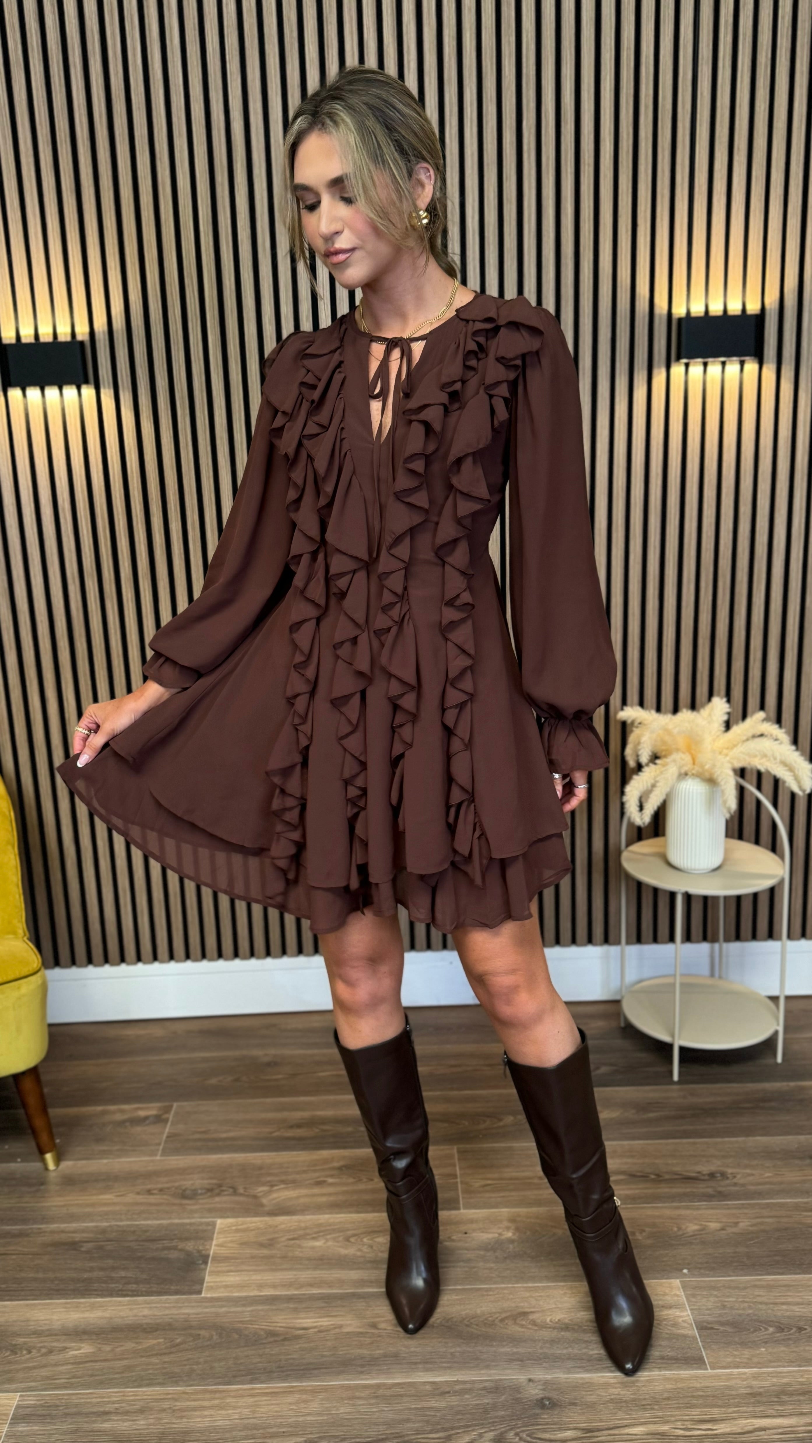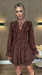 Bring charm to your wardrobe with the Leia Brown Frill Detail Mini Dress. Its playful georgette fabric features delicate frills, a round neck, and a keyhole with a sweet tie detail. Slightly puffed sleeves end in ruffled cuffs with elasticated wristbands for added flair. The fitted waist flatters your figure, while the button and keyhole back fastening add a subtle finishing touch. Perfect for days when you want to feel effortlessly fun and stylish.