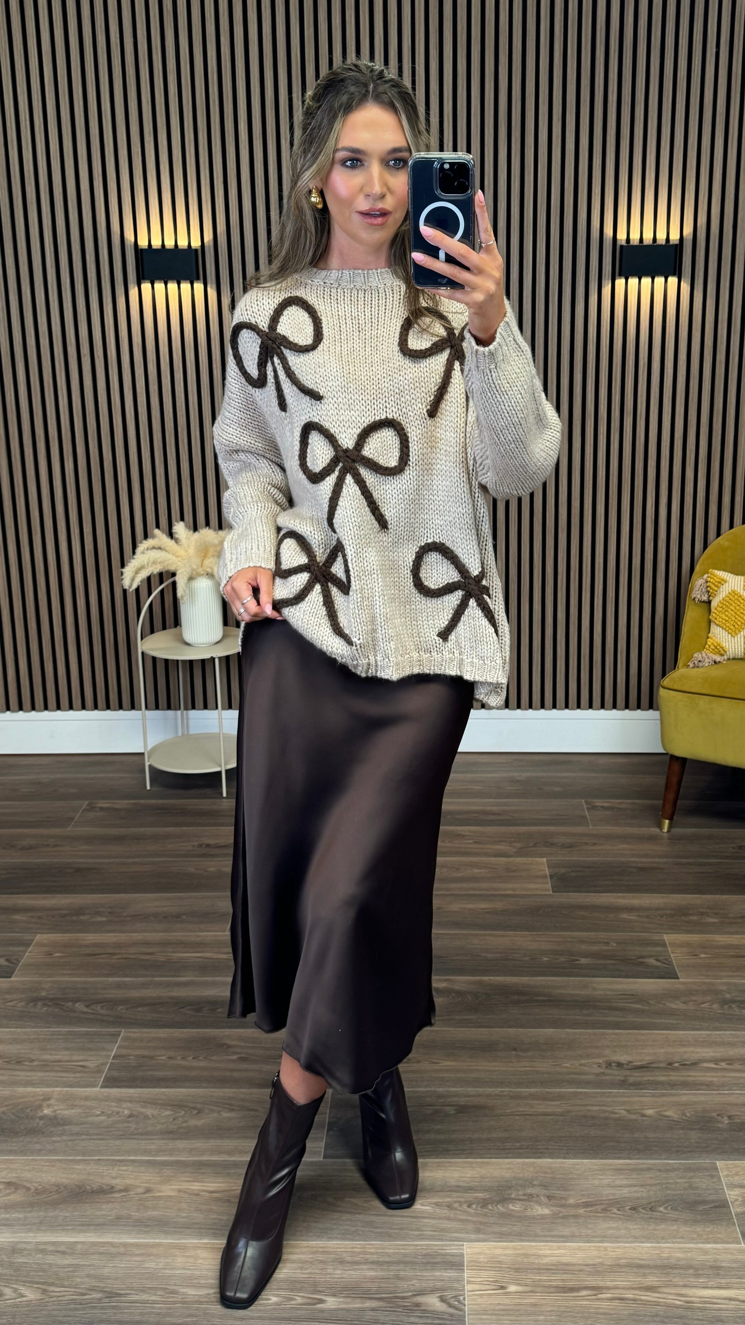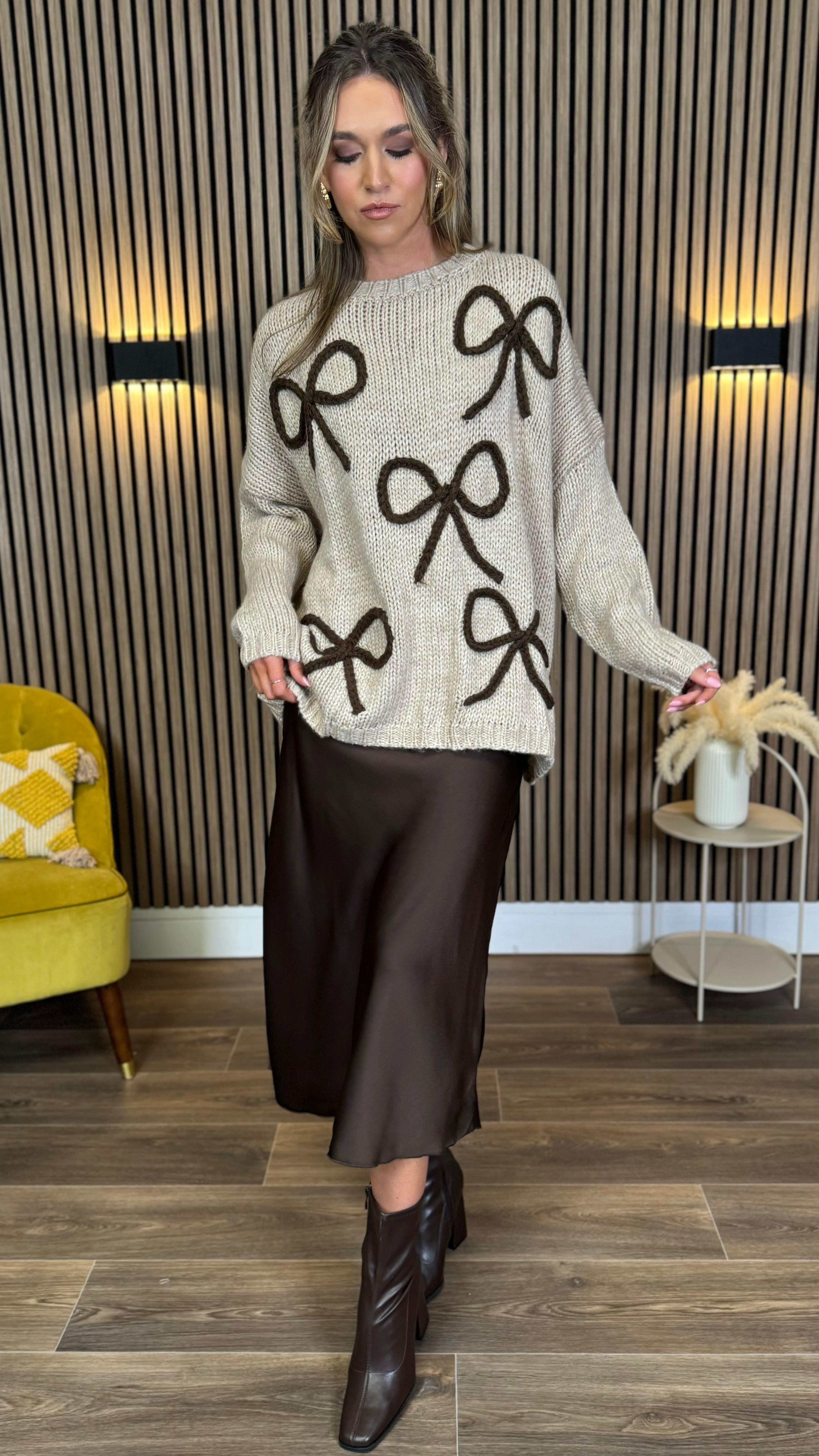 Cozy up in style with the Leigh-Anne Beige & Brown Bow Design Jumper! Featuring a playful oversized fit and chunky knit, this jumper wraps you in warmth and comfort. The round neckline and long sleeves add classic charm, while the standout bow design brings a fun, flirty touch to your look. Perfect for layering or wearing solo on cooler days, it’s your new go-to for effortless, cheerful fashion.
