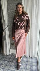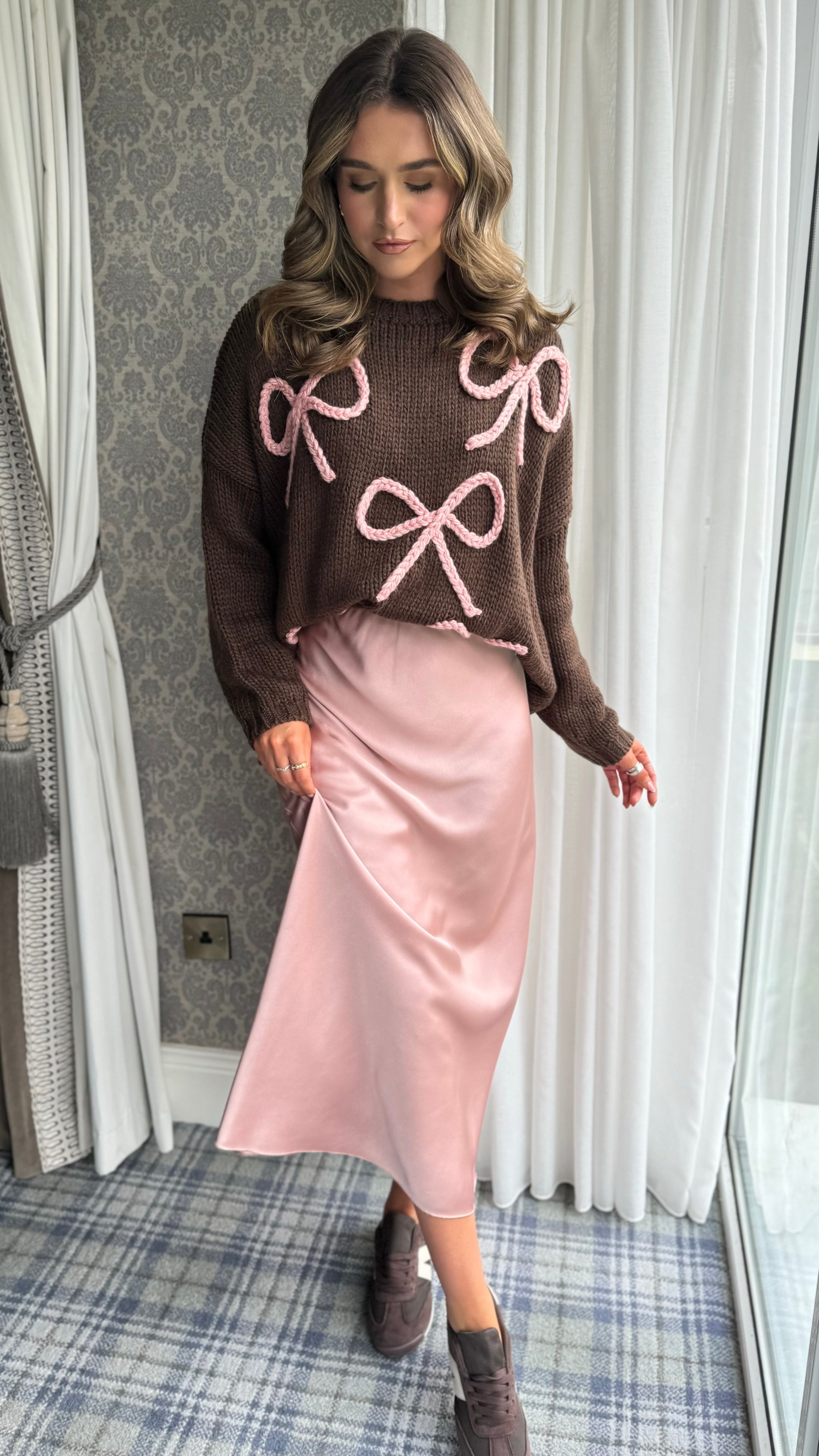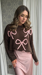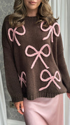 Cozy up in style with the Leigh-Anne Brown & Pink Bow Design Jumper! Featuring a playful oversized fit and chunky knit, this jumper wraps you in warmth and comfort. The round neckline and long sleeves add classic charm, while the standout bow design brings a fun, flirty touch to your look. Perfect for layering or wearing solo on cooler days, it’s your new go-to for effortless, cheerful fashion.