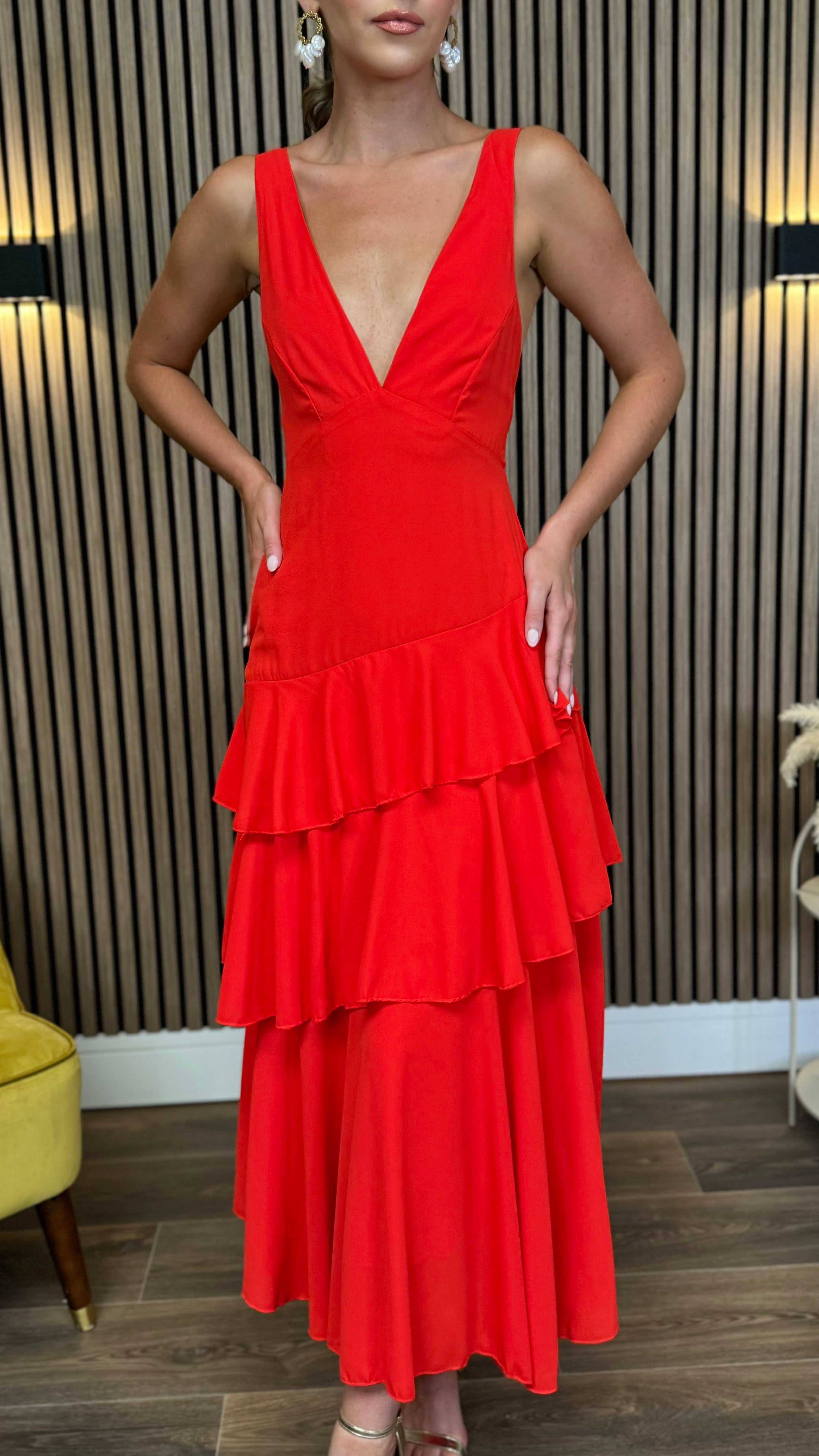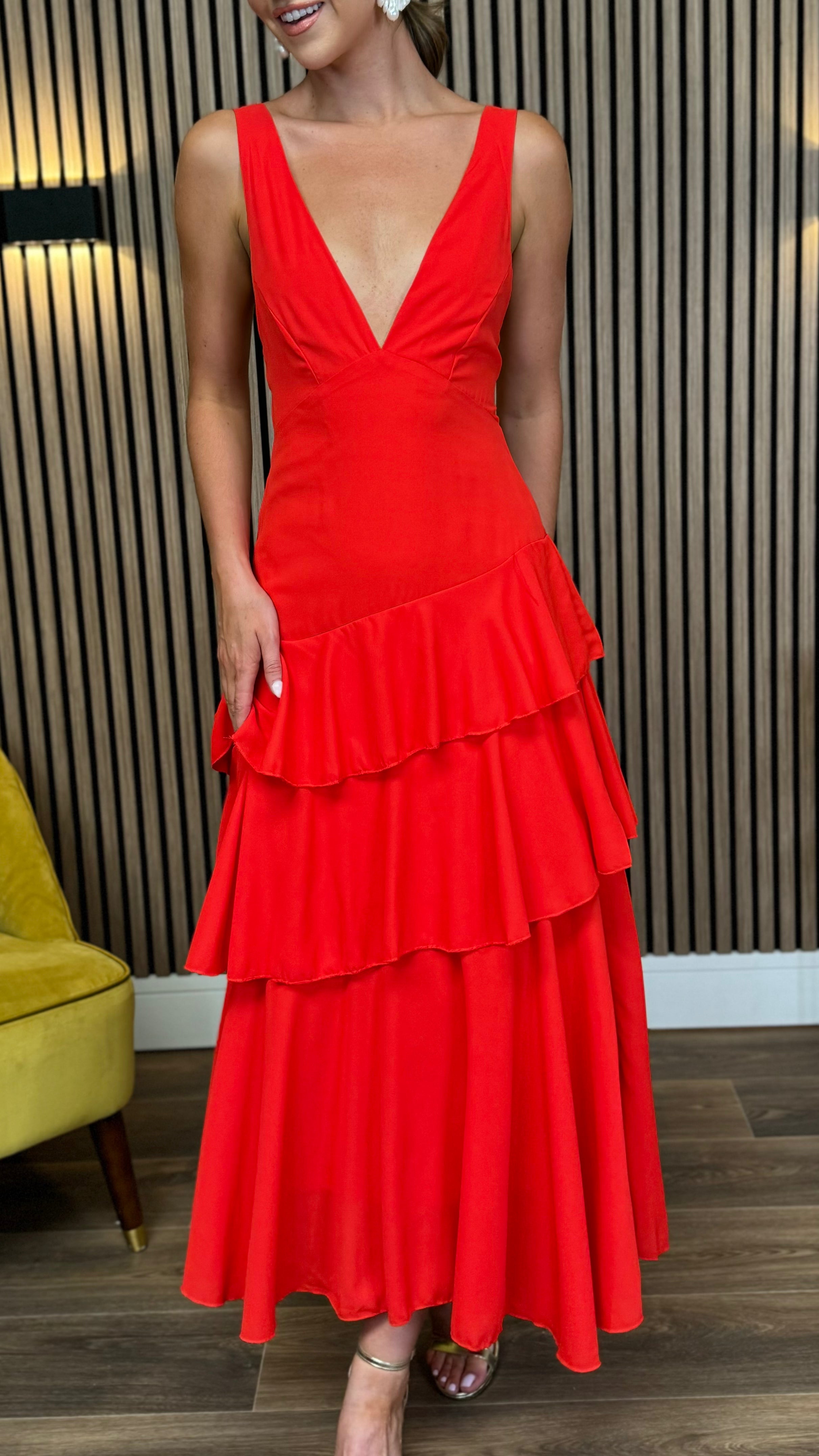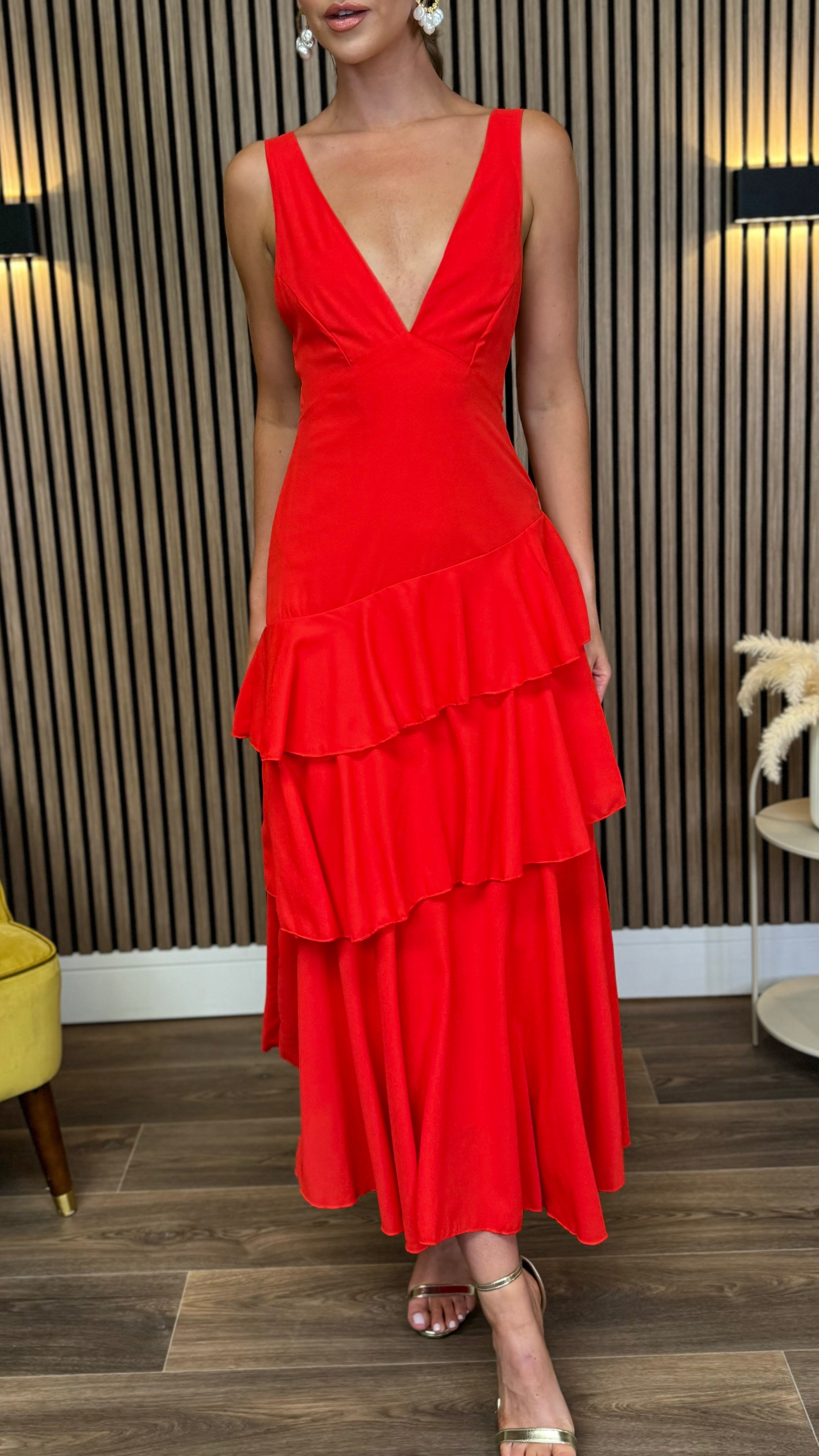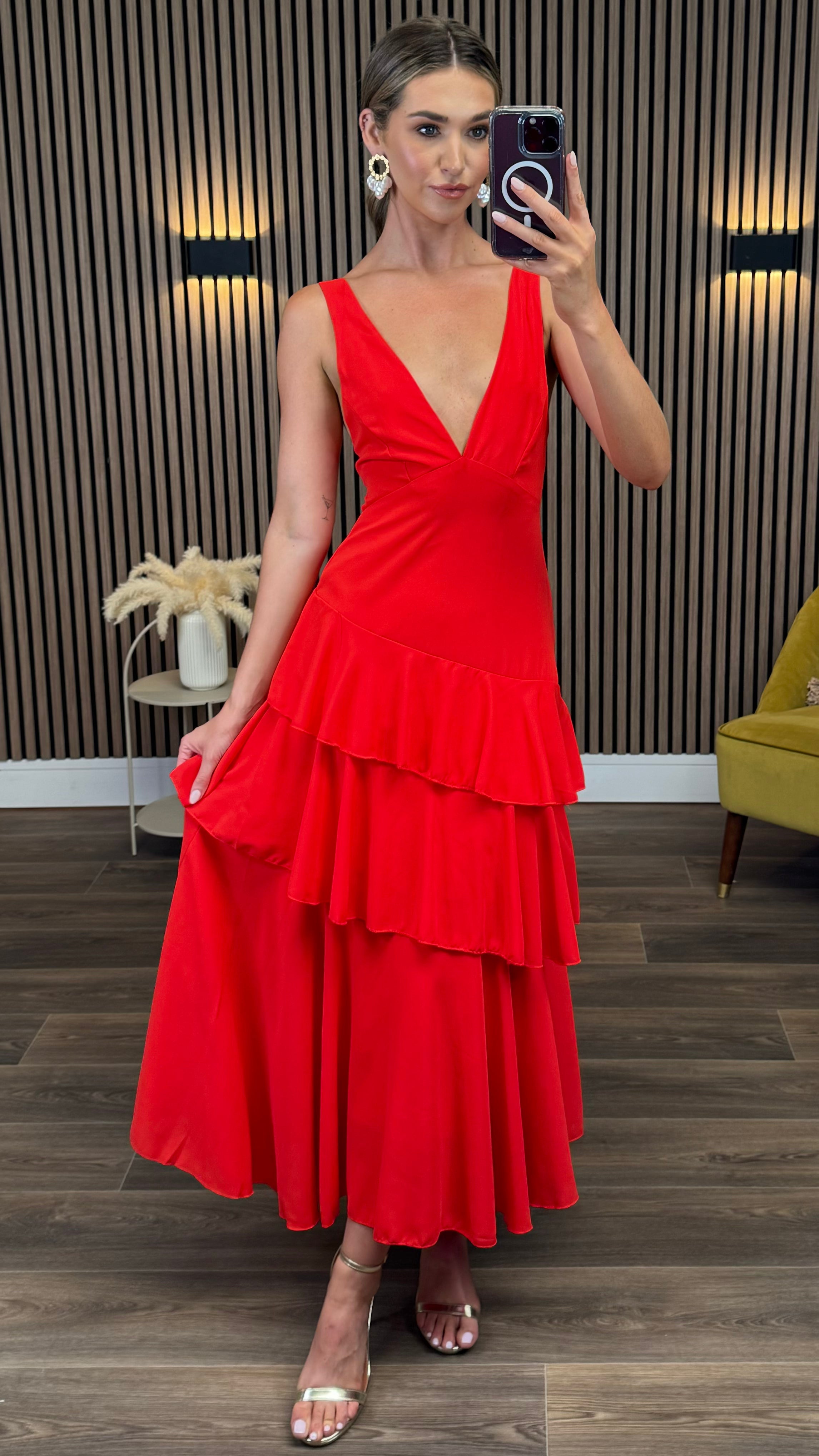 The Lena Red V Neck Midi Dress exudes sophistication with its tiered detailing and backless design, complemented by delicate tie accents. This elegant silhouette enhances your natural shape, making it an exquisite choice for refined evenings and special occasions. 🔥✨