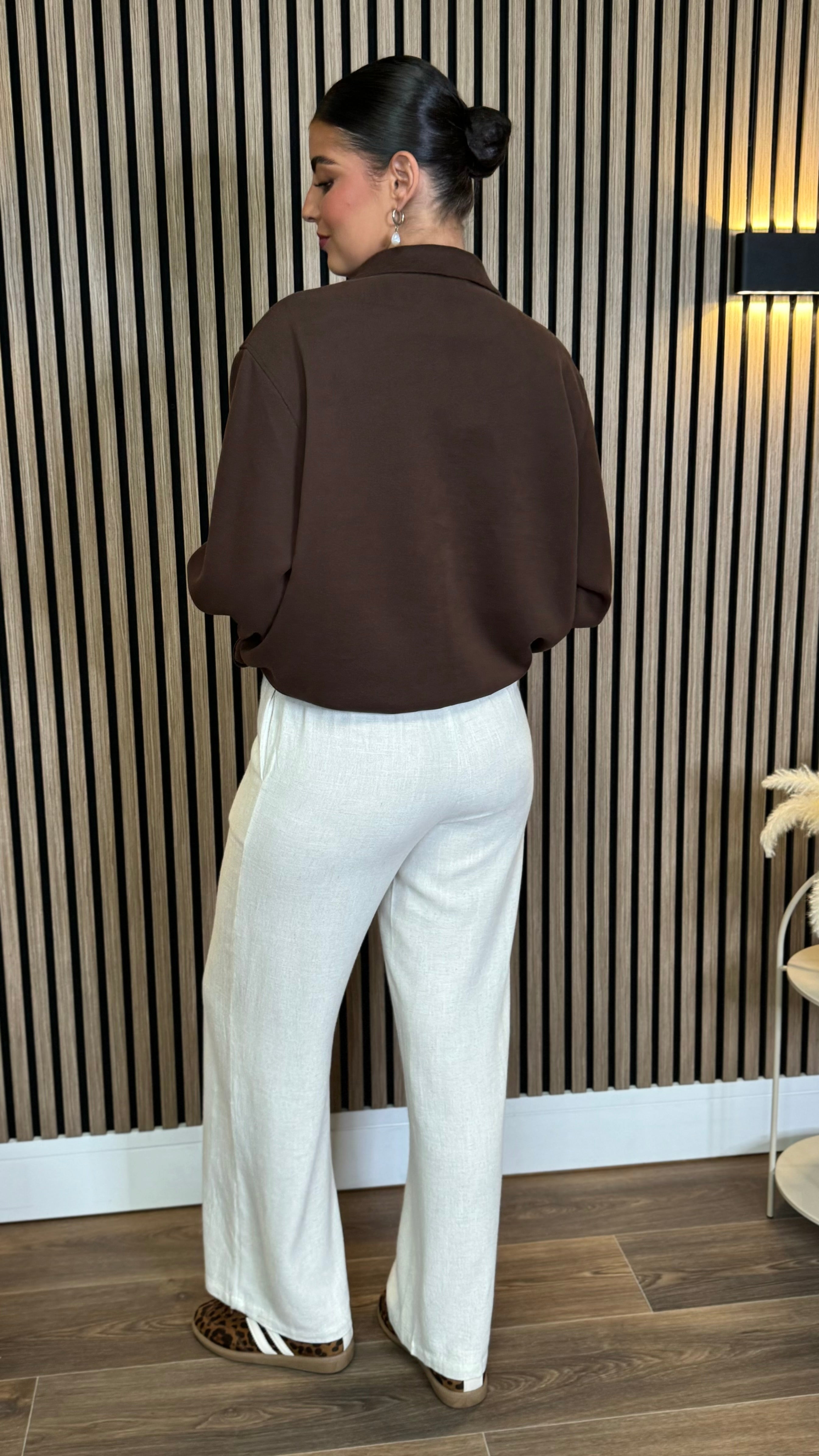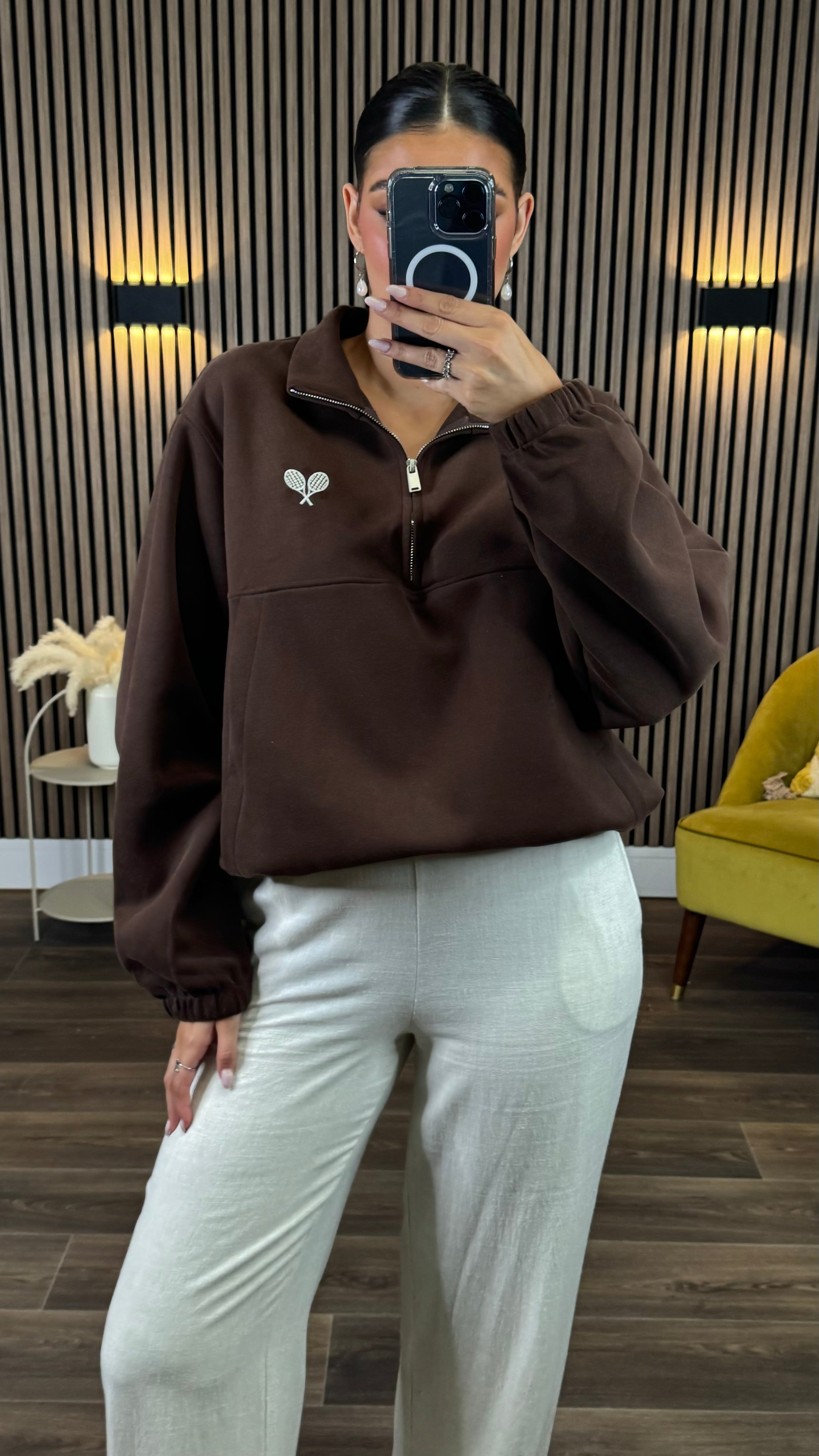 Serve up style and comfort with the Lina Brown Tennis Detail 1/4 Zip Top! This playful piece adds a sporty twist to your wardrobe, perfect for warming up or cooling down on the court. Its sleek 1/4 zip design lets you adjust your look and ventilation with ease, while the tennis-inspired details bring a fun, energetic vibe to your game day or casual outings. Get ready to ace your style!