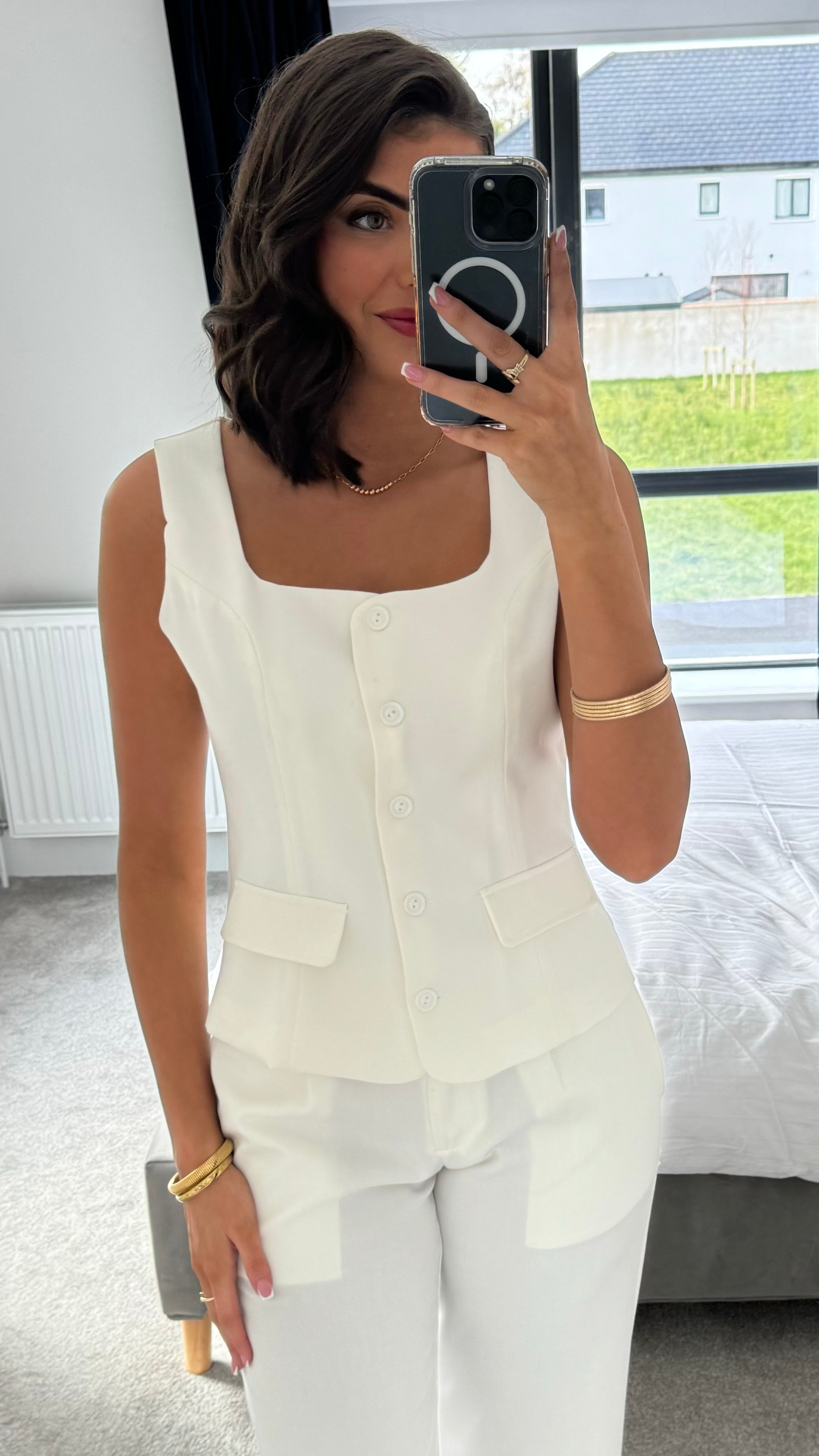 Get ready to rock that square neckline with the Lorraine White Waistcoat! This playful and stylish waistcoat features faux pockets and a button down design that will have you turning heads. Perfect for any occasion, this waistcoat adds a touch of quirky style to any outfit.
