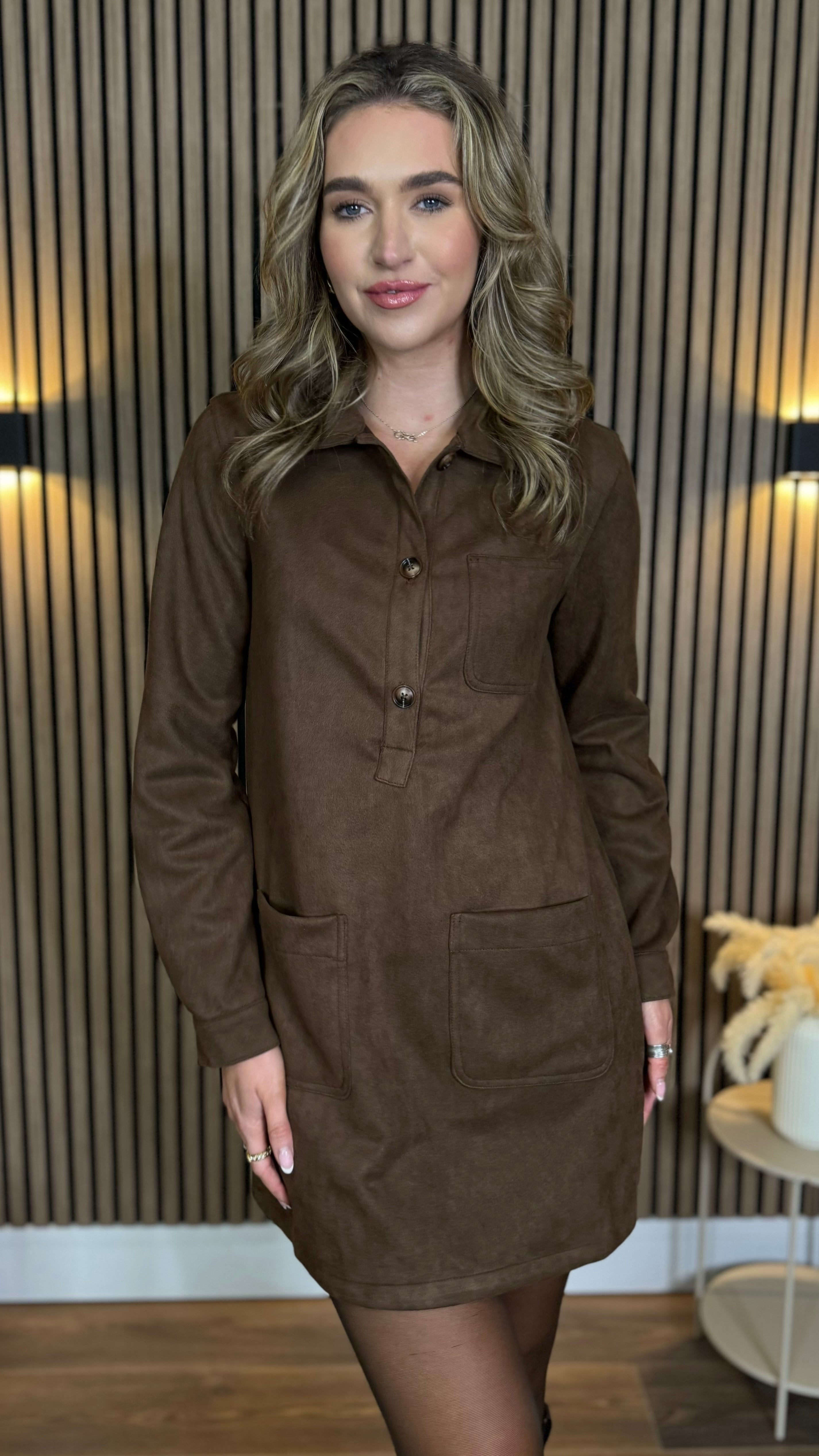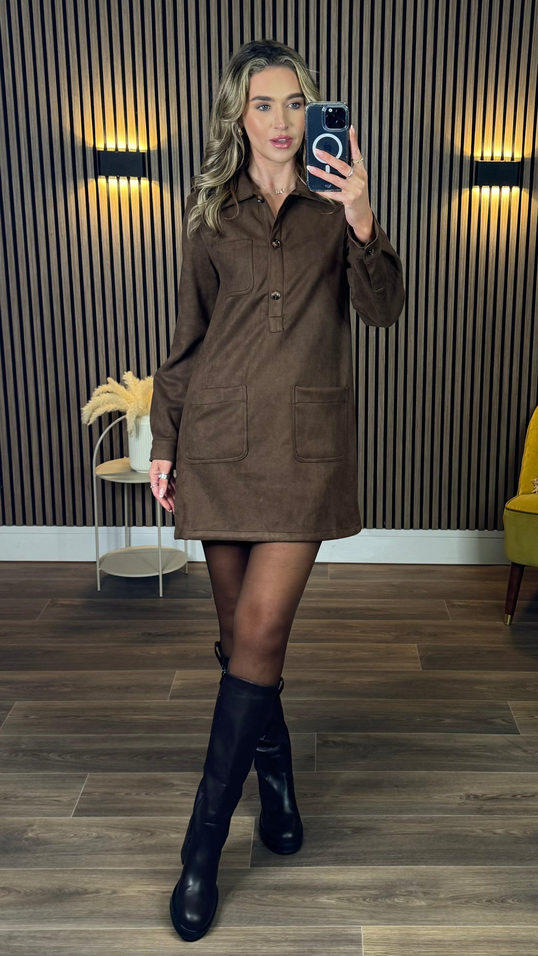 This Lotus Brown Suede Utility Style Mini Dress is all about fun details that make a statement. Featuring a chic collar and button accents, it combines style with function through practical front pockets. The long sleeves end in button cuffs for a tailored finish, while the mini length keeps the look flirty and fresh. Perfect for days when you want to mix utility with playful charm!