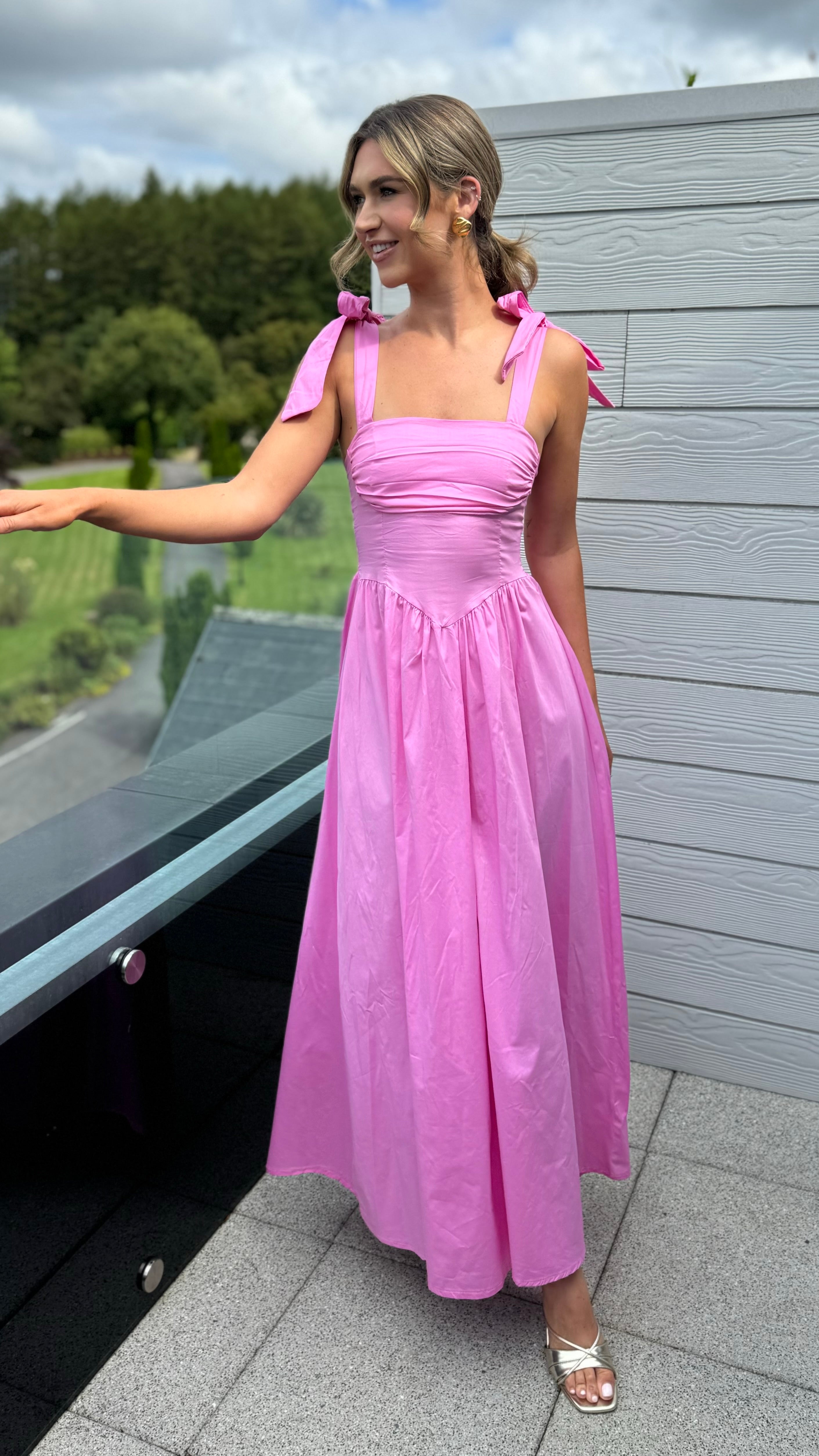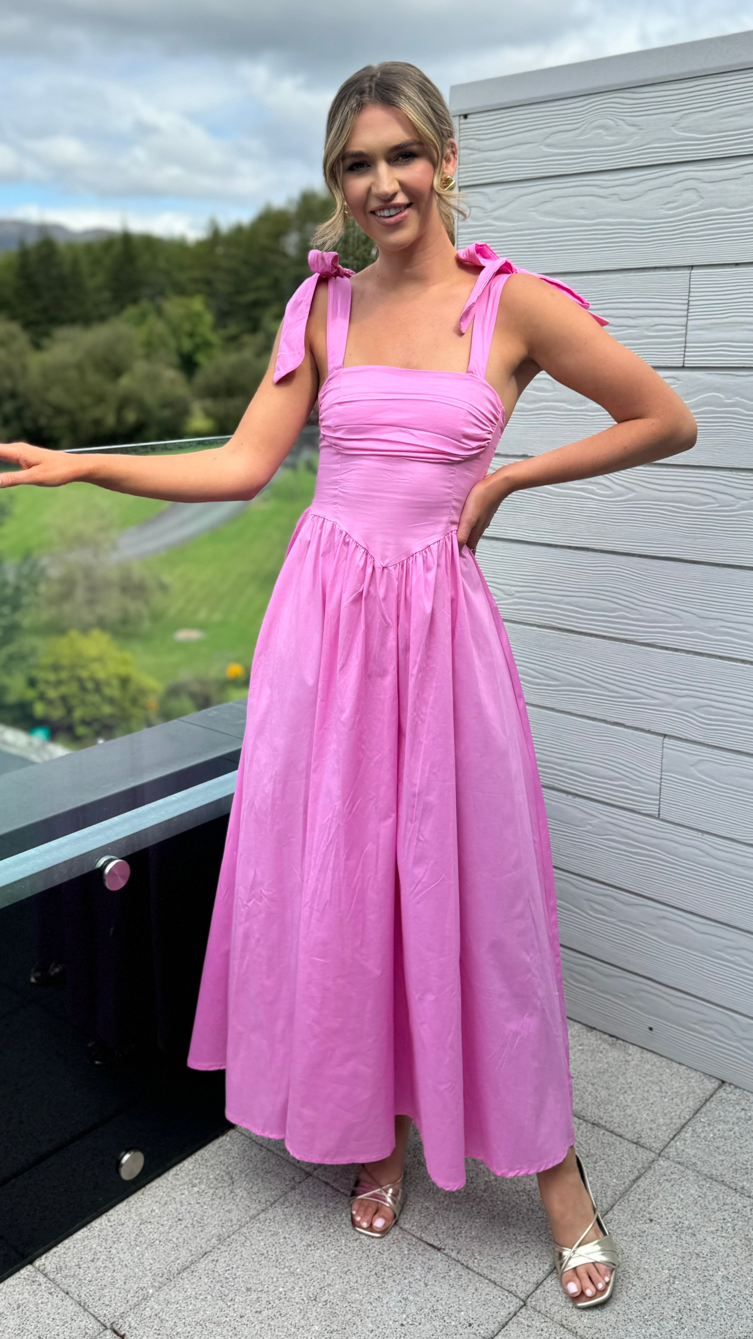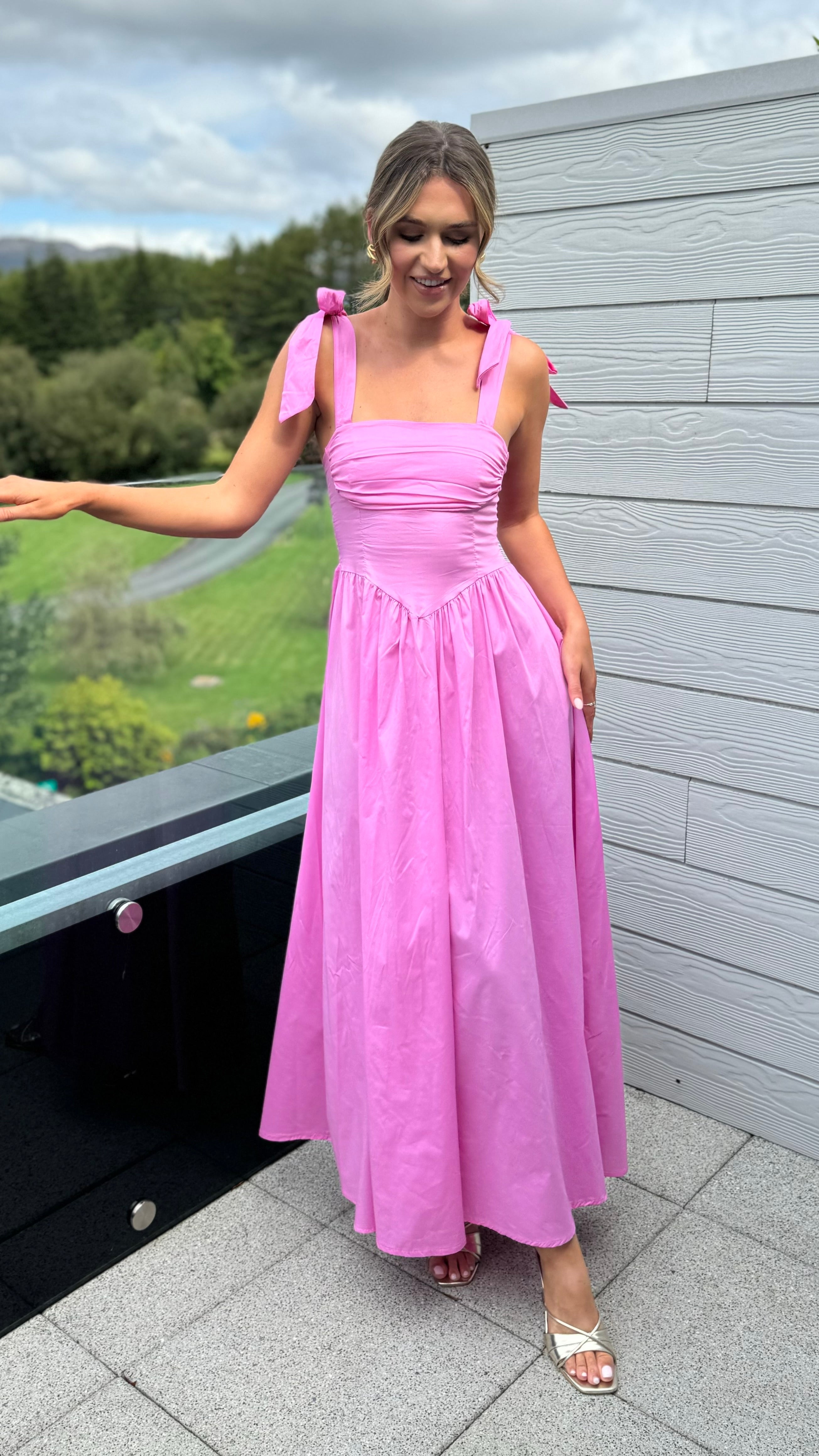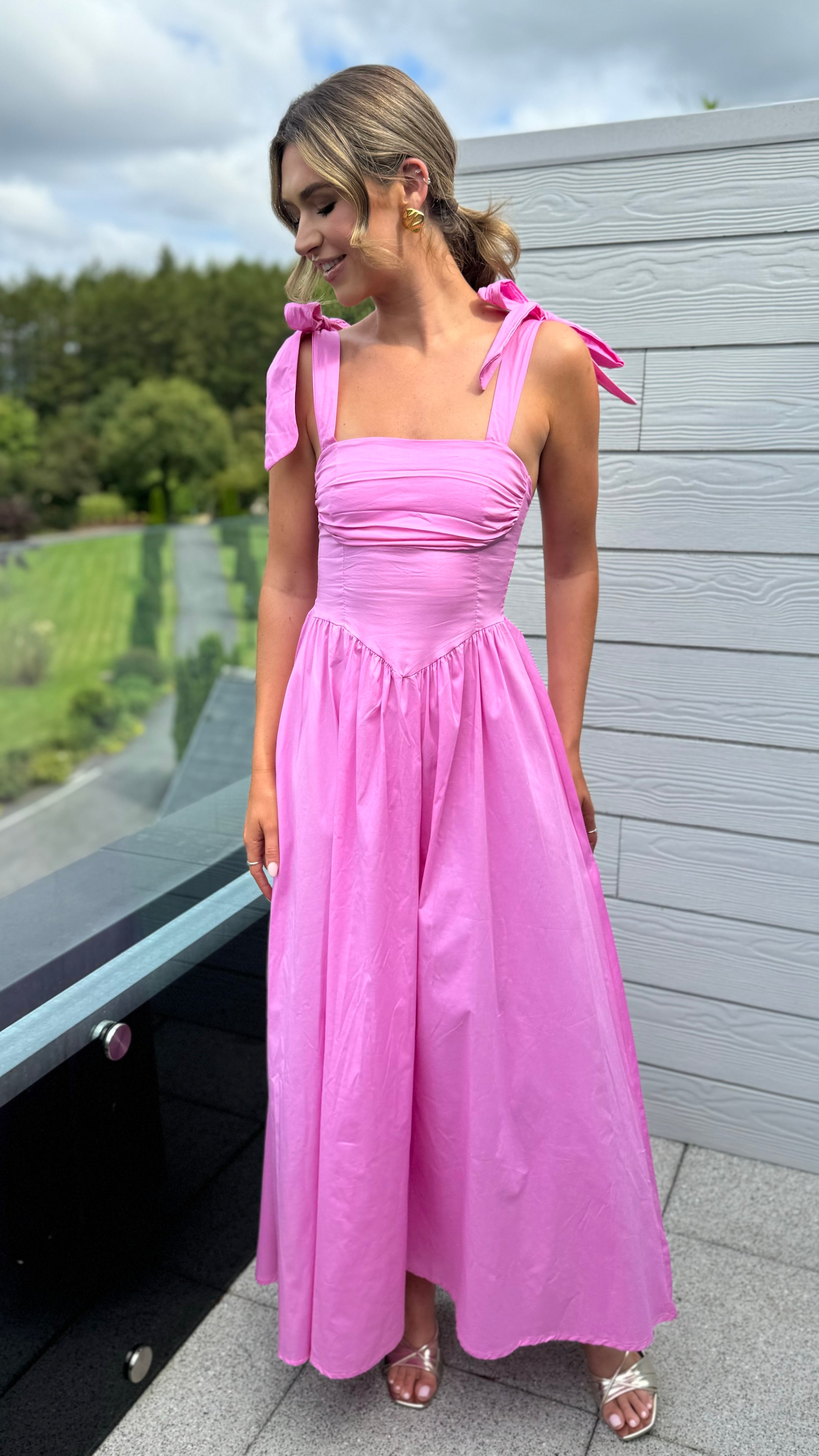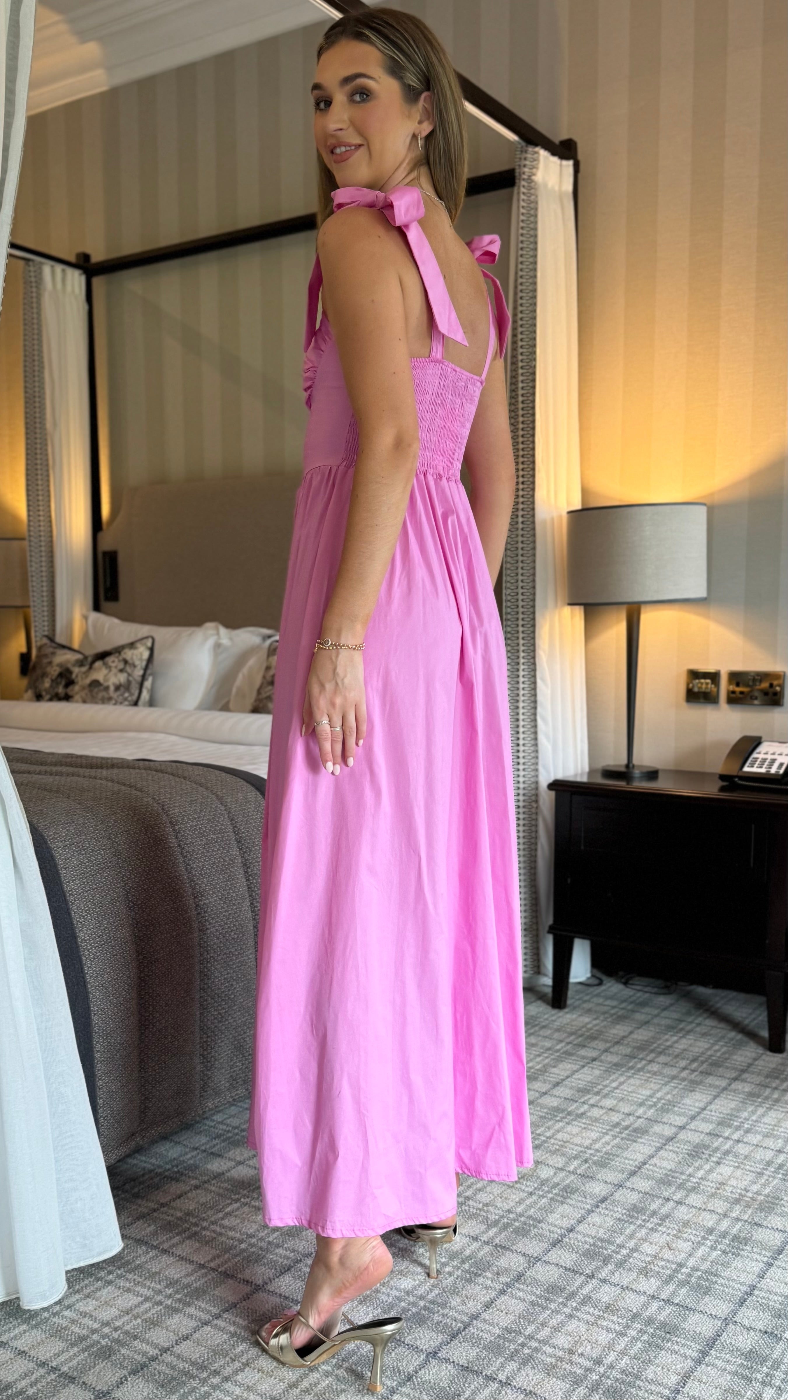 Luellen Pink Tie Shoulder Straps Ruched Bust Detail Midaxi Dress