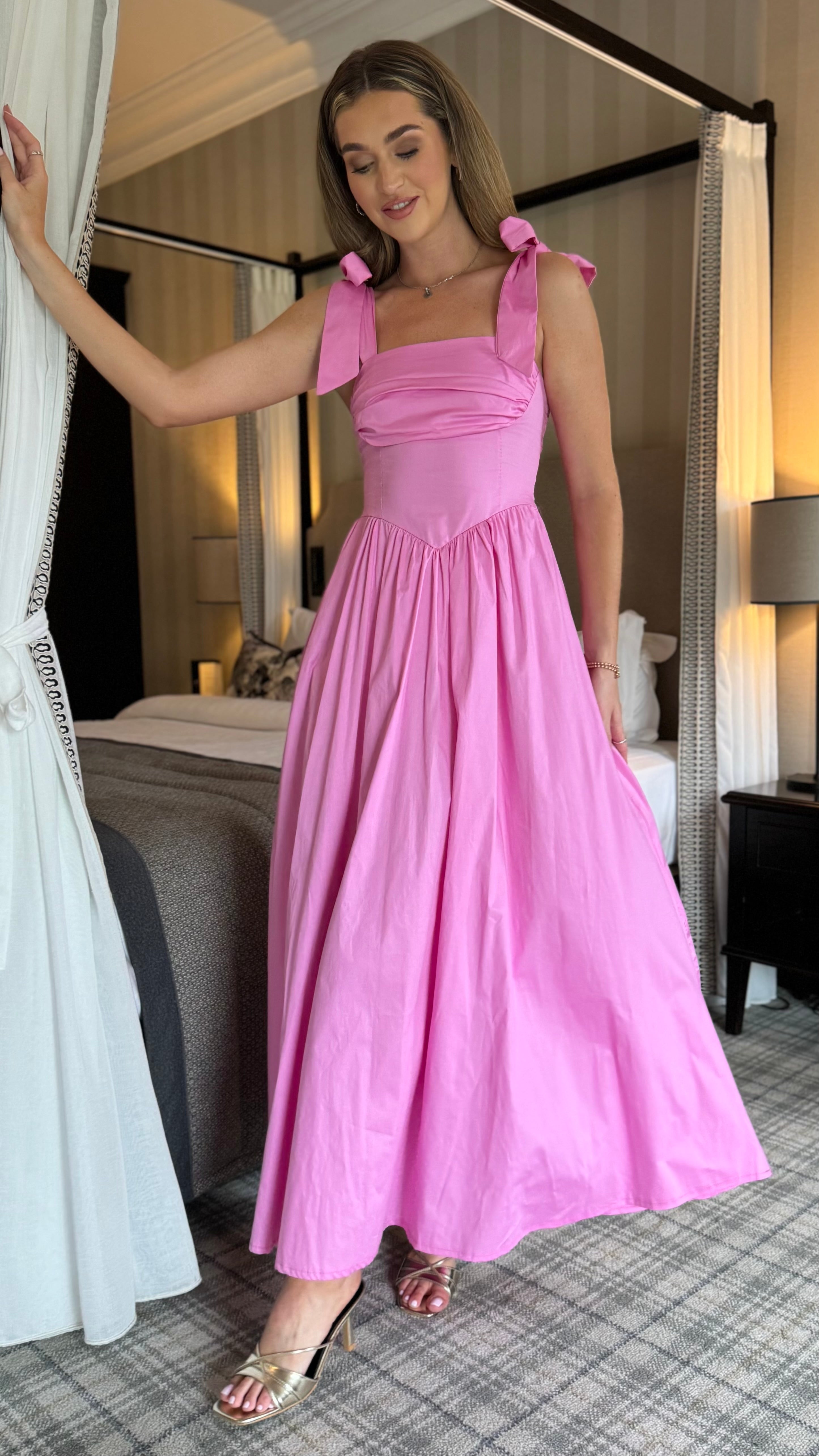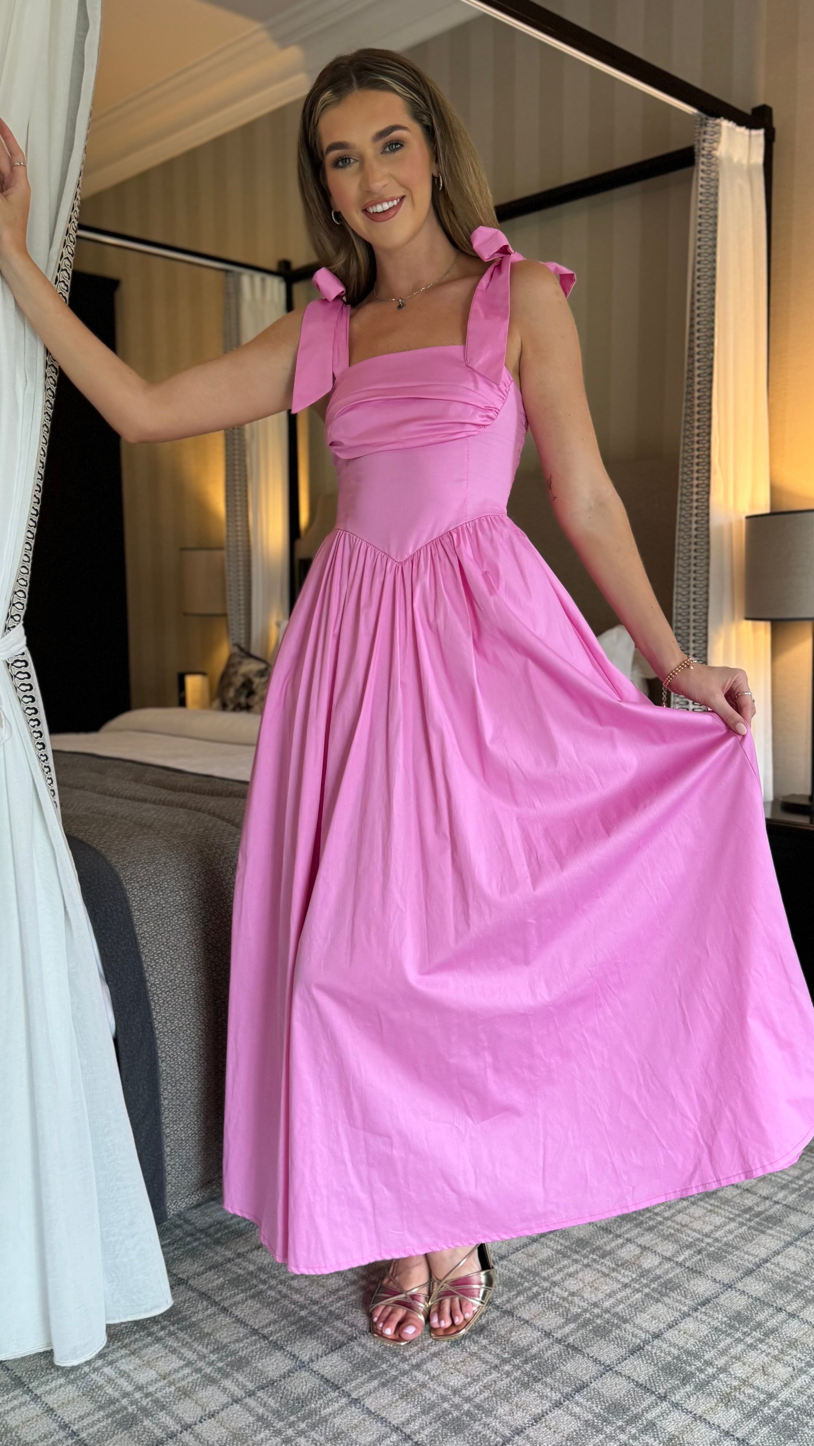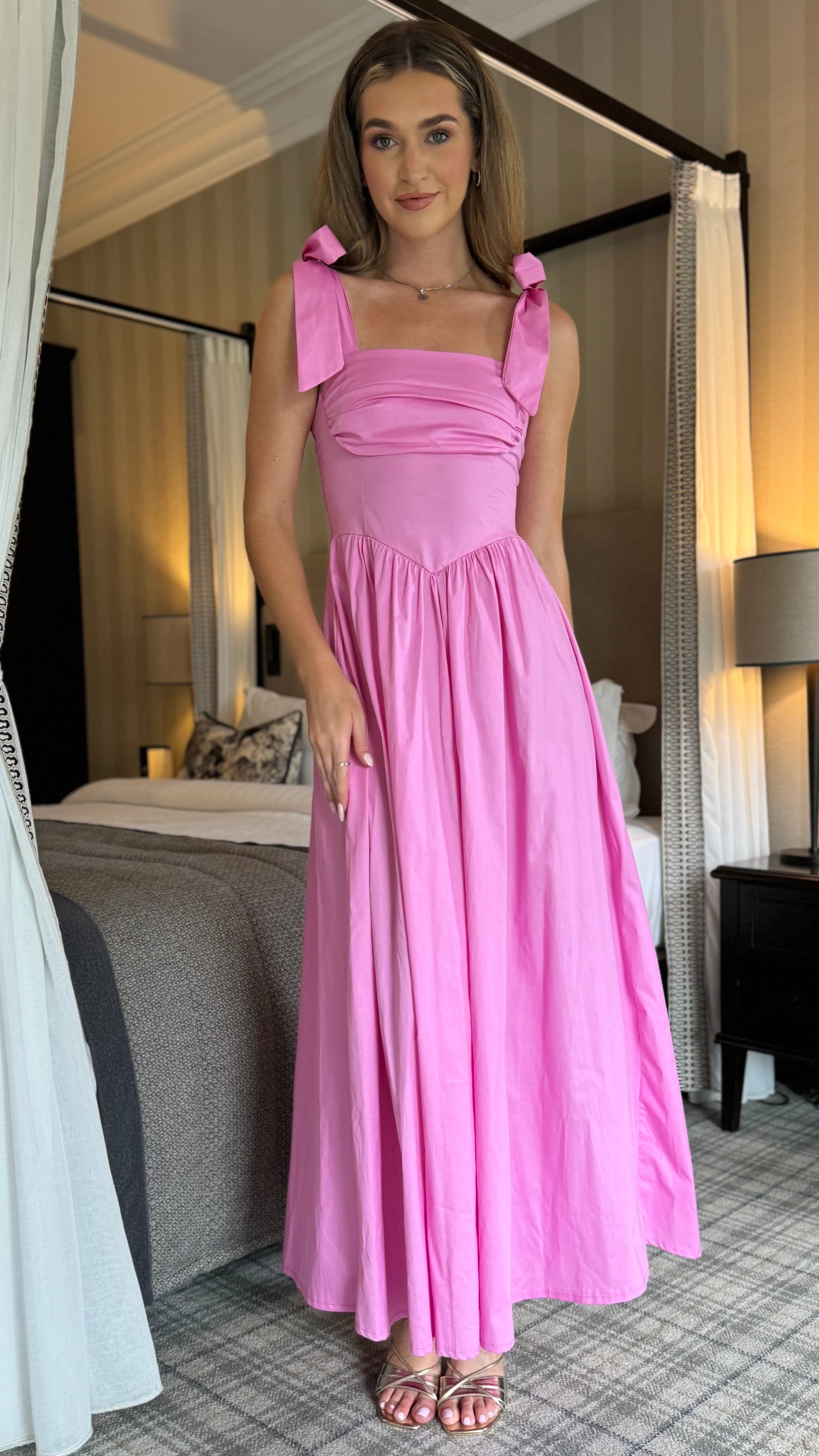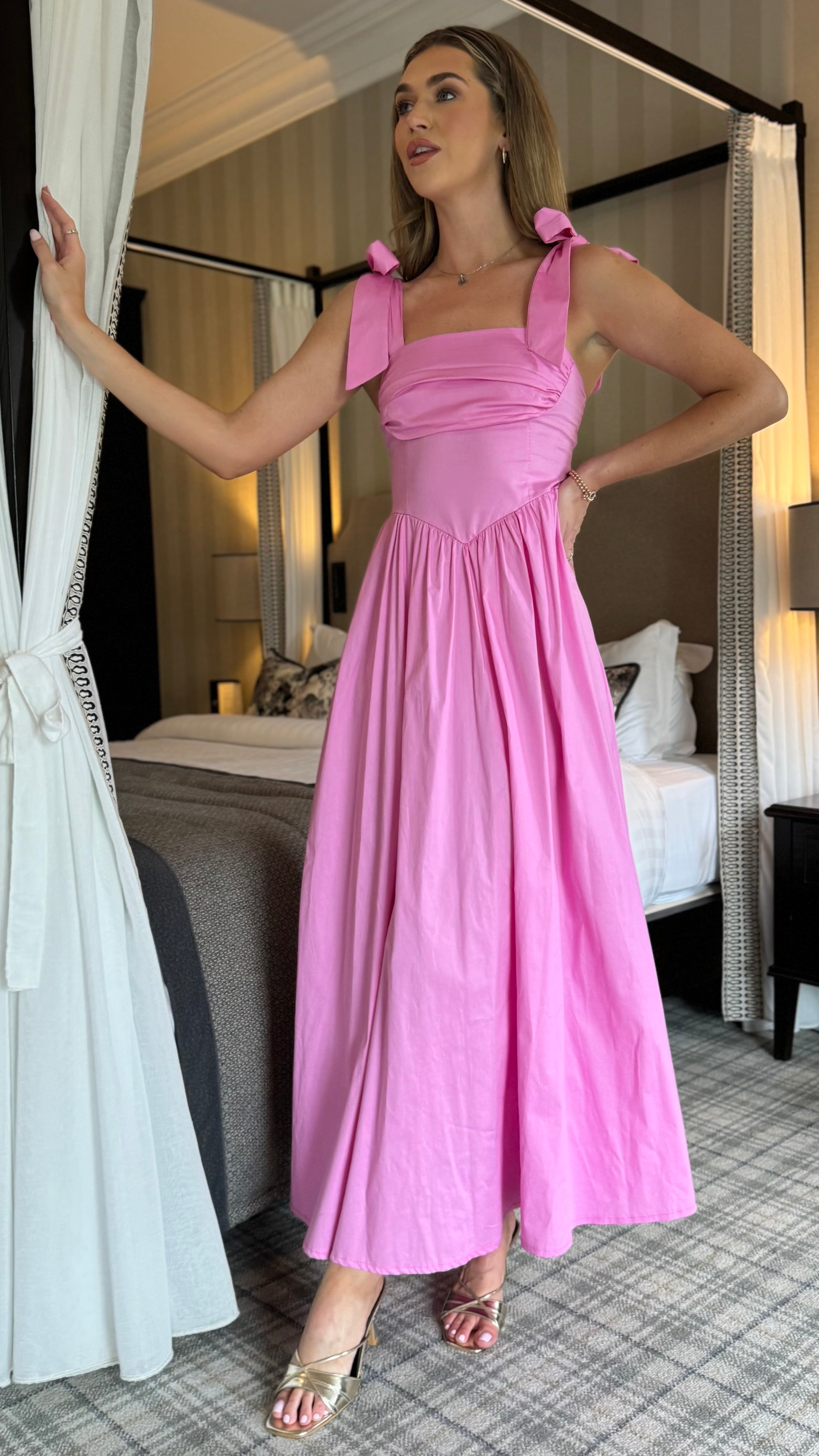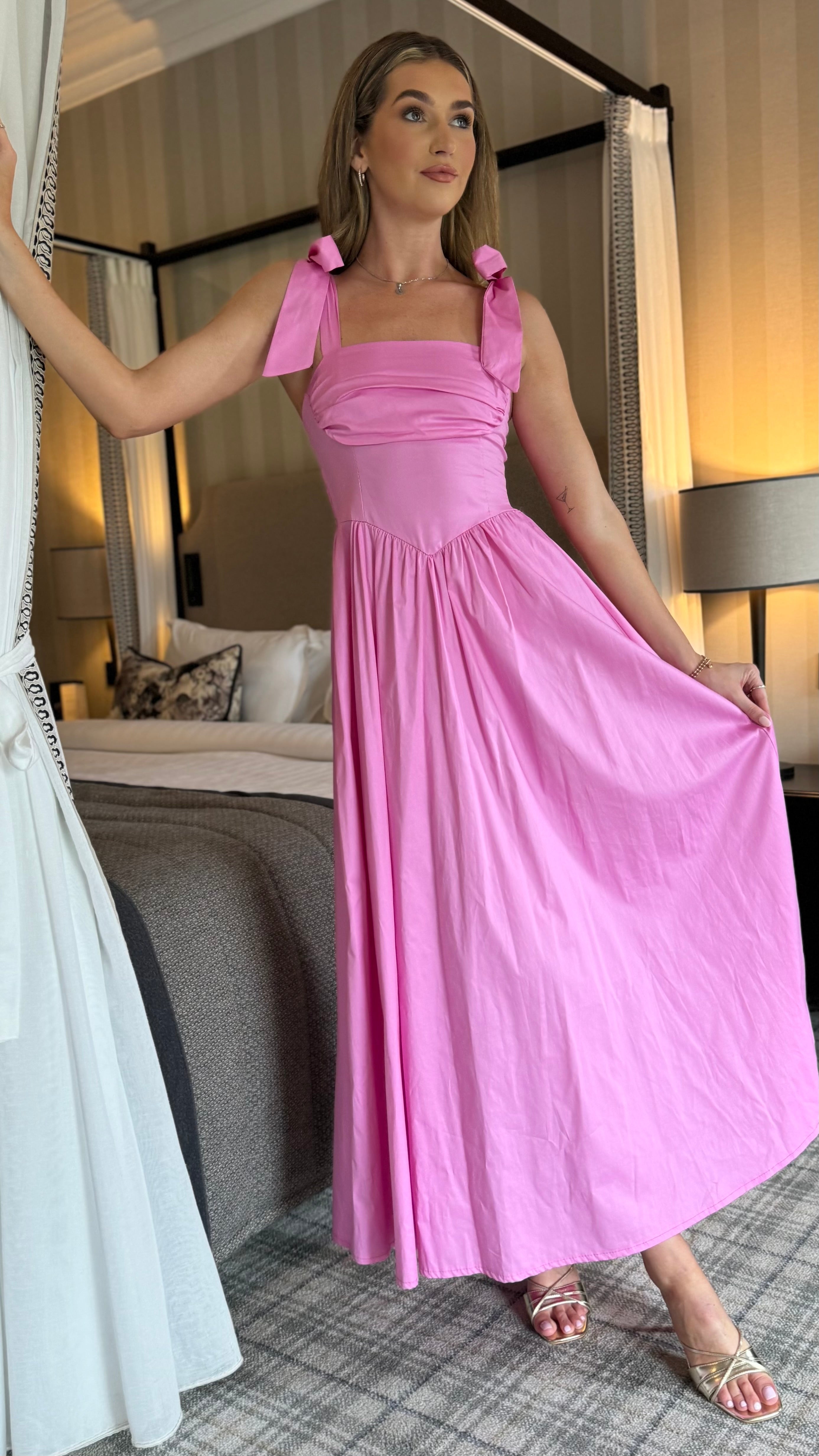 Luellen Pink Tie Shoulder Straps Ruched Bust Detail Midaxi Dress