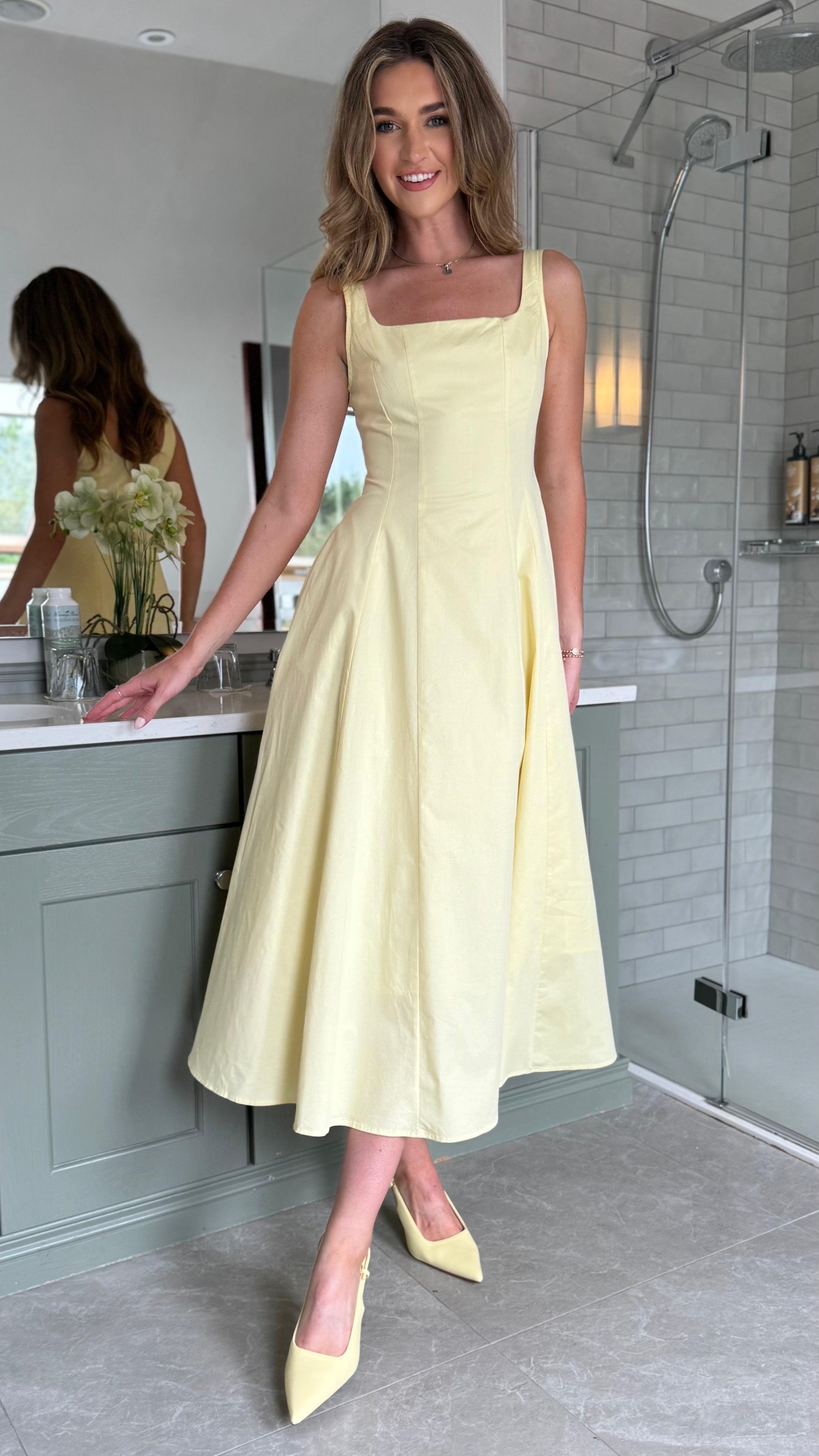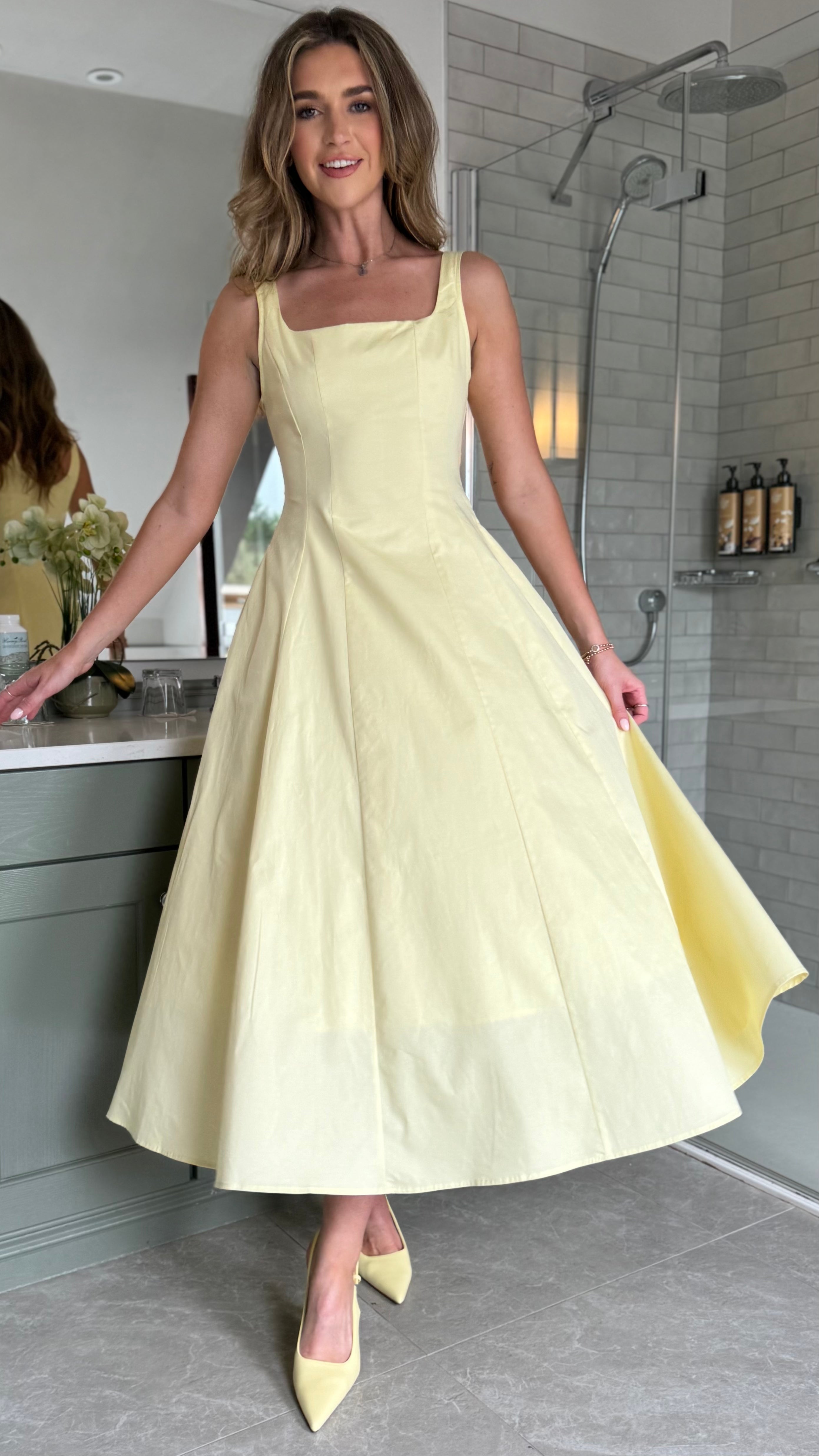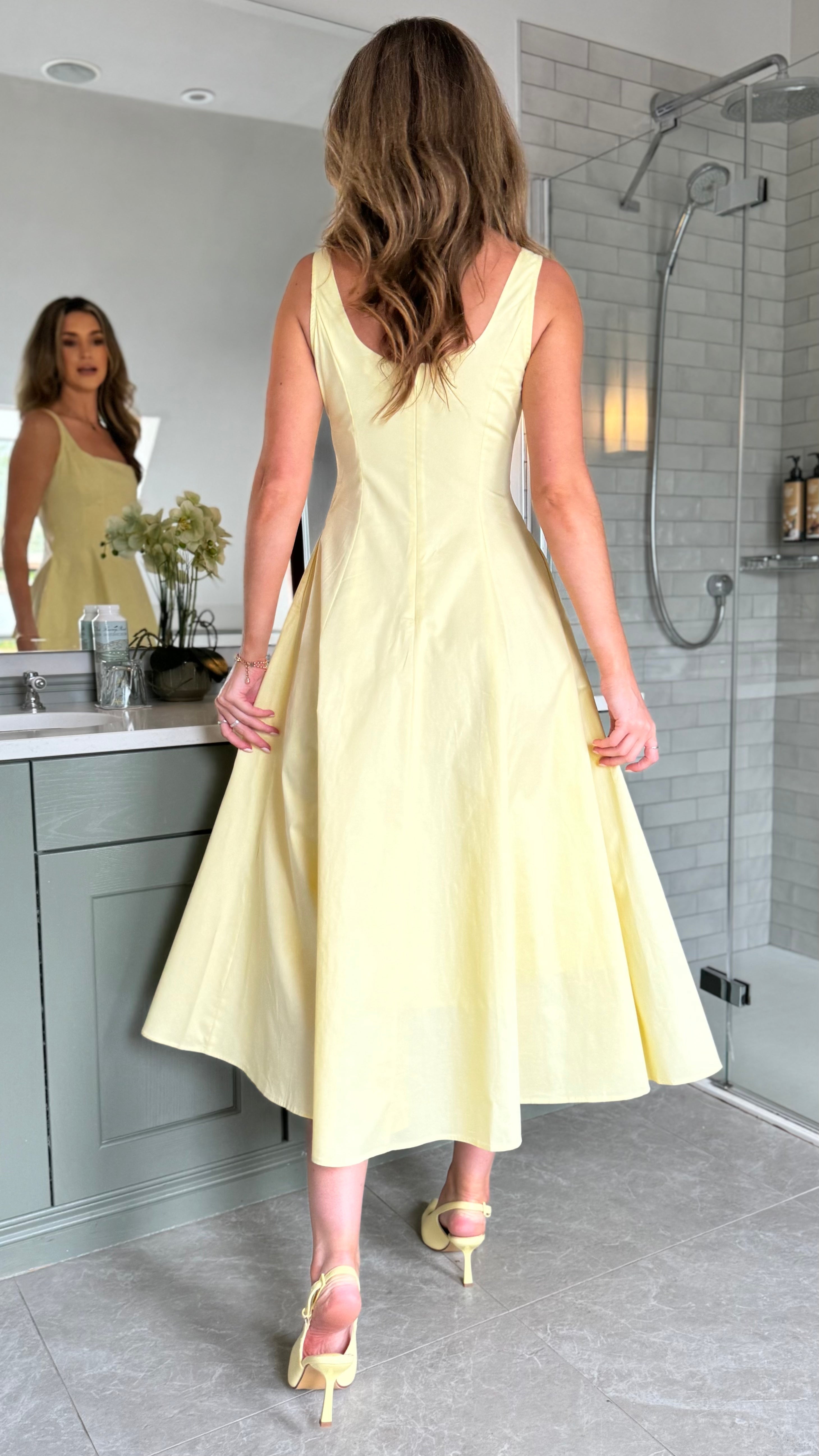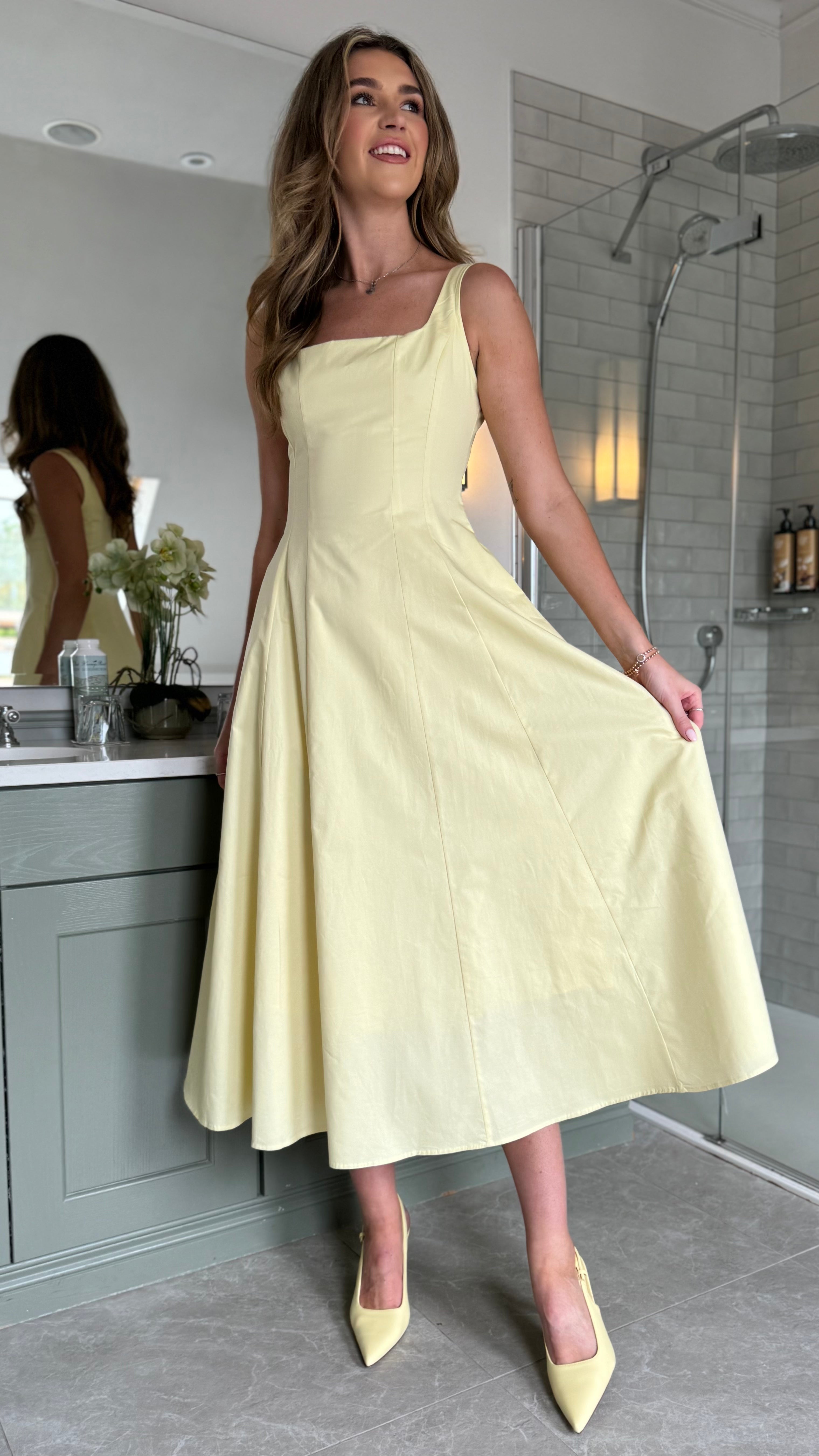 The Maci Yellow Midi Dress showcases a refined square neckline and subtle pocket details, blending style with practicality. Its sunny yellow shade and elegant midi length create a poised, feminine look ideal for daytime events or casual outings. This dress offers both comfort and sophistication in one graceful design.