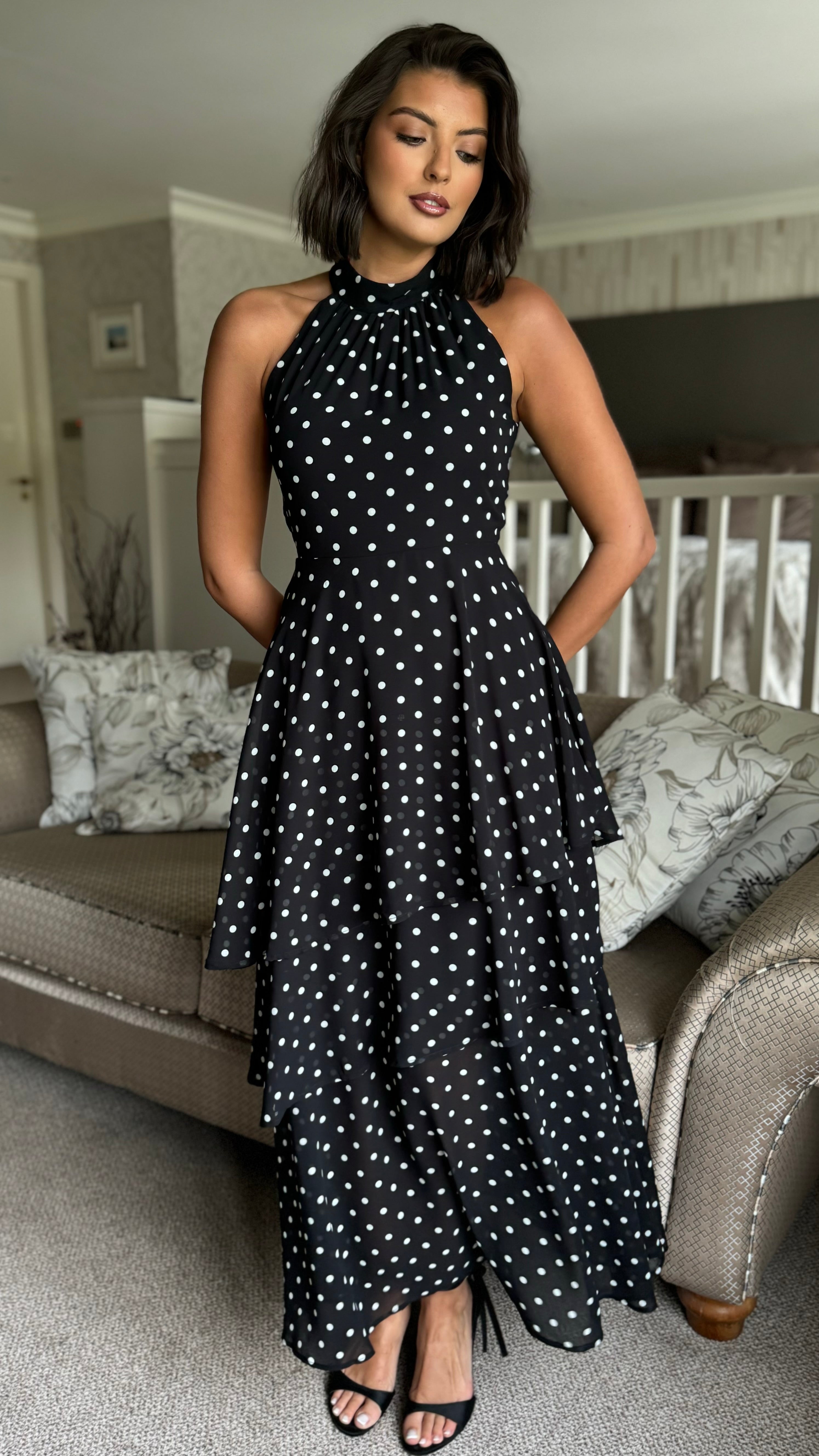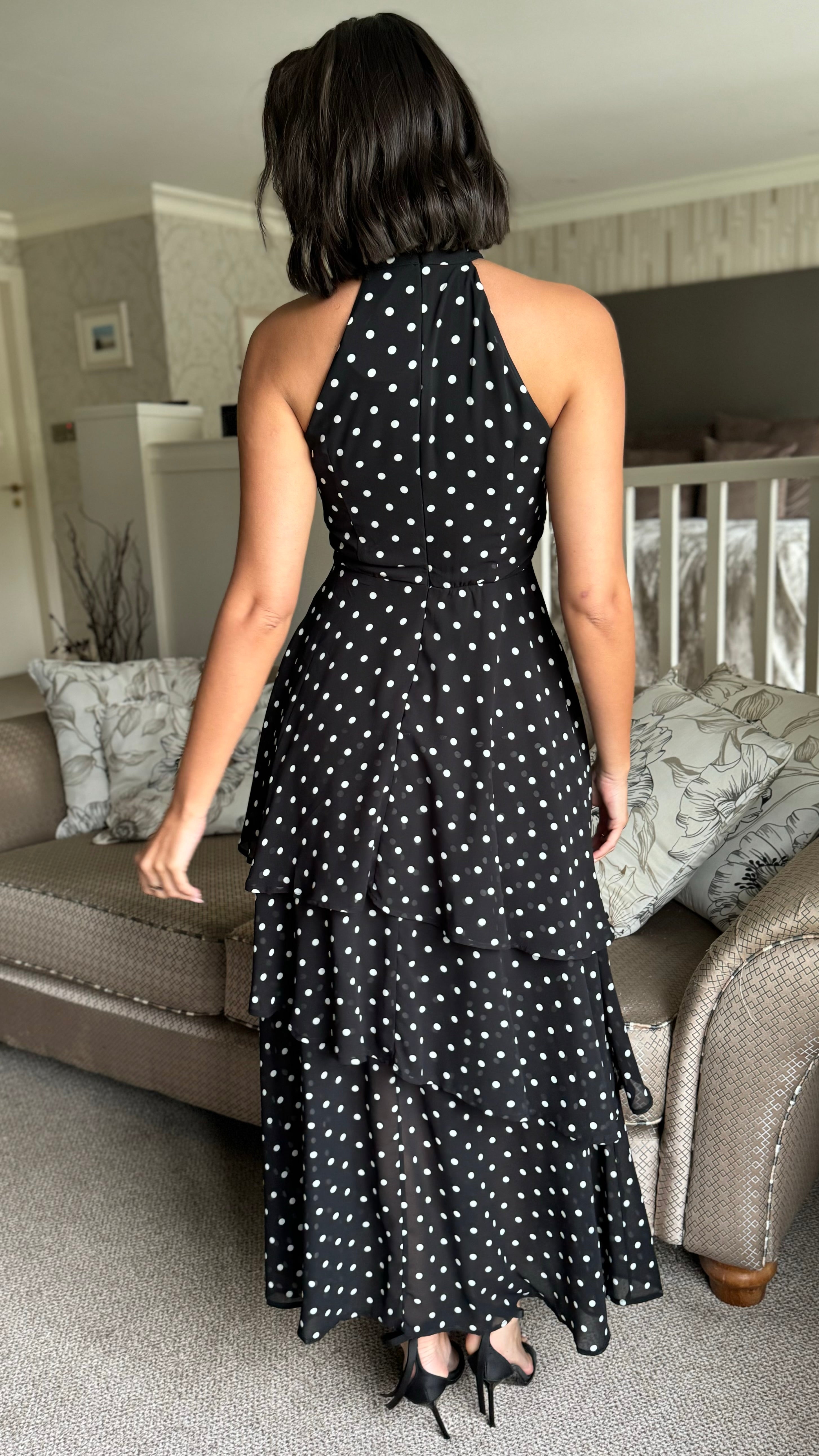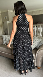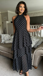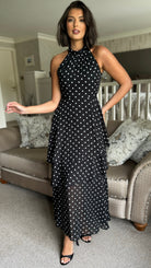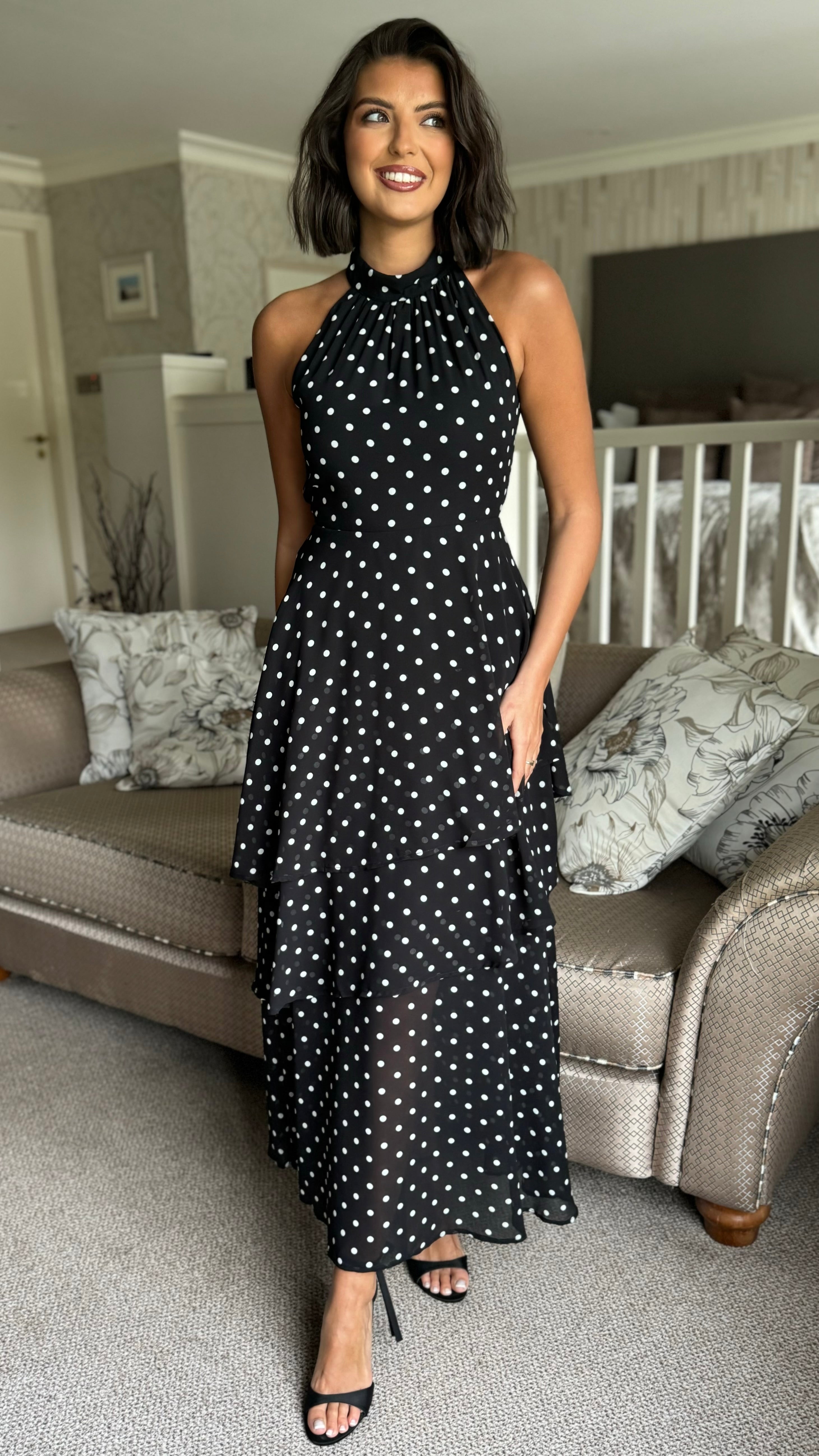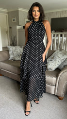 Effortless elegance meets playful style with this black polka dot midi dress. The flattering halterneck design frames the shoulders beautifully, while the tiered chiffon skirt creates graceful movement and dimension. A discreet back zip ensures a smooth fit, and the lined construction provides comfort and confidence all day long. Perfect for occasions that call for something polished yet approachable.