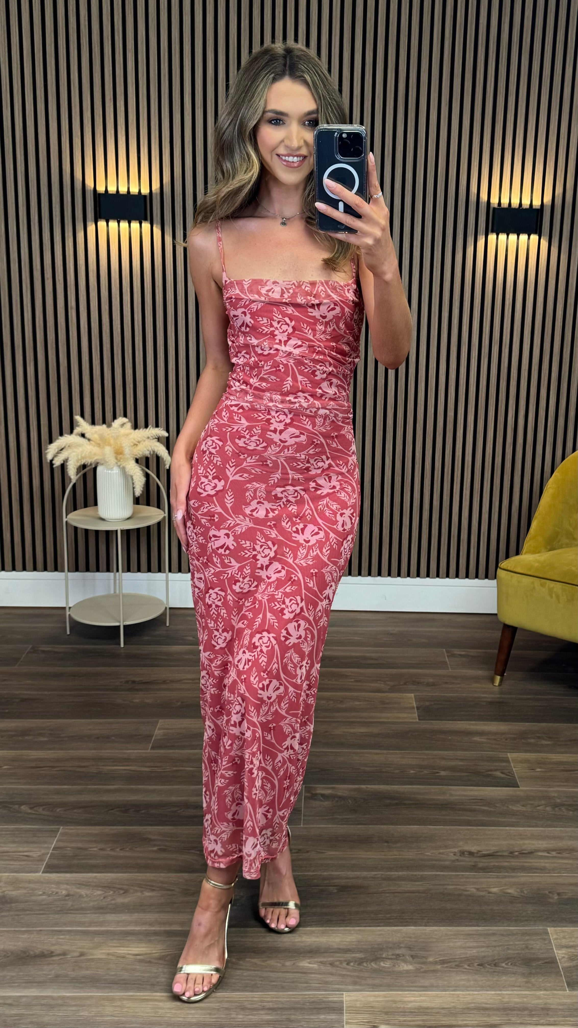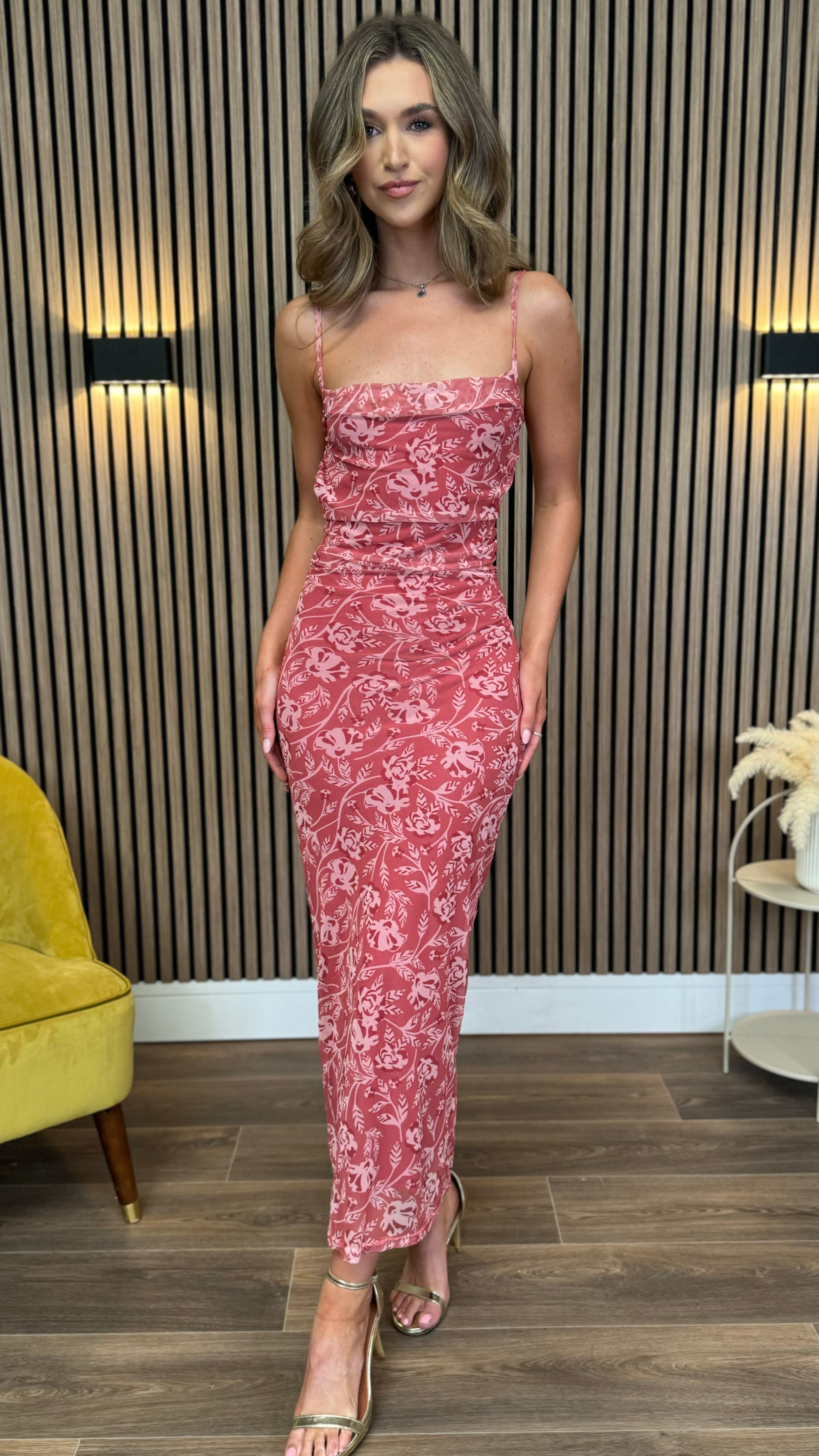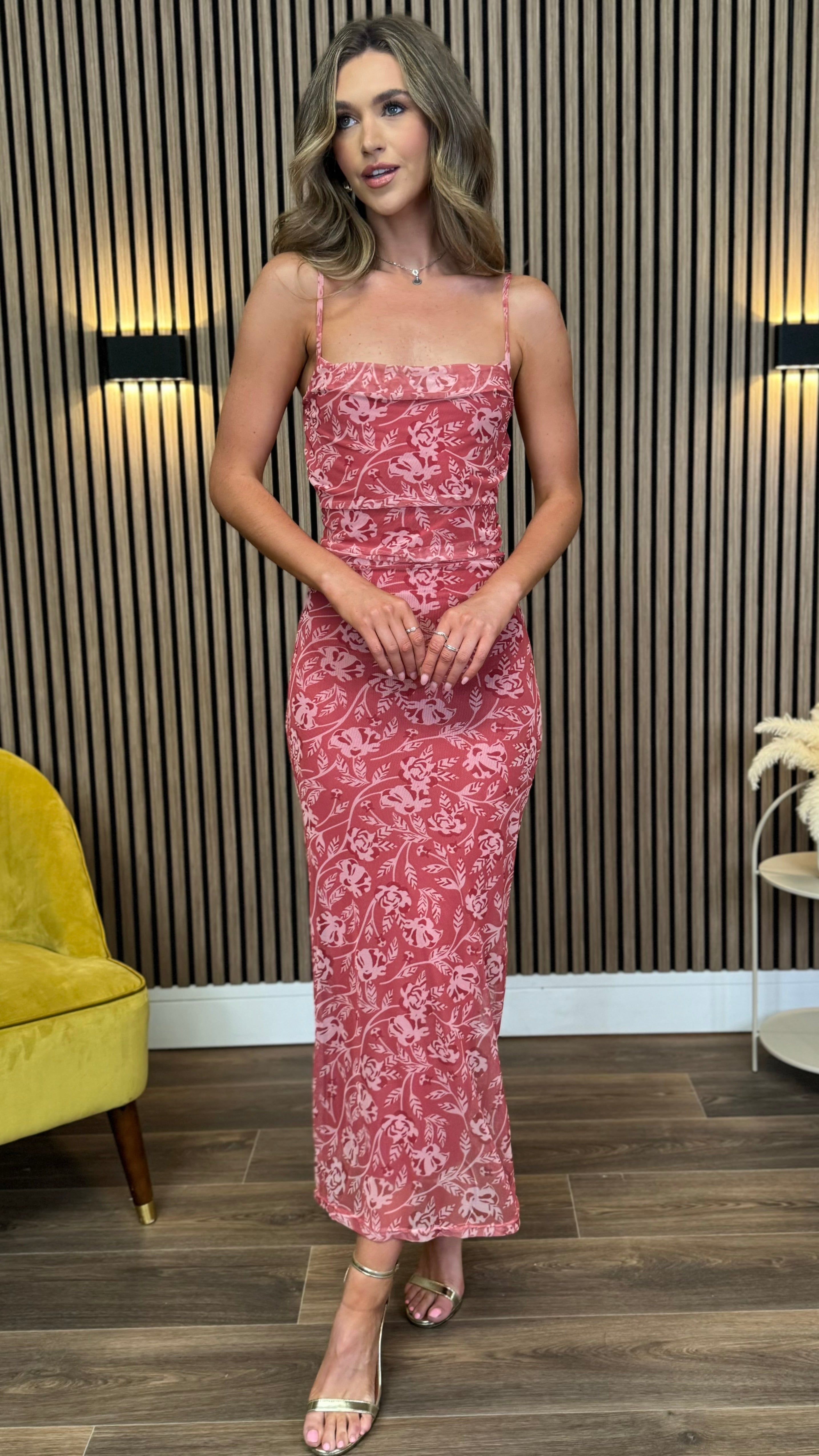 Marion Coral Floral Printed Strappy Backless Midi Dress