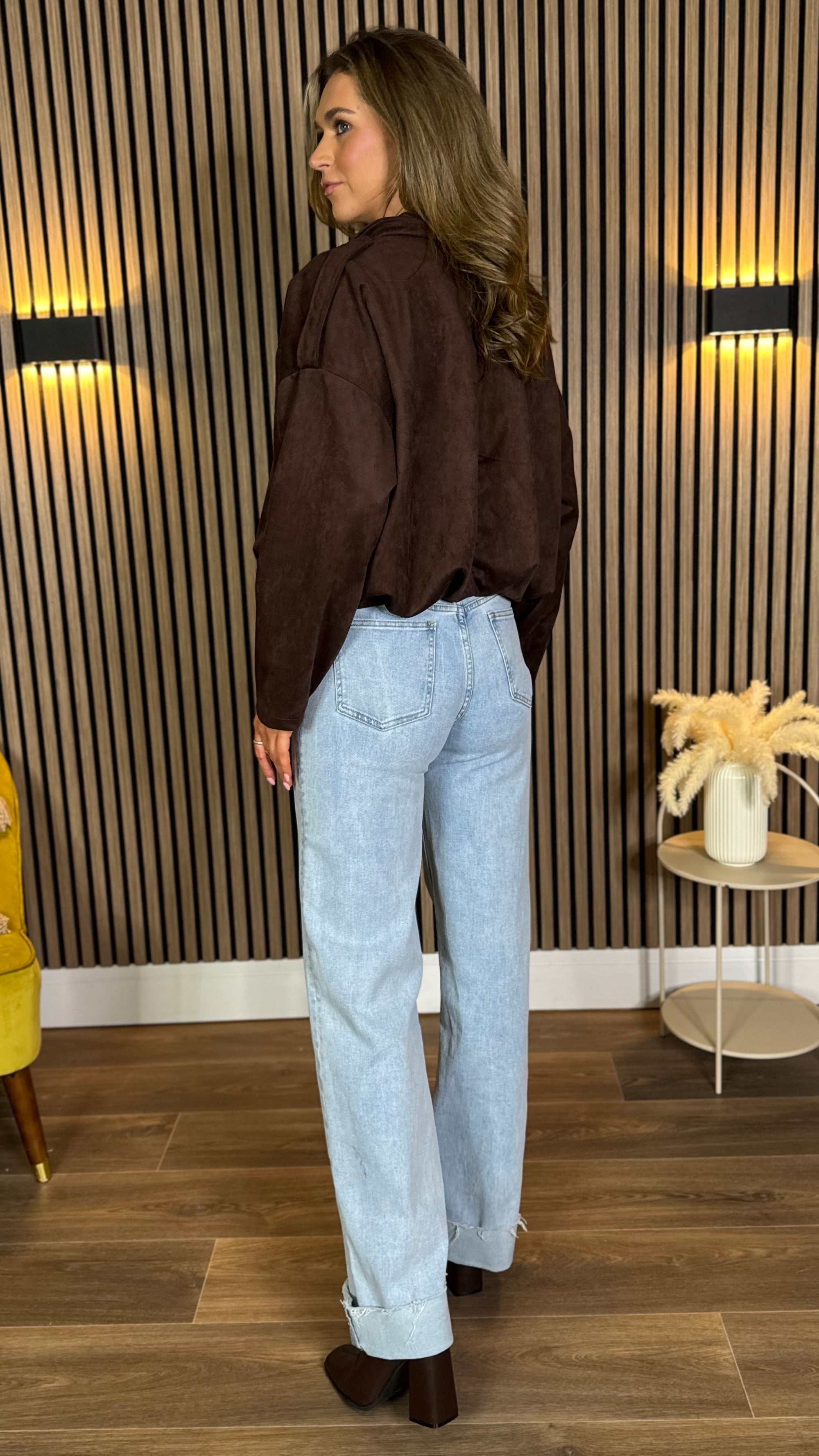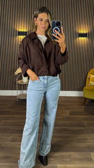 Embrace effortless cool with the Marnie Chocolate Brown Suedette Bomber Jacket. Its playful oversized fit and sleek zip-up front make layering a breeze, while the collar detail adds a stylish twist to the classic bomber look. Perfect for adding a cozy, fashion-forward edge to any outfit.