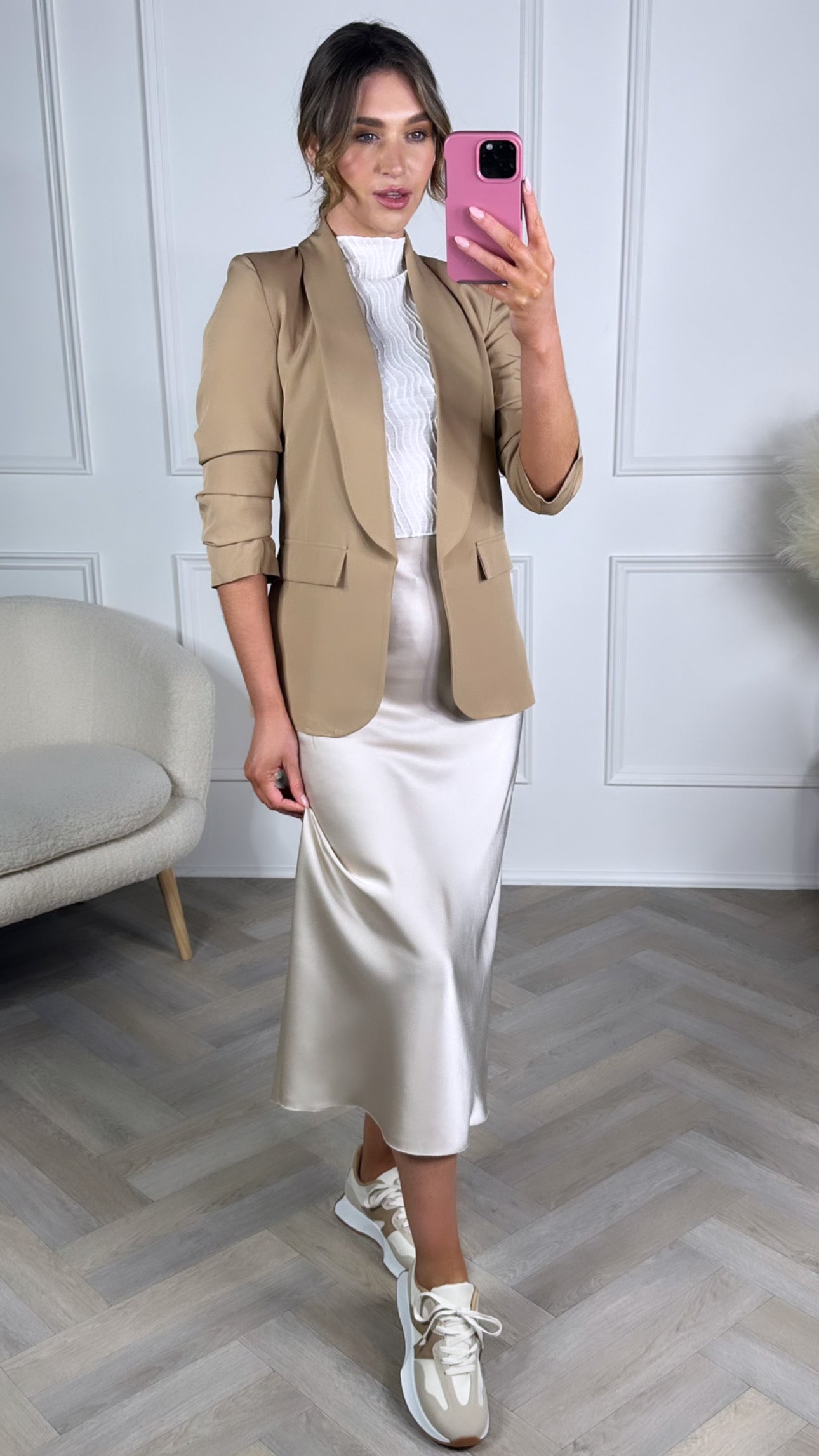 Look sharp and feel comfy with this McKinley Camel Ruched Sleeve Blazer! It's got all the features you need and then some: ruched sleeves, a trendy collar detail, faux pockets, and a lining to keep you comfortable 🔥