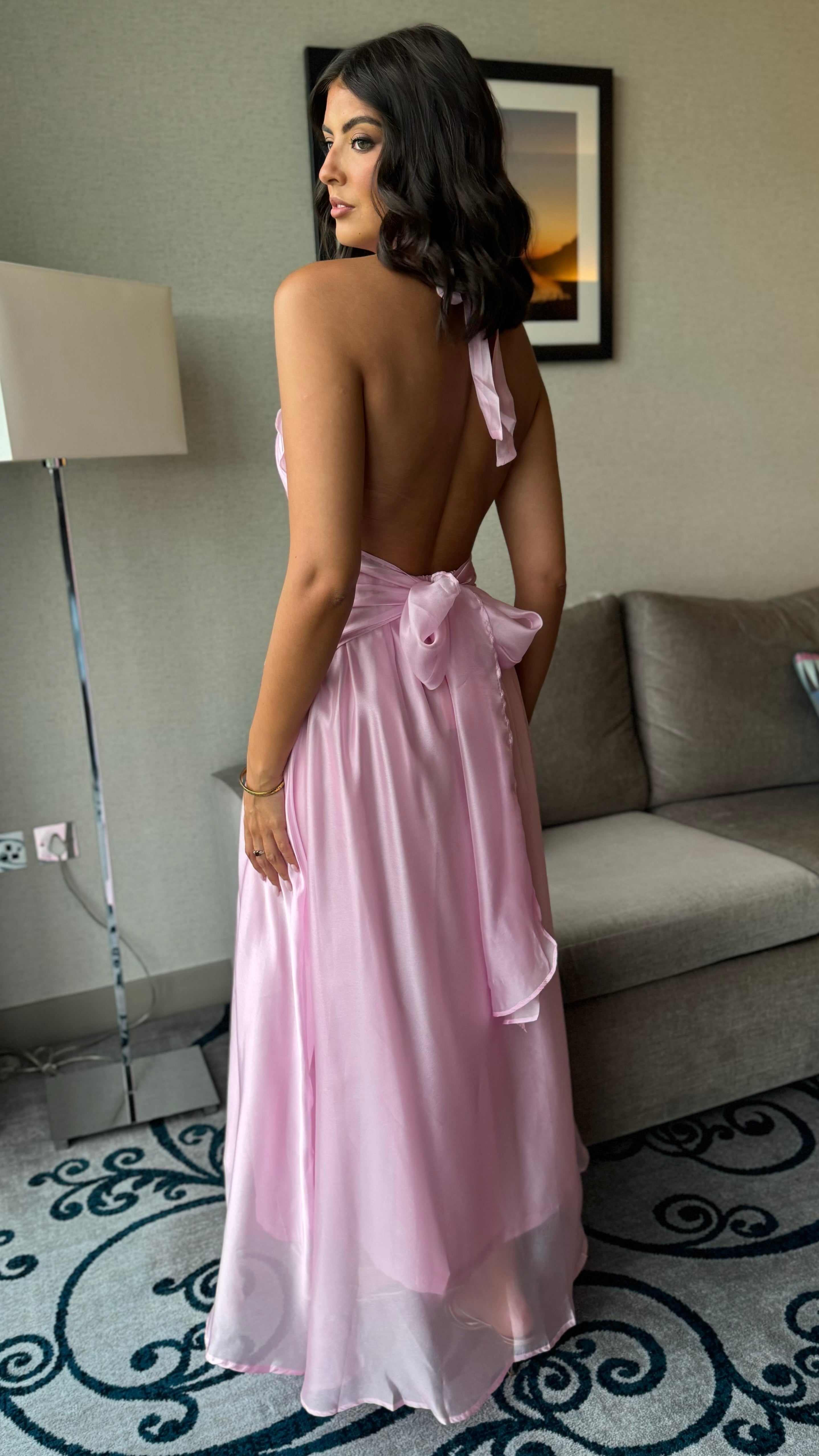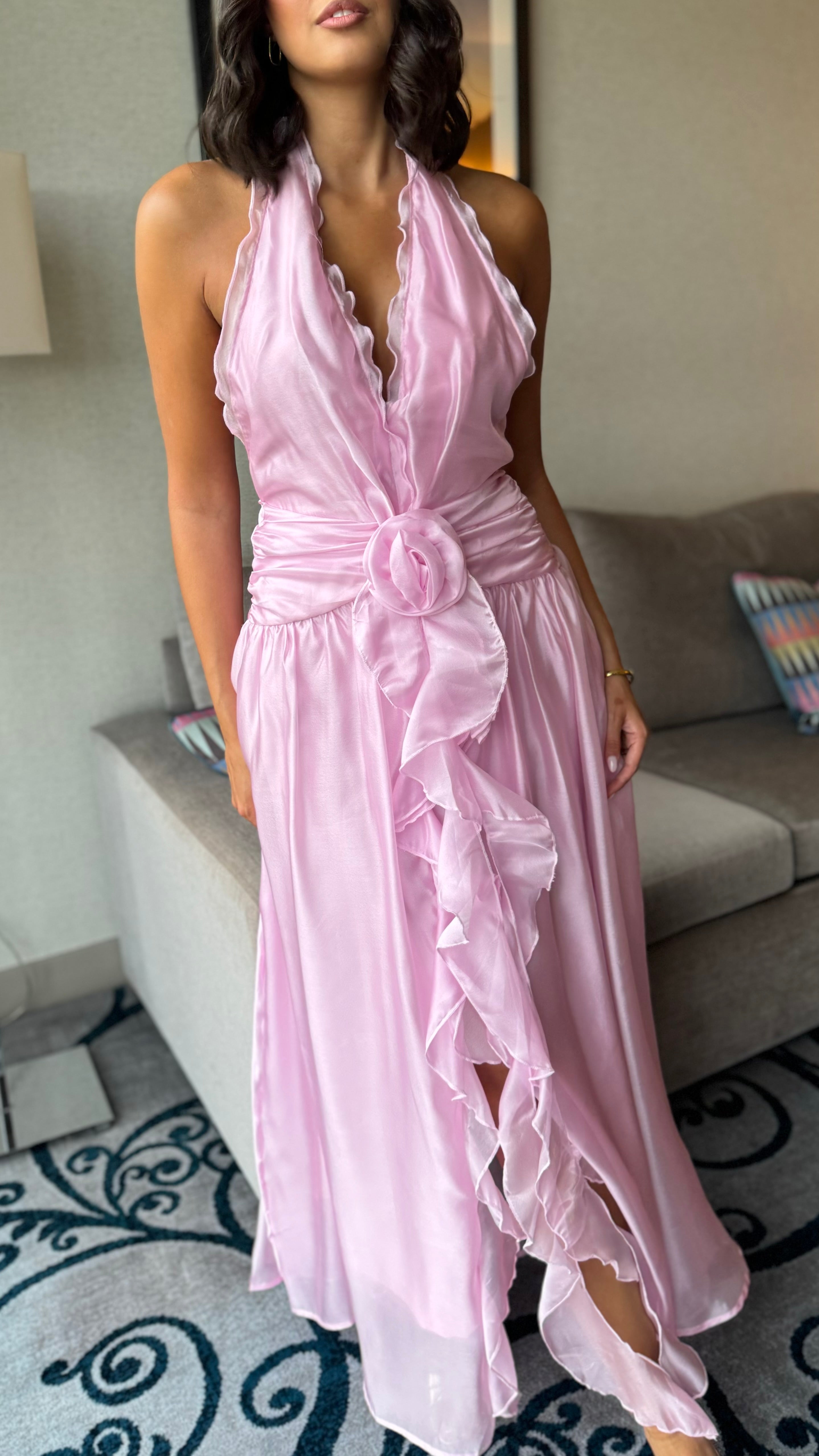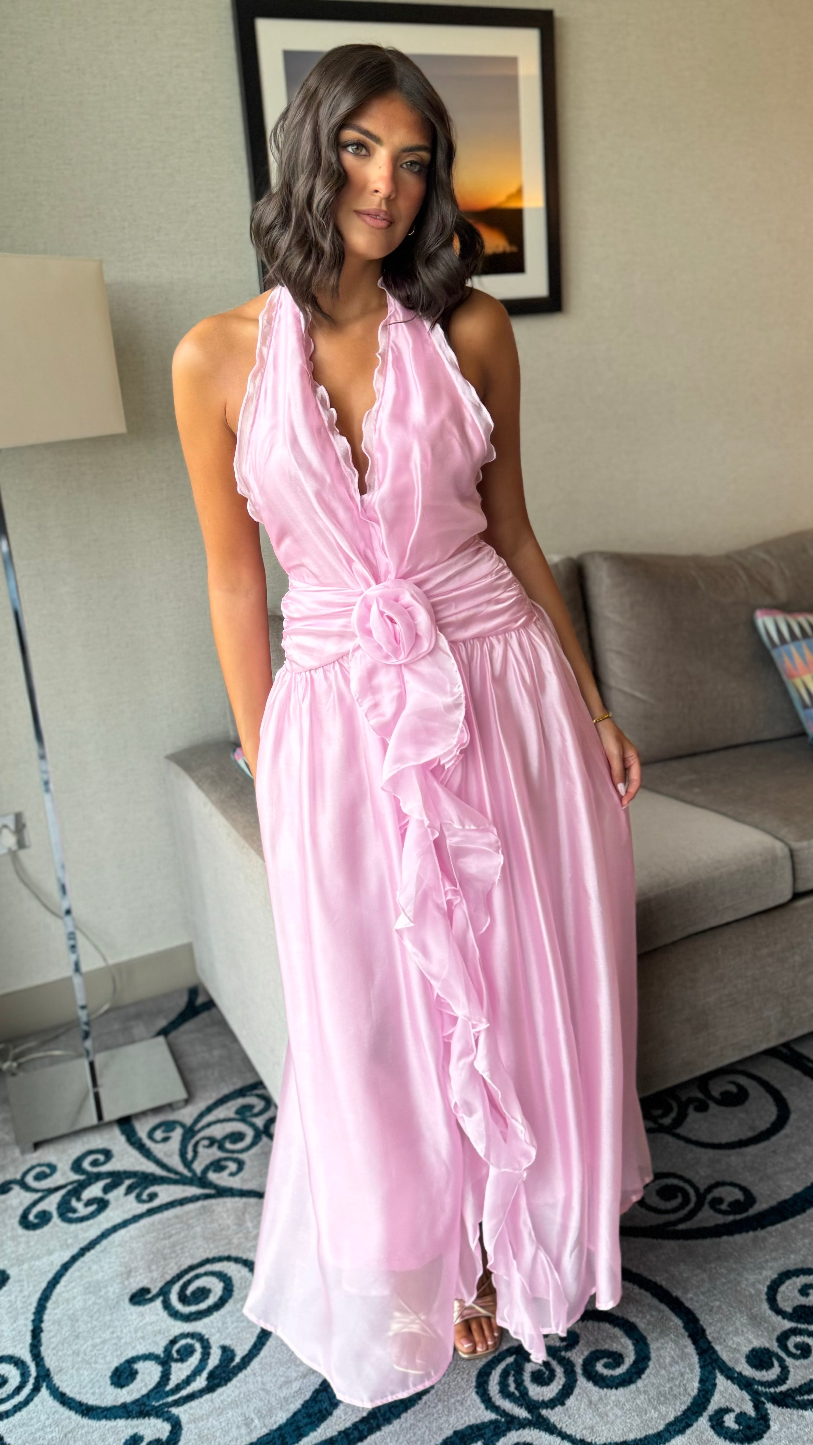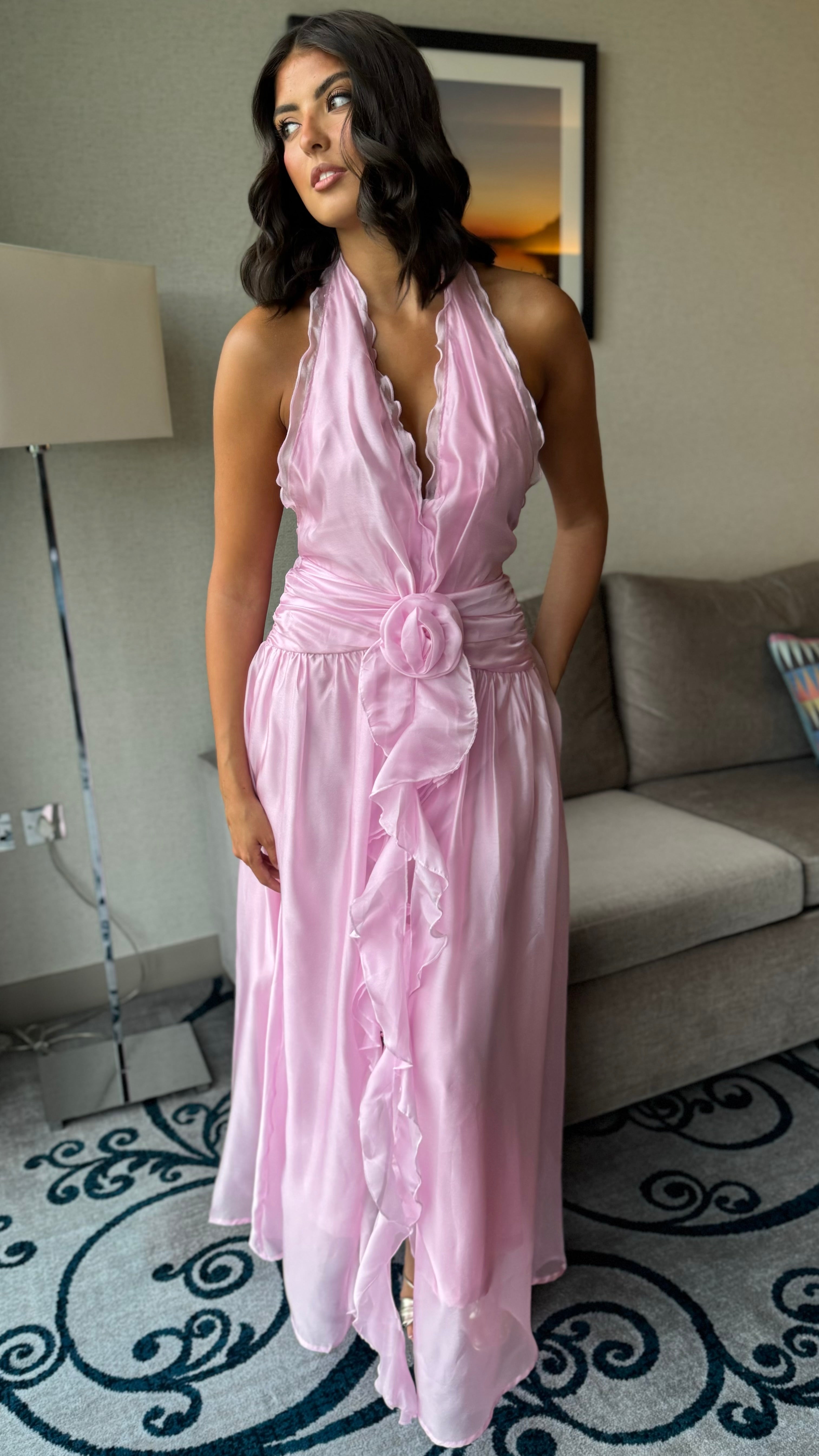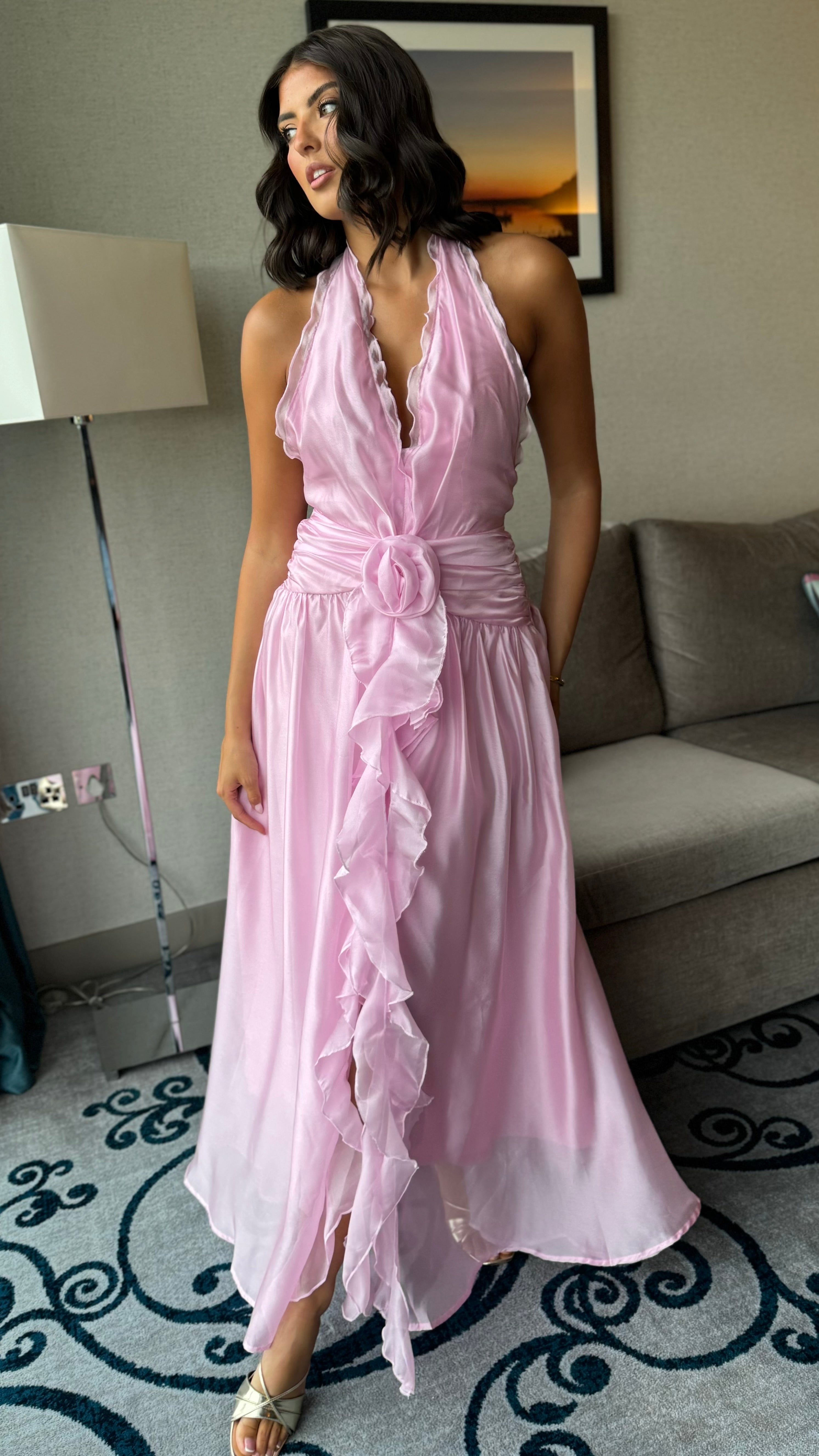 Mila Pink Rose Ruffle Backless Halterneck Chiffon Maxi Dress