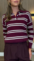 Get cozy in style with the Burgundy Stripe Collar Detail Jumper. Featuring a playful stripe pattern, fitted ribbed cuffs, and a charming button detail, this jumper adds a fun twist to your everyday look. The ribbed collar keeps you snug while elevating your outfit effortlessly.
