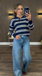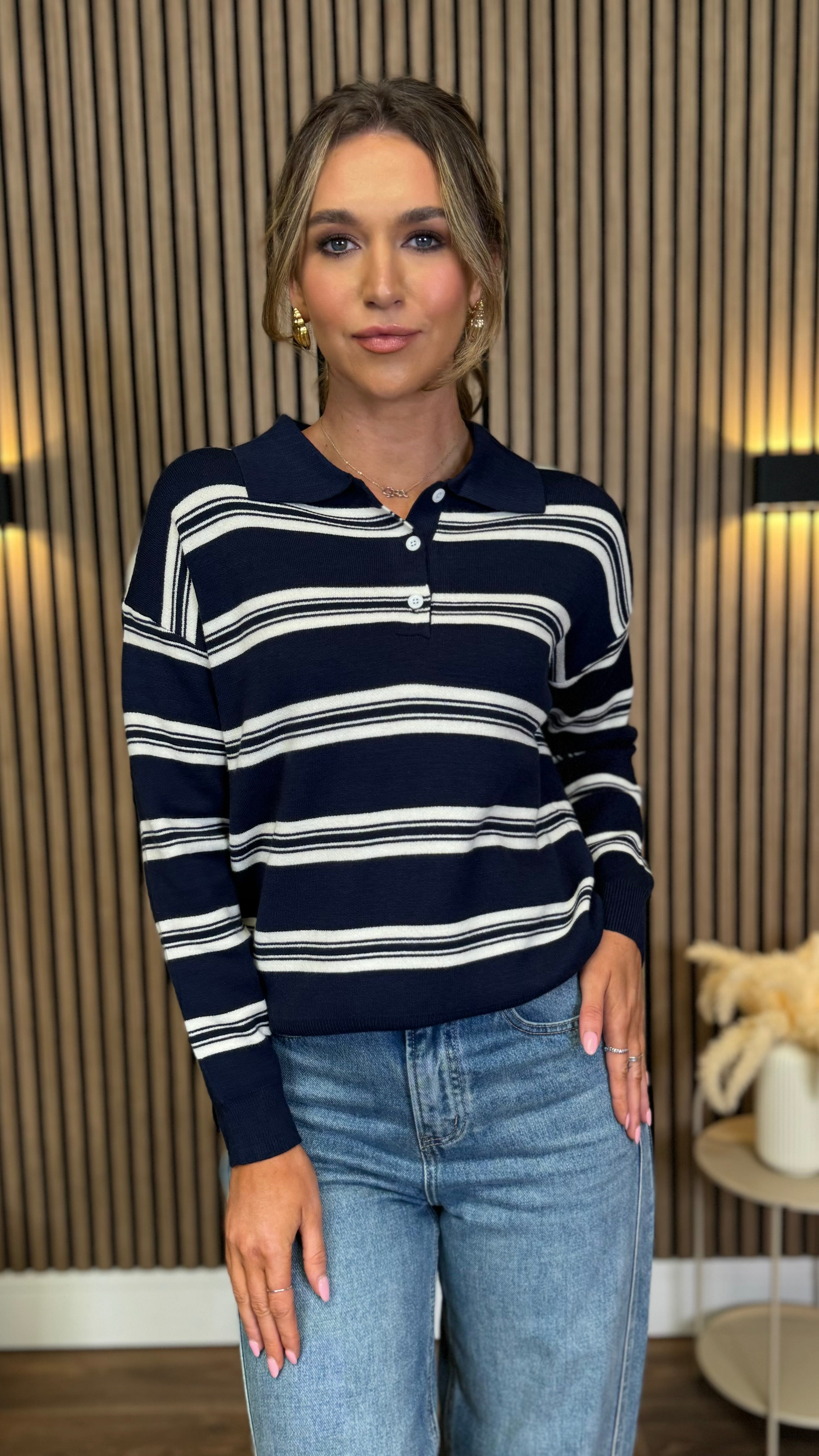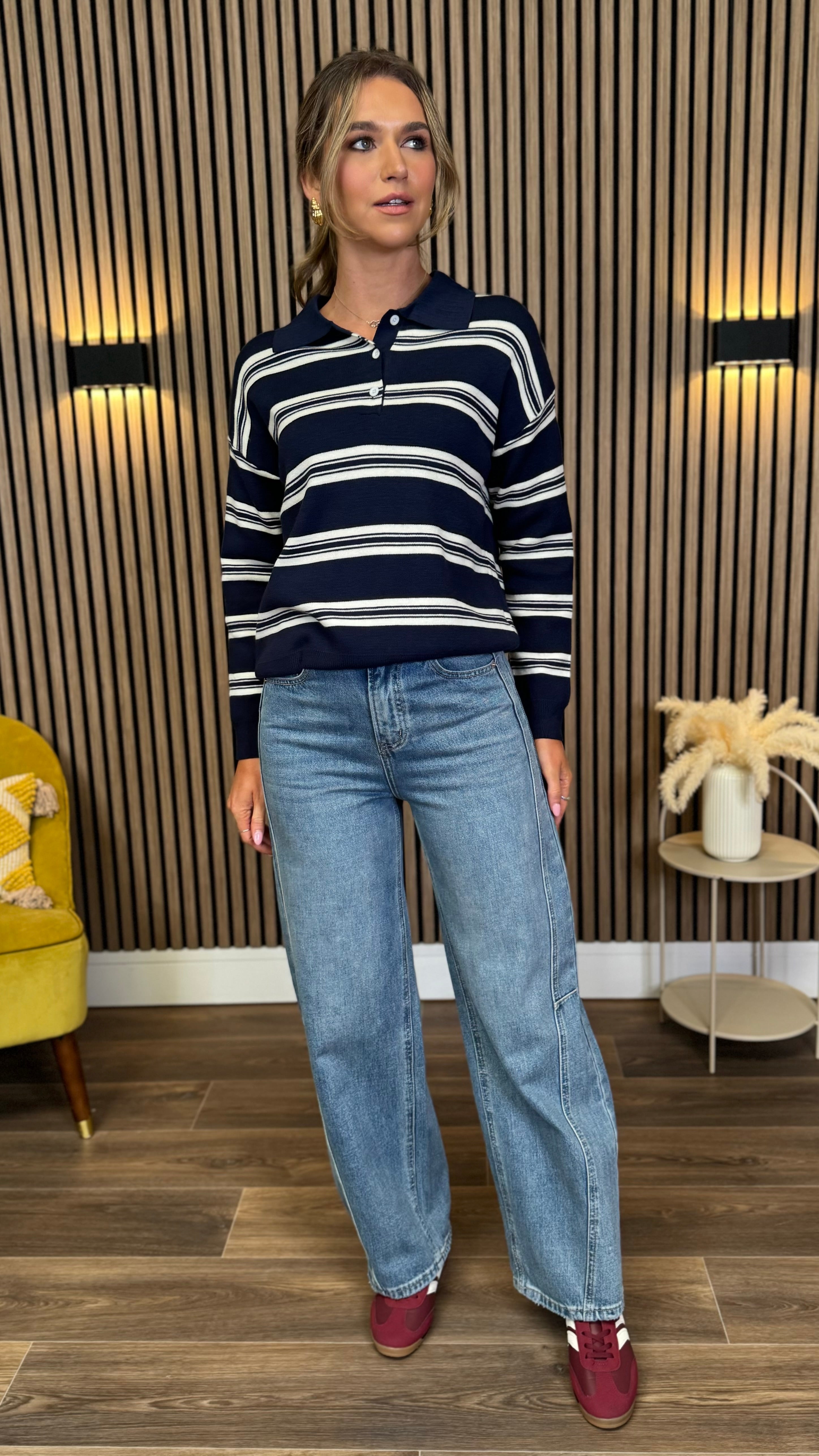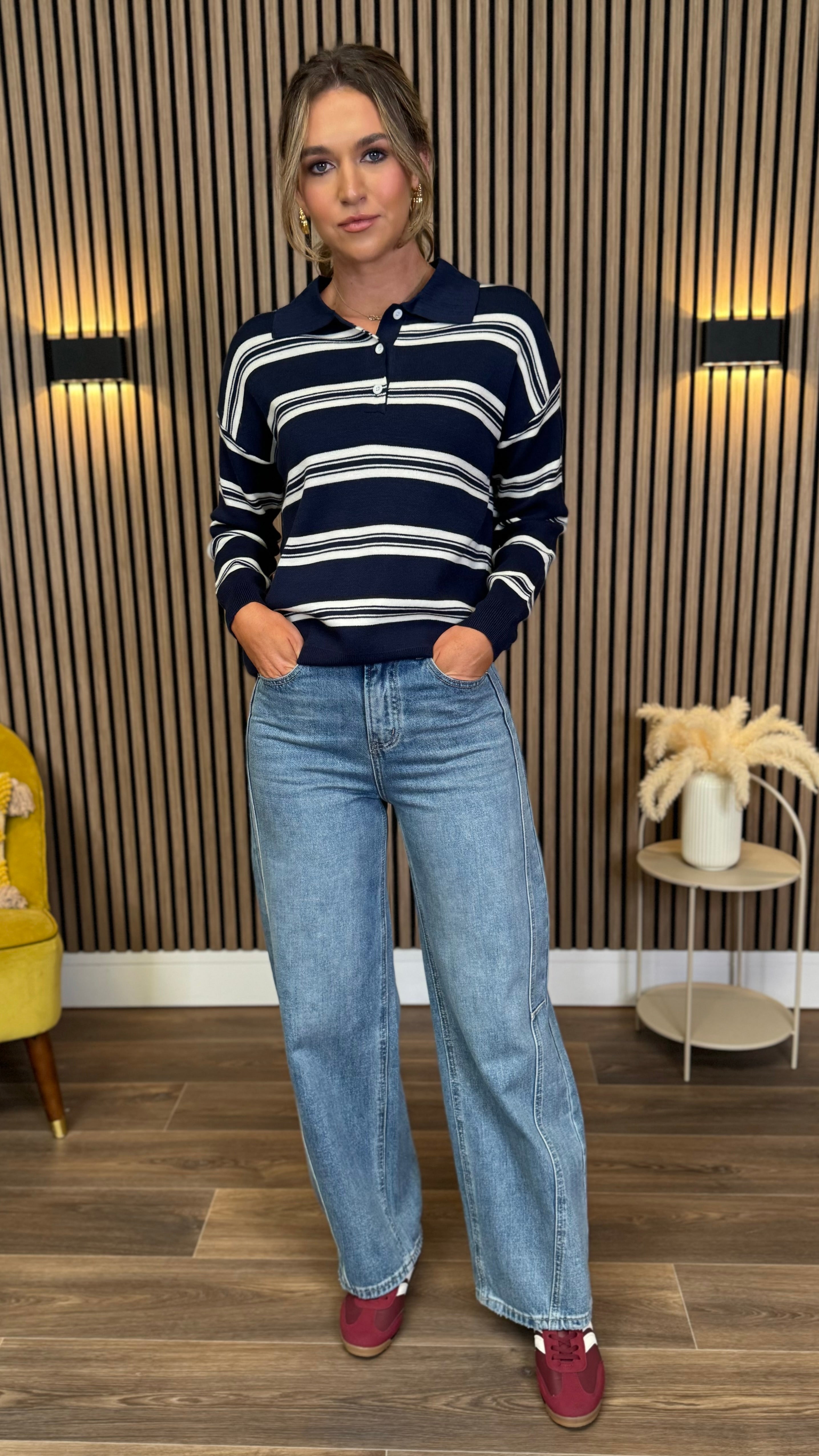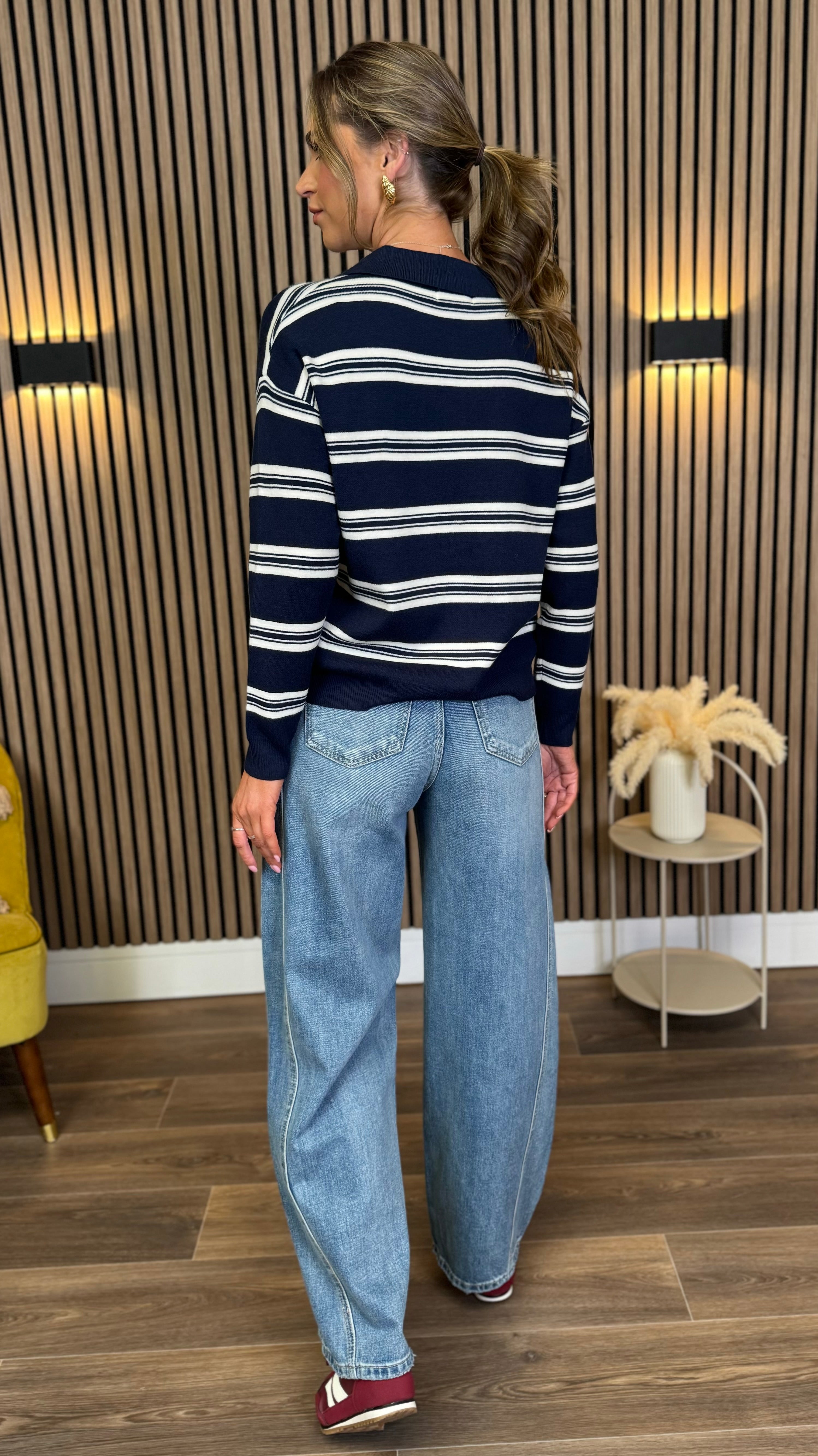 Get cozy in style with the Sally Navy Stripe Collar Detail Jumper. Featuring a playful stripe pattern, fitted ribbed cuffs, and a charming button detail, this jumper adds a fun twist to your everyday look. The ribbed collar keeps you snug while elevating your outfit effortlessly.