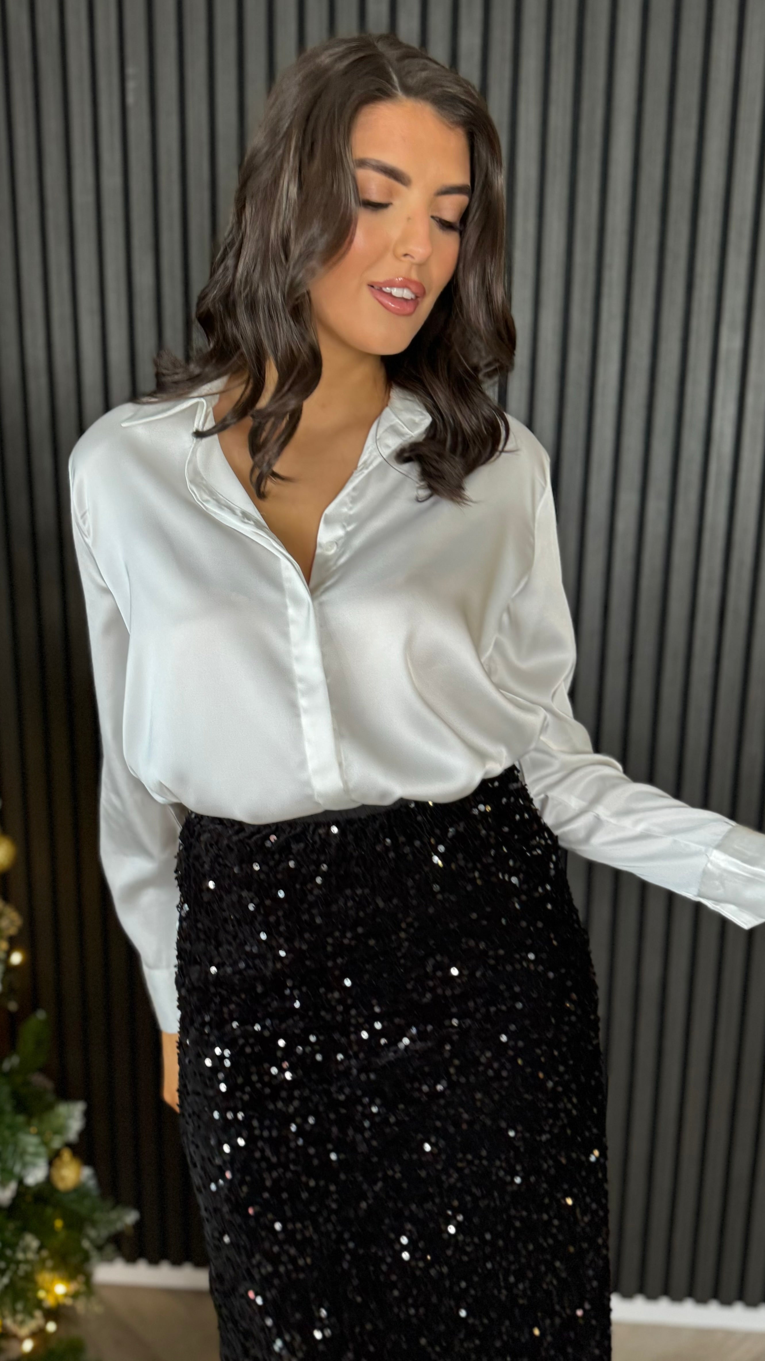 Slip into effortless elegance with this gorgeous white satin shirt that's ready to steal the show. The luxurious satin fabric drapes beautifully against your skin, while the flattering V neckline adds a touch of sophistication to any outfit. Button down the front for easy styling, and enjoy the lined interior for extra comfort and durability. The longer hemline at the back creates a chic, modern silhouette that works whether you're dressing it up or keeping it casual. Pure satin sophistication with a playful twist.