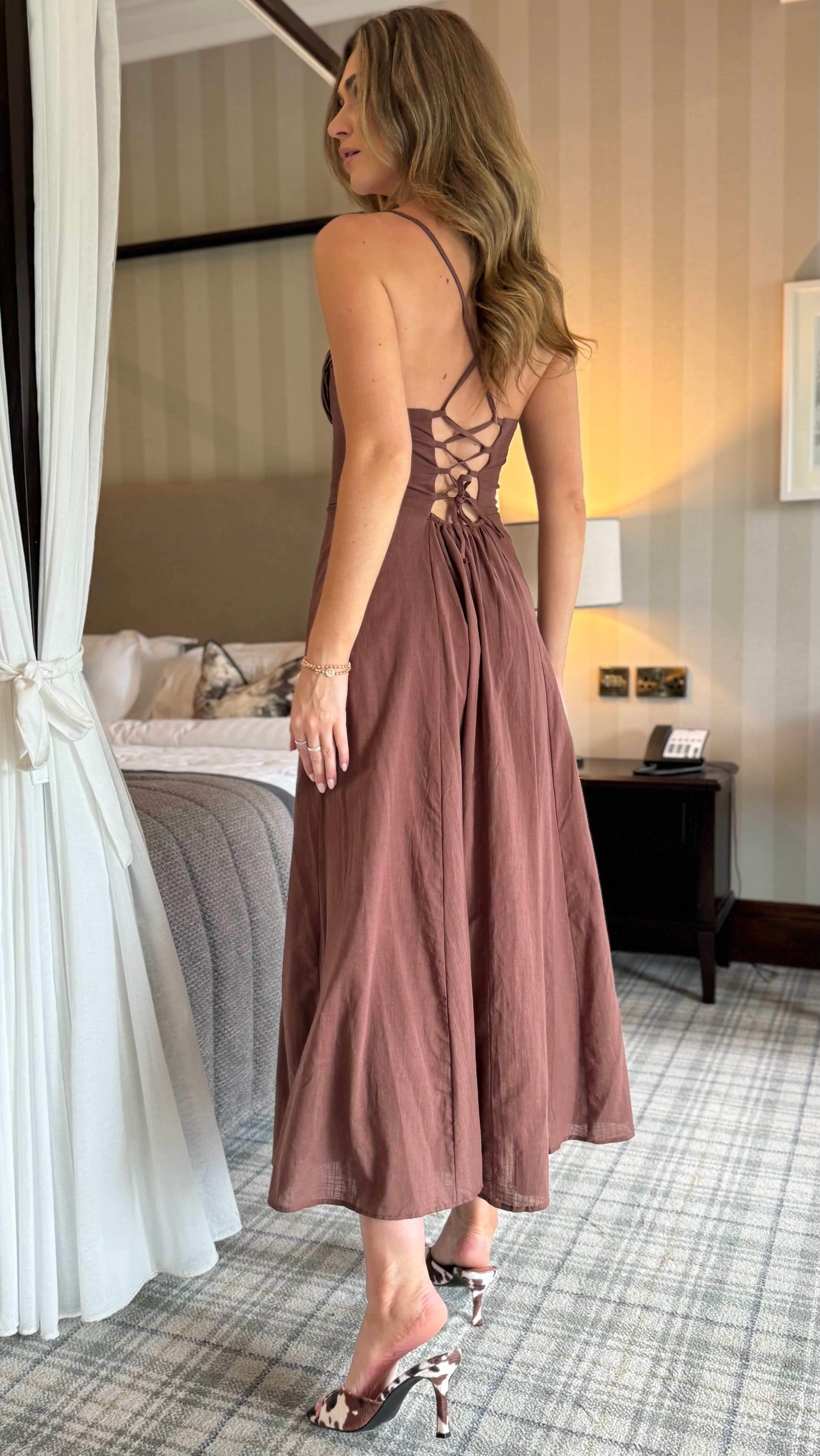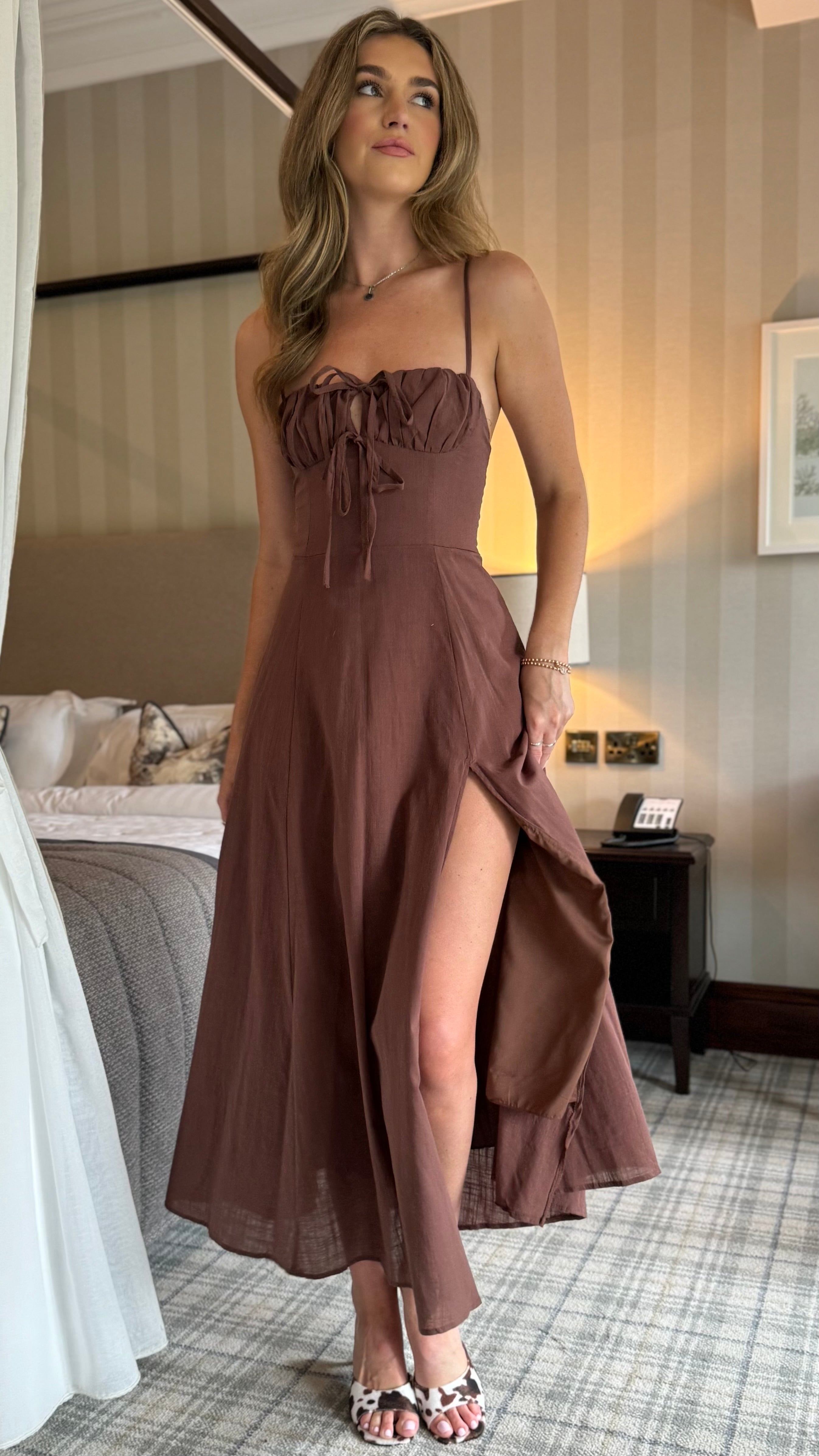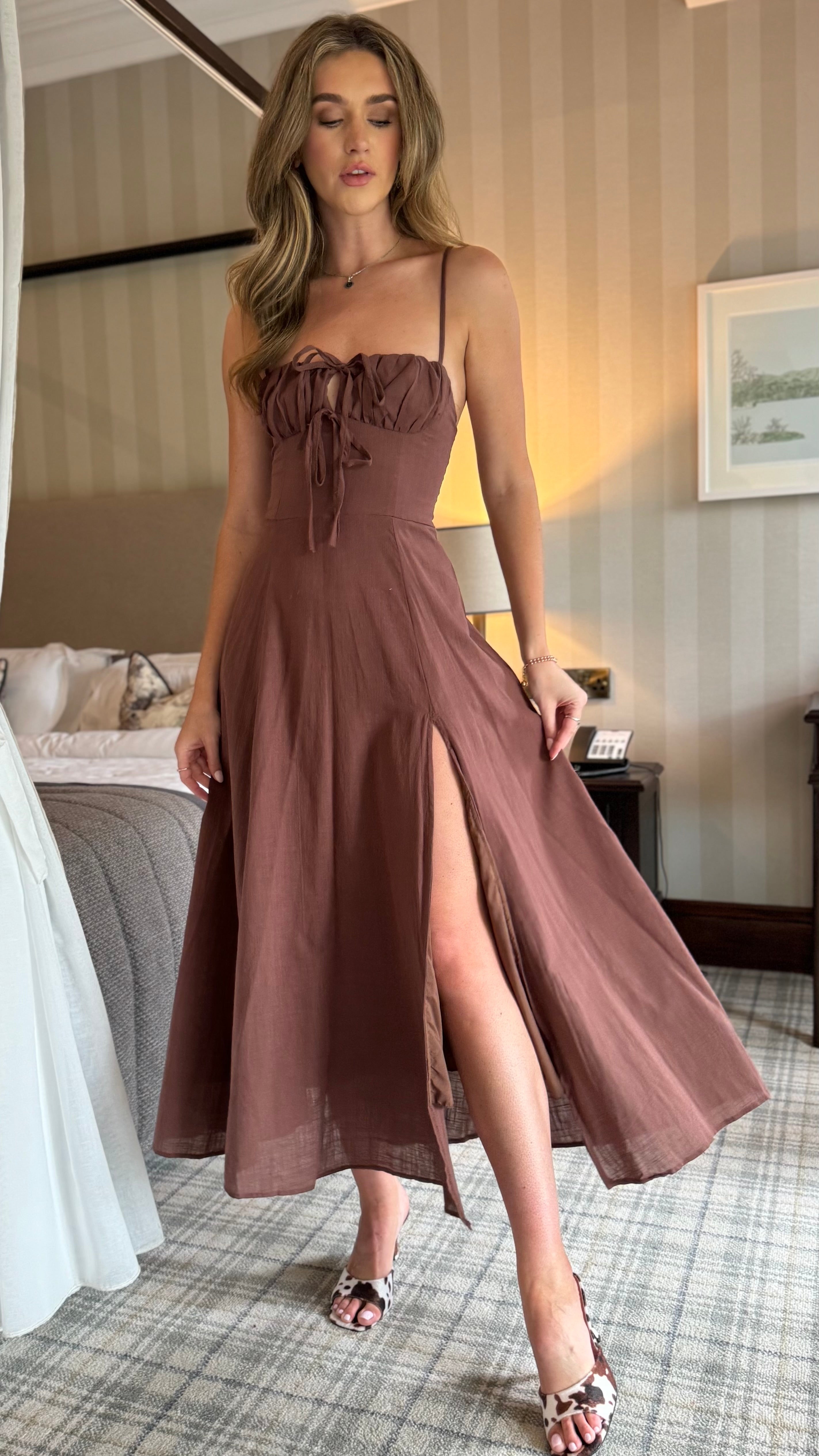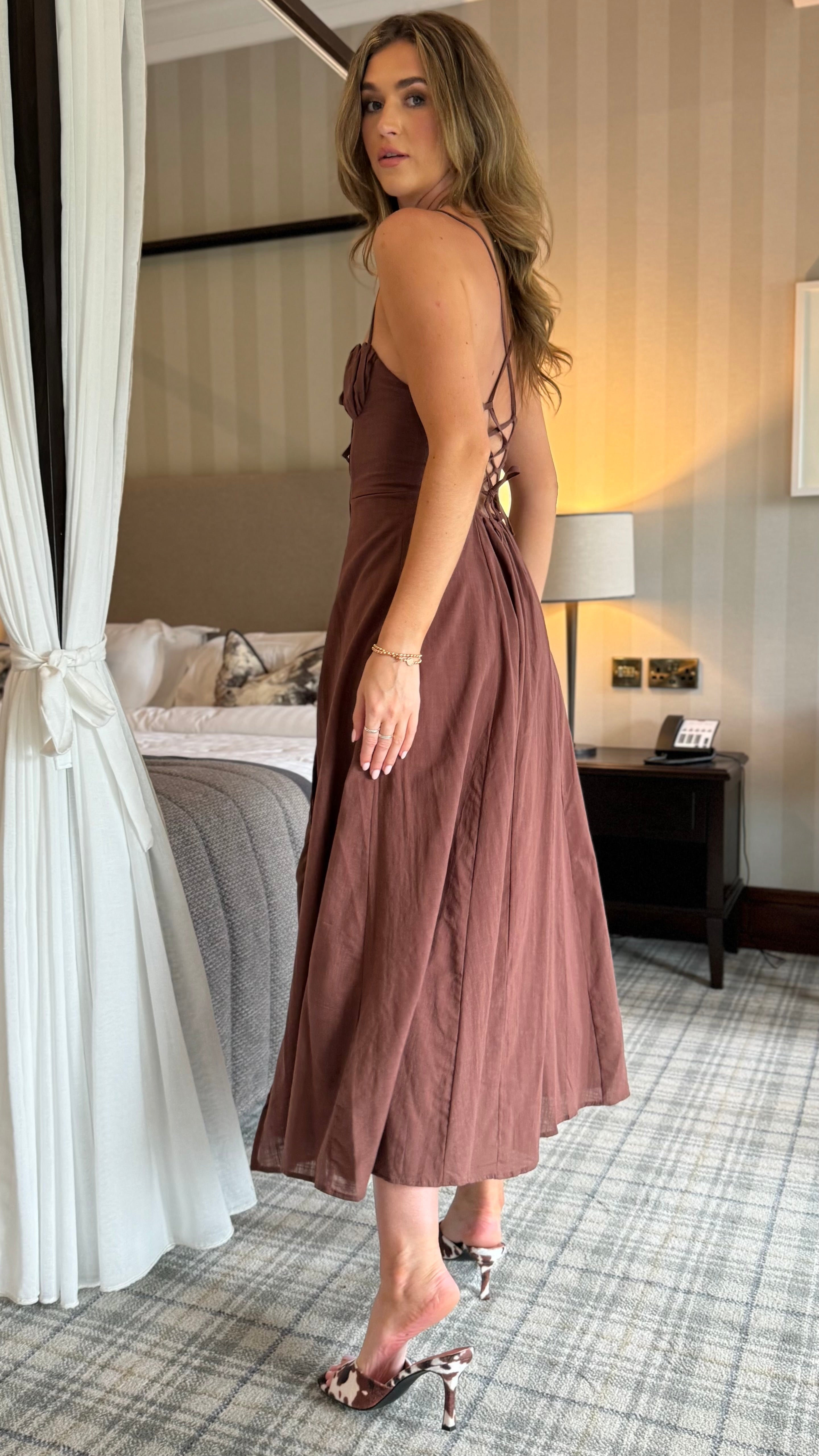 The Moxie Brown Milkmaid Midi Dress offers a refined silhouette with elegant detailing, perfect for those seeking a sophisticated look. Its midi length and tailored fit create a polished appearance suitable for both formal gatherings and stylish daytime wear. Elevate your wardrobe with this timeless piece that balances classic charm and modern grace.