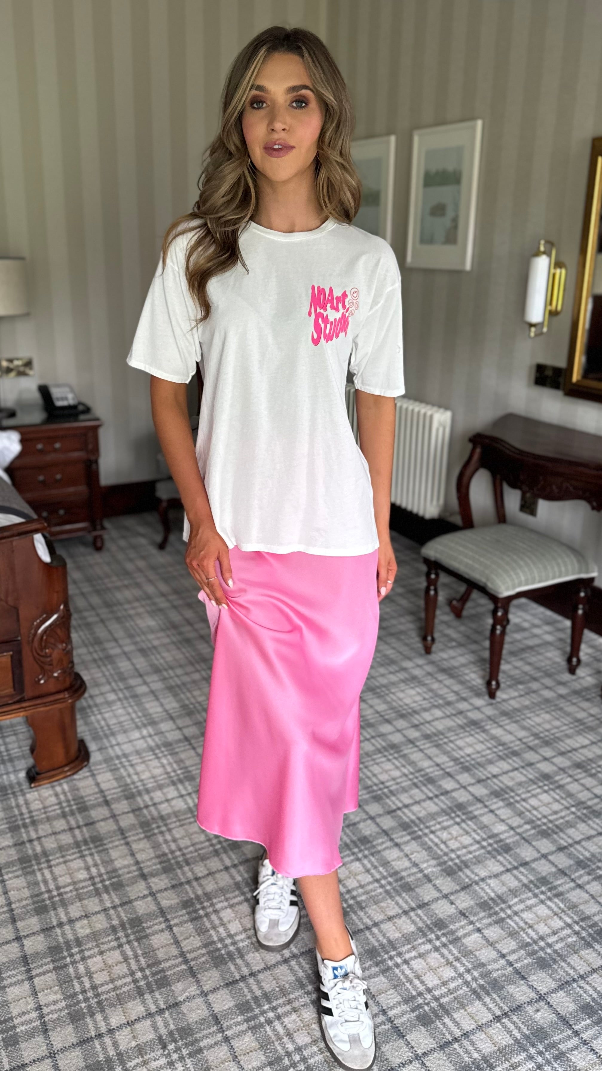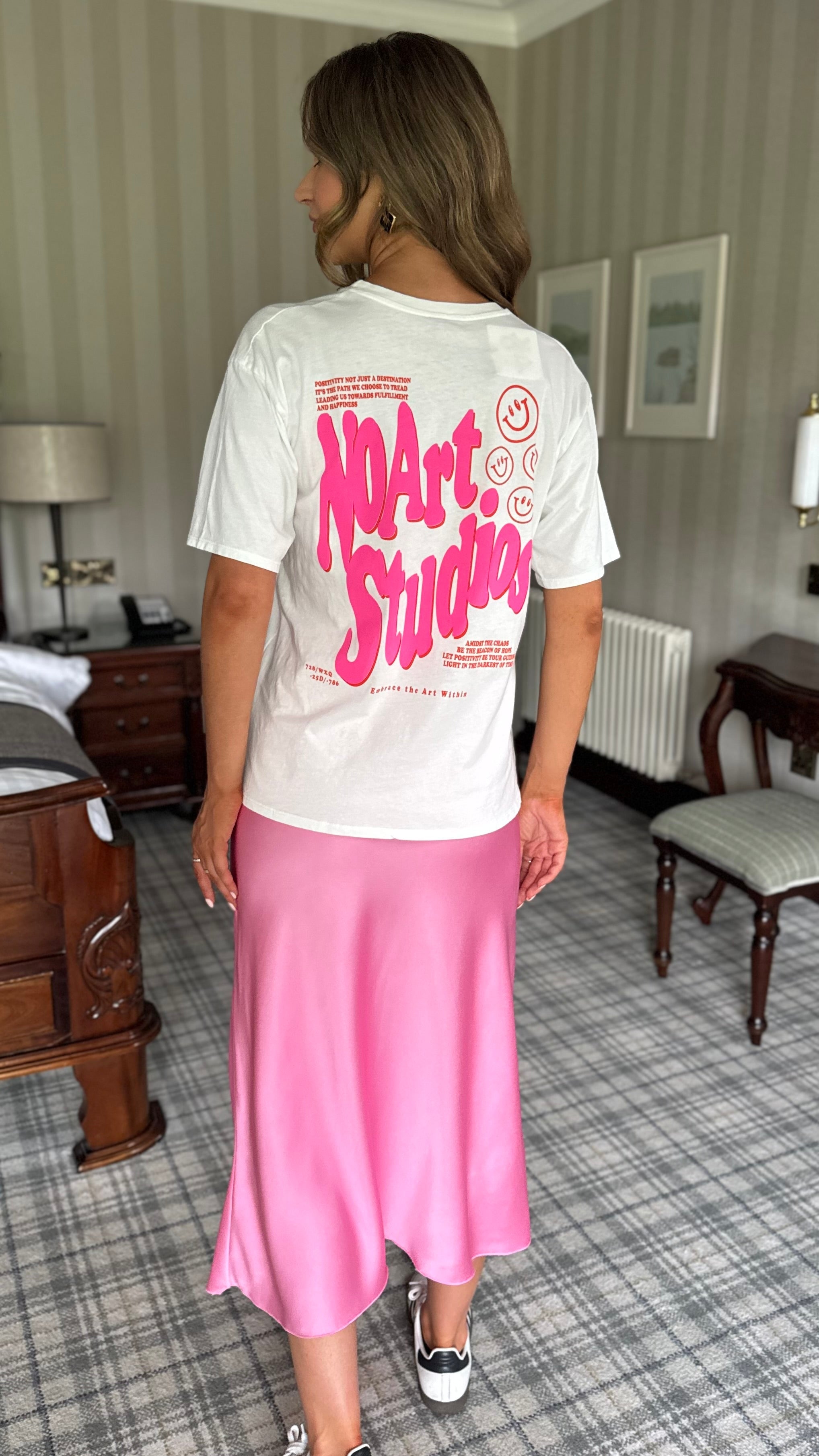 Stay stylish and comfortable with the Myla White & Pink No Art Studios Graphic T Shirt! 🌸 This soft, breathable tee features a unique graphic design that adds a fresh, artistic touch to your everyday look. Perfect for expressing your creativity while enjoying all-day comfort. Wear it with confidence and let your style shine! ✨