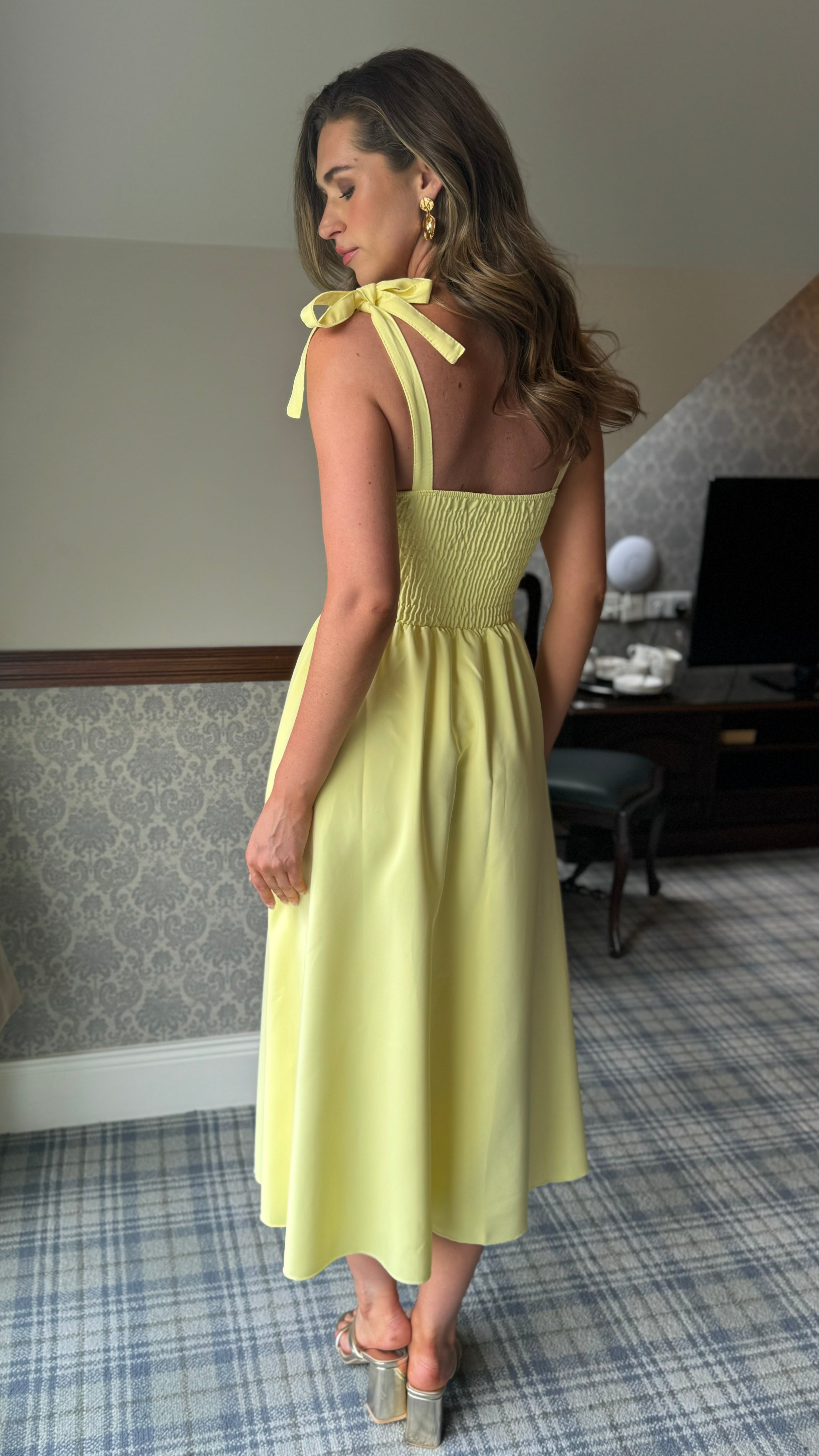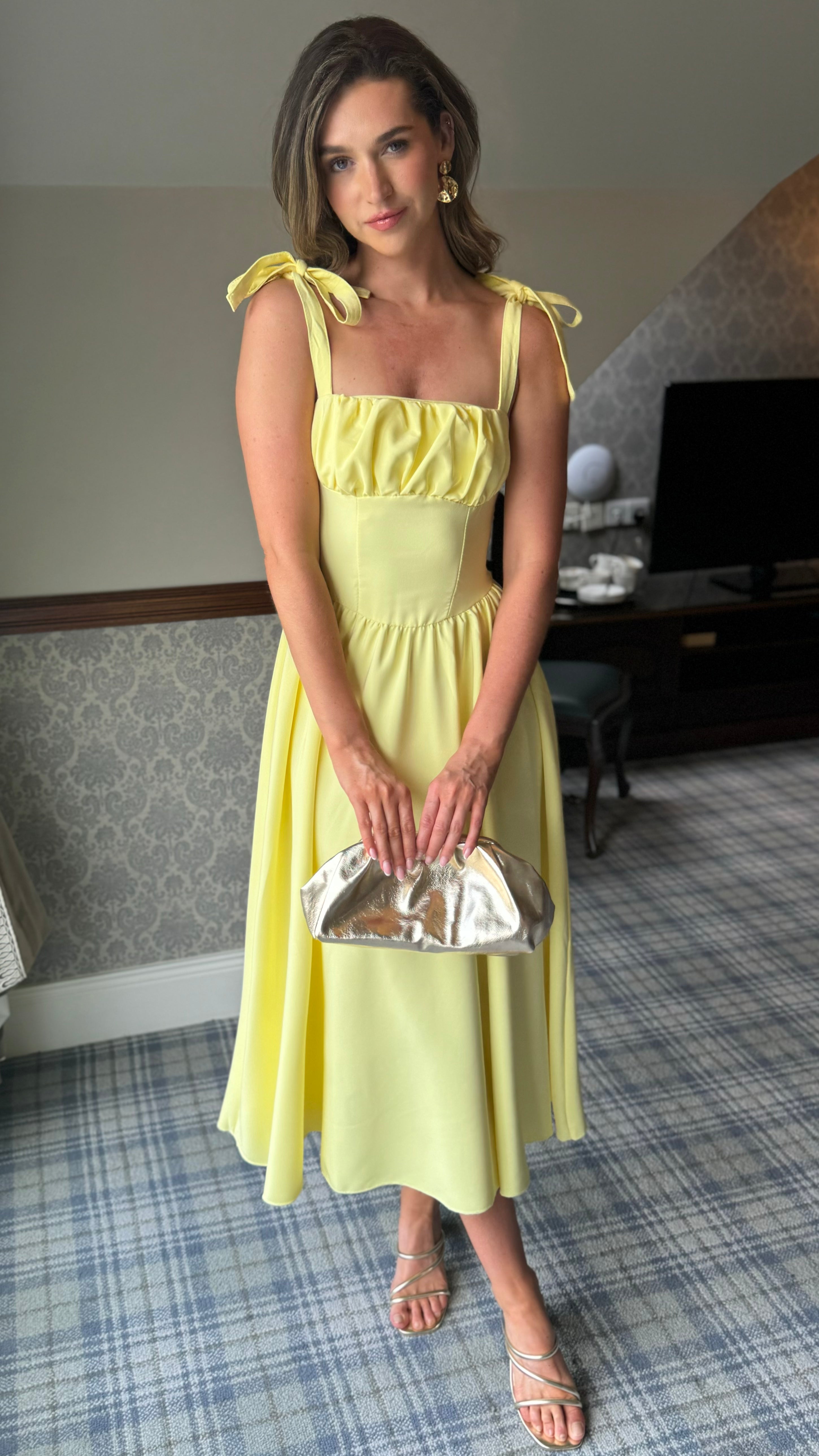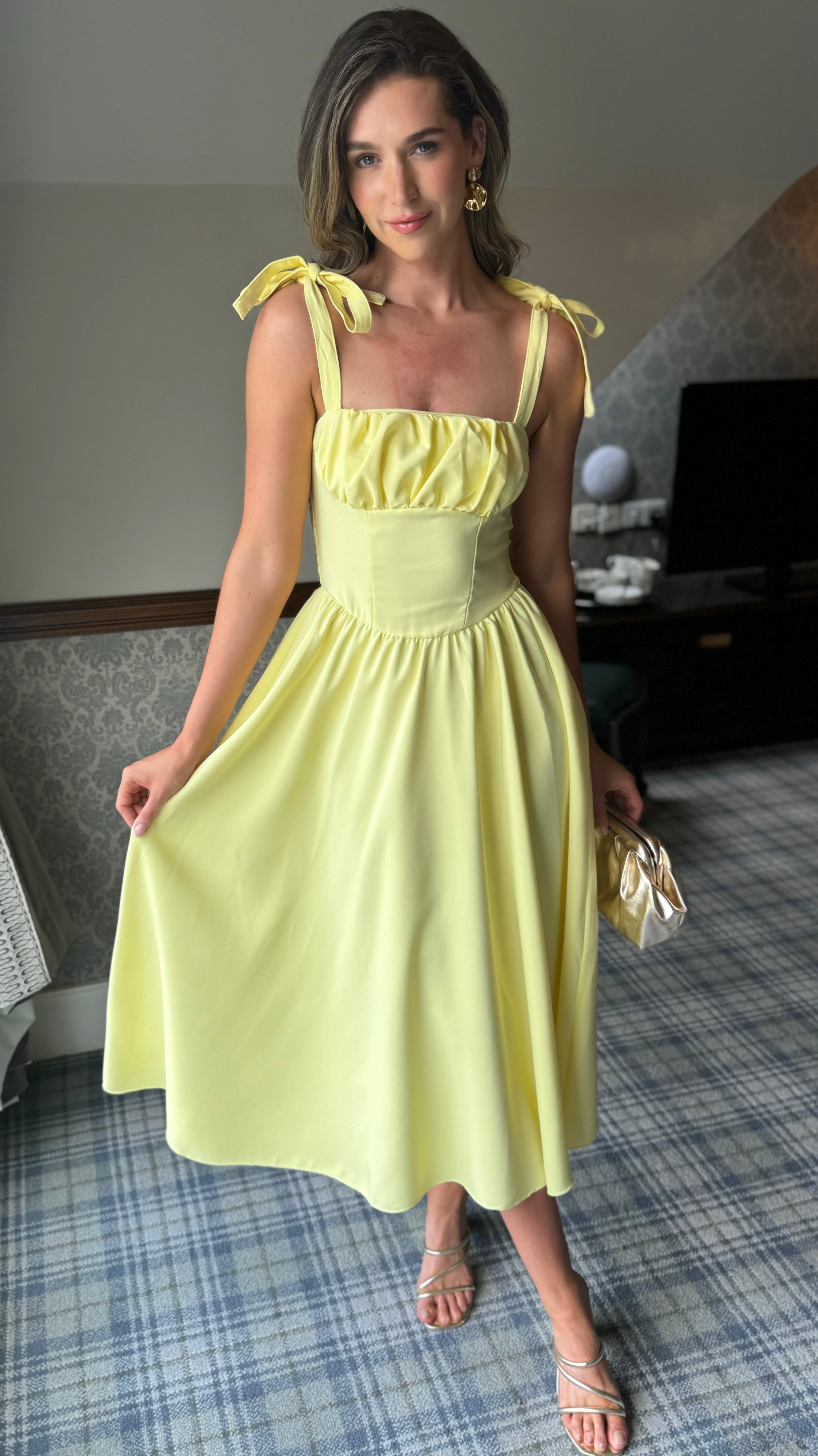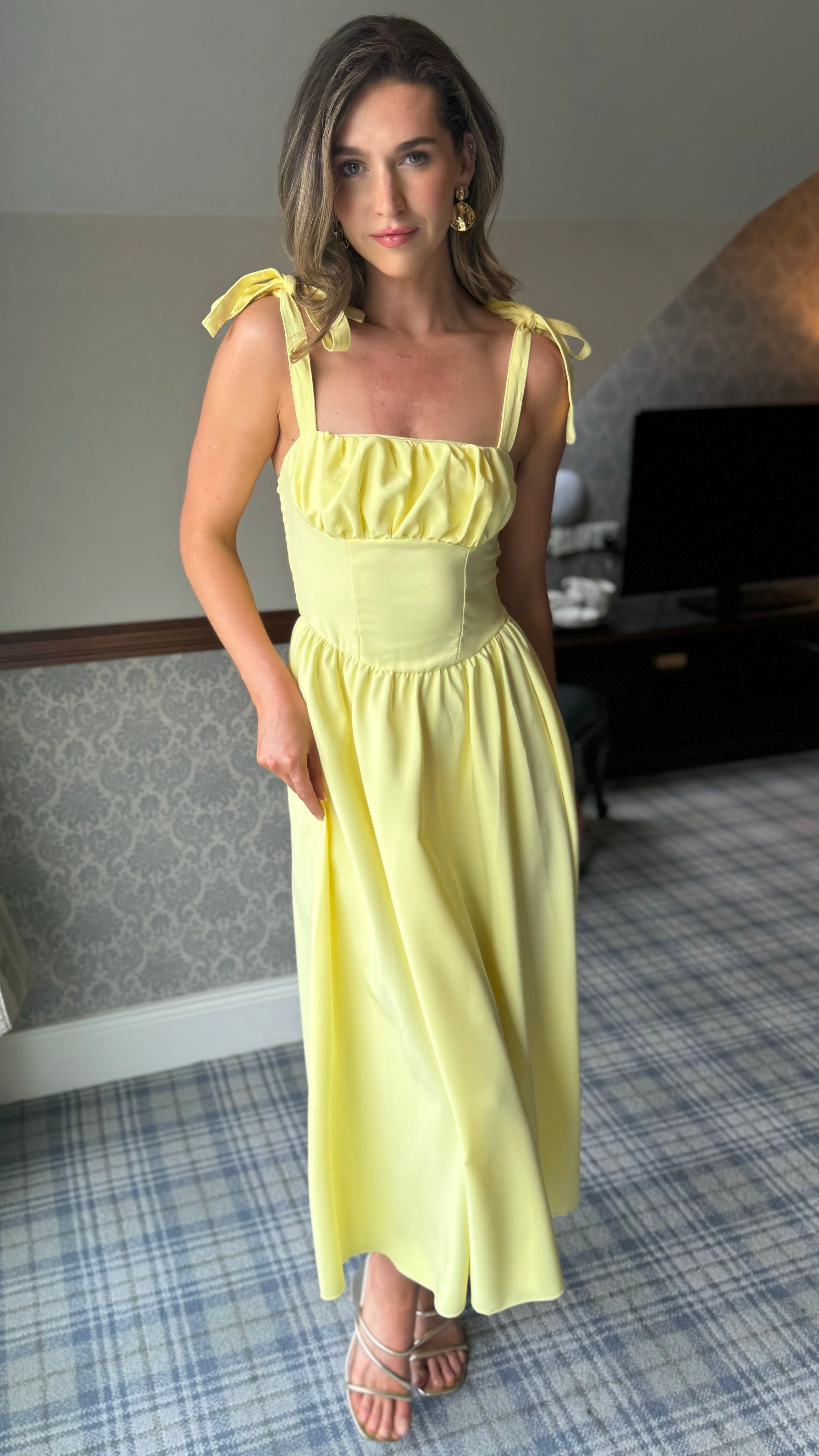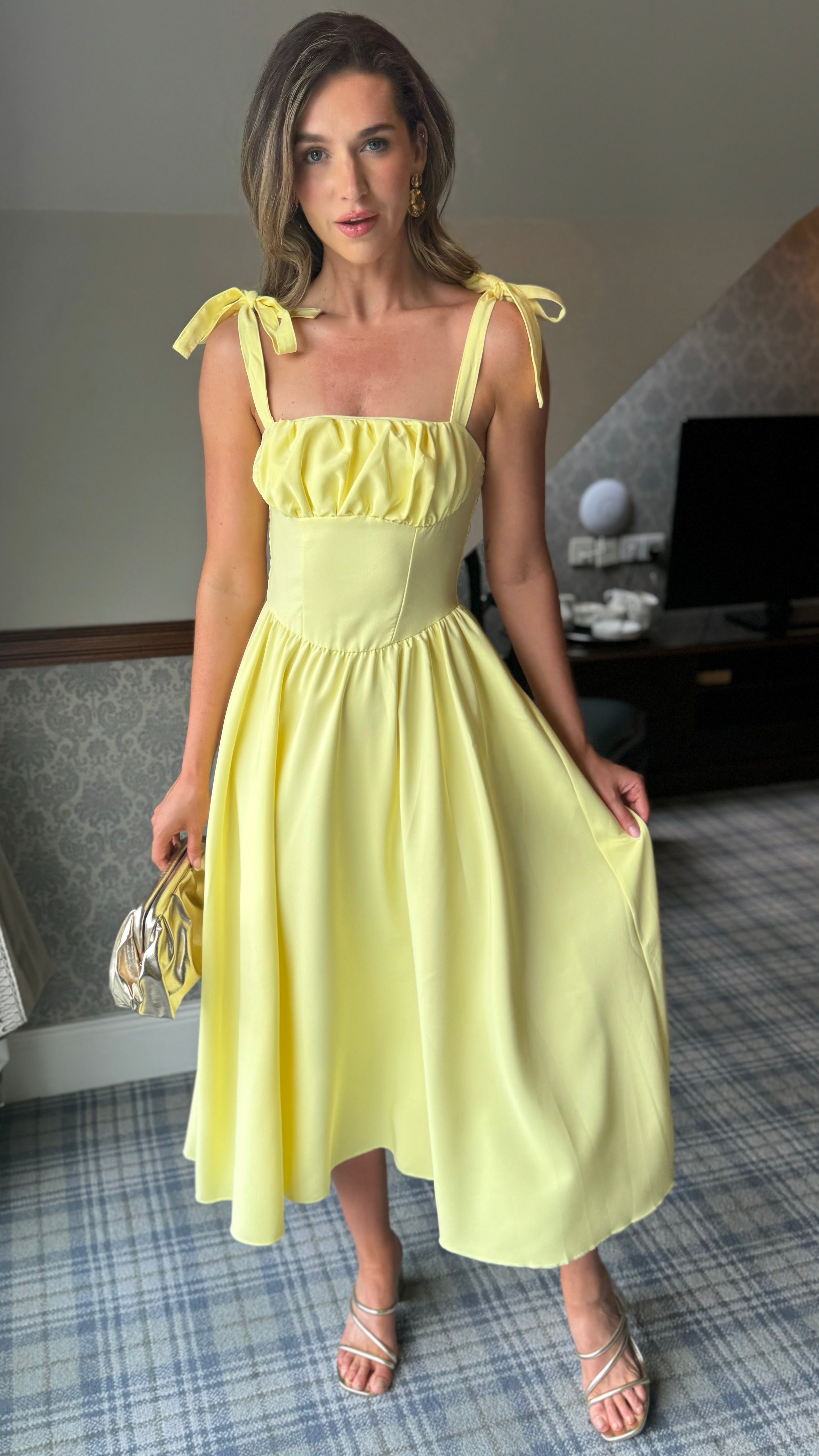 Get ready to turn heads with our Nigella Yellow Tie Detail Strap Midi Dress! The playful tie detail strap and ruched pleat bust add unique touches to this flowy dress. The elasticated bodice ensures a comfortable fit, while the full skirt adds a touch of drama. Perfect for any occasion! 🌼