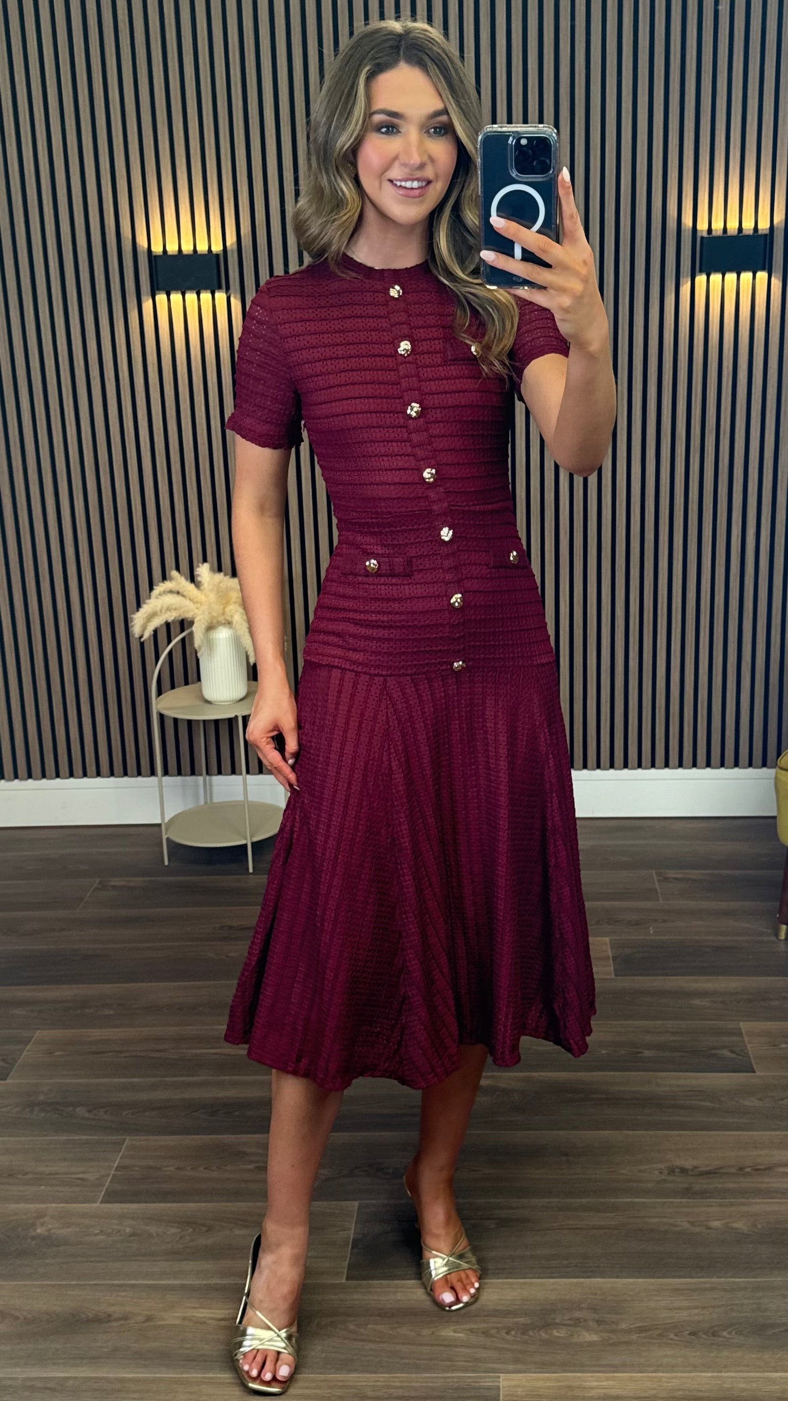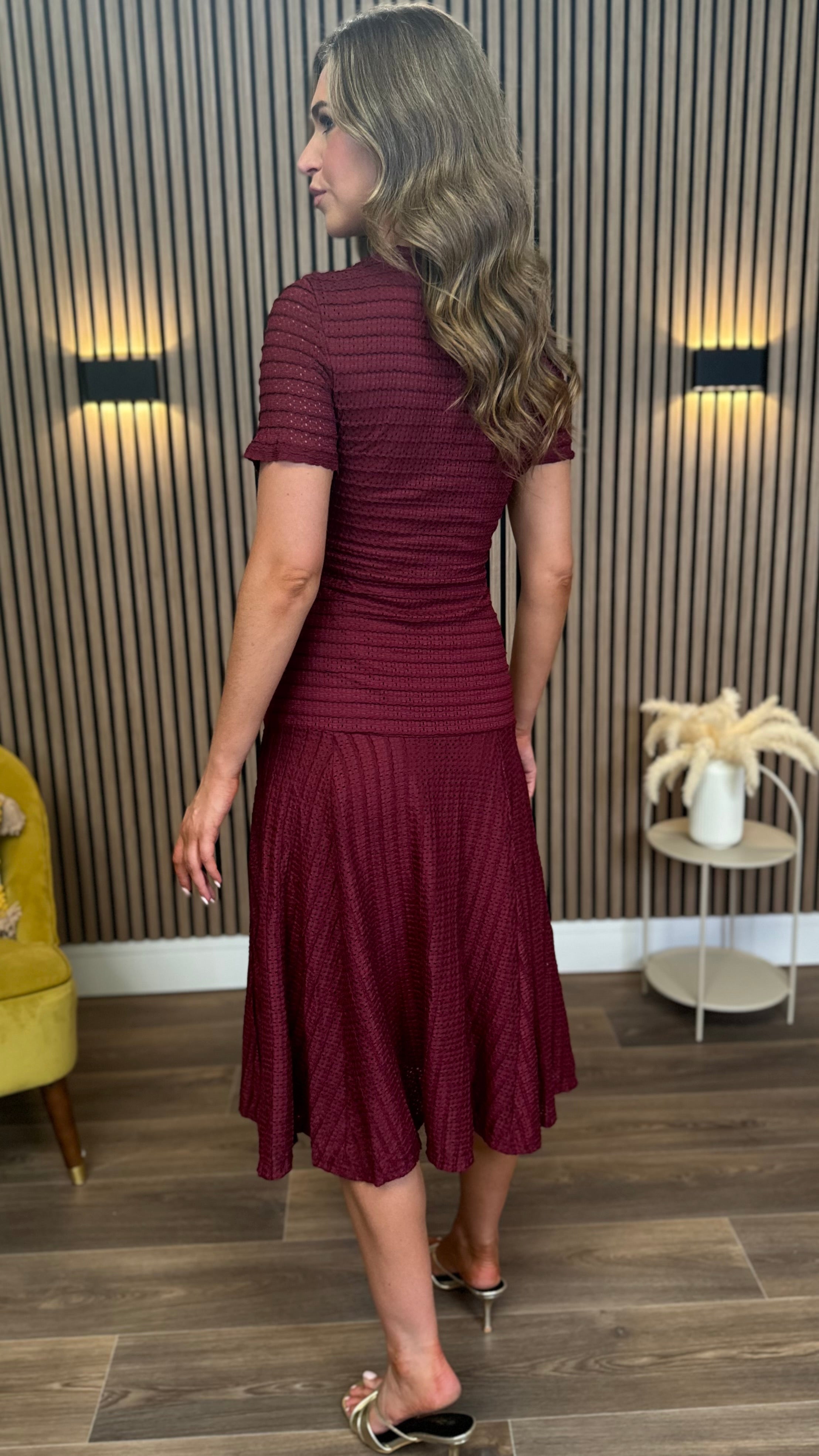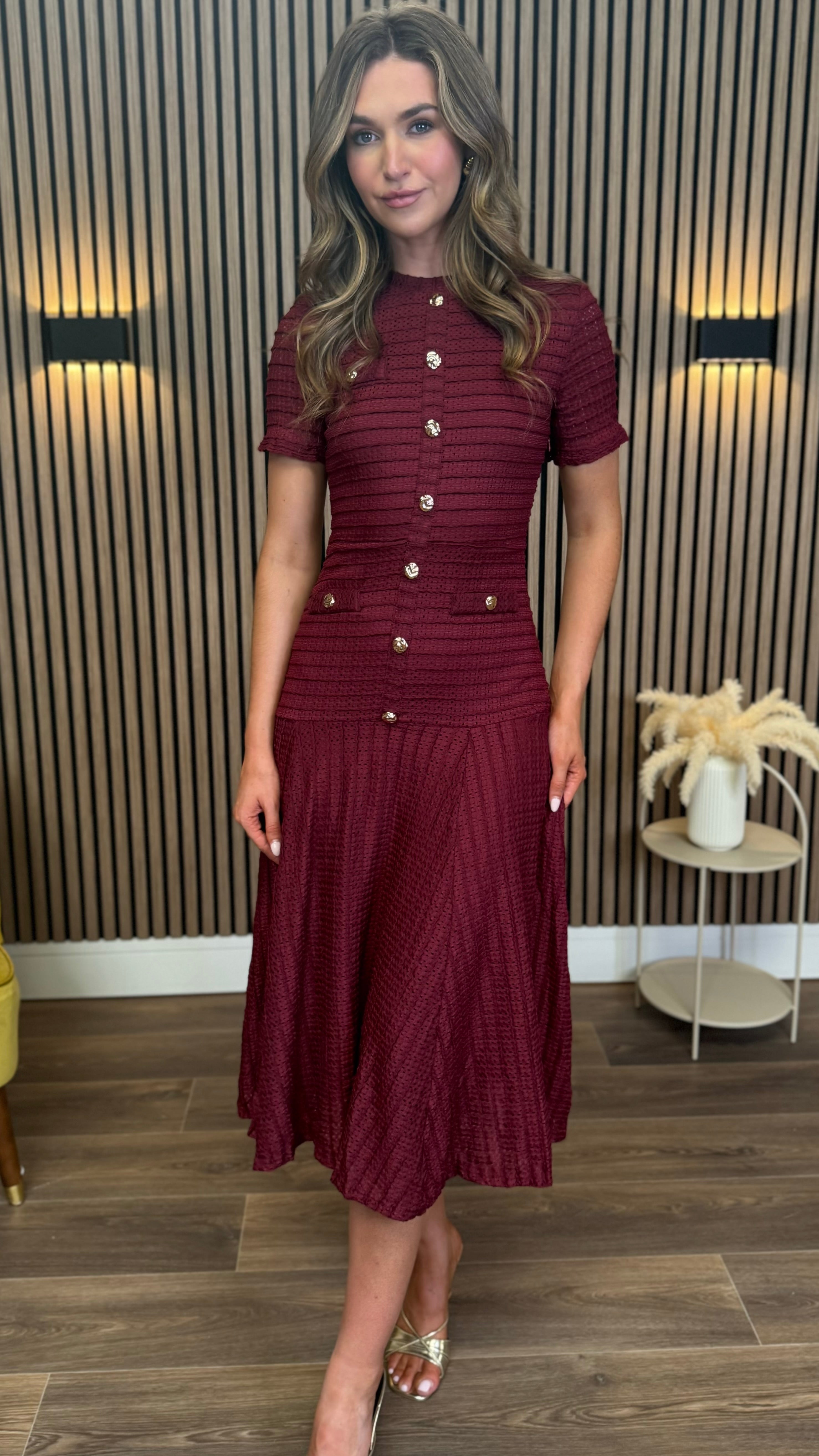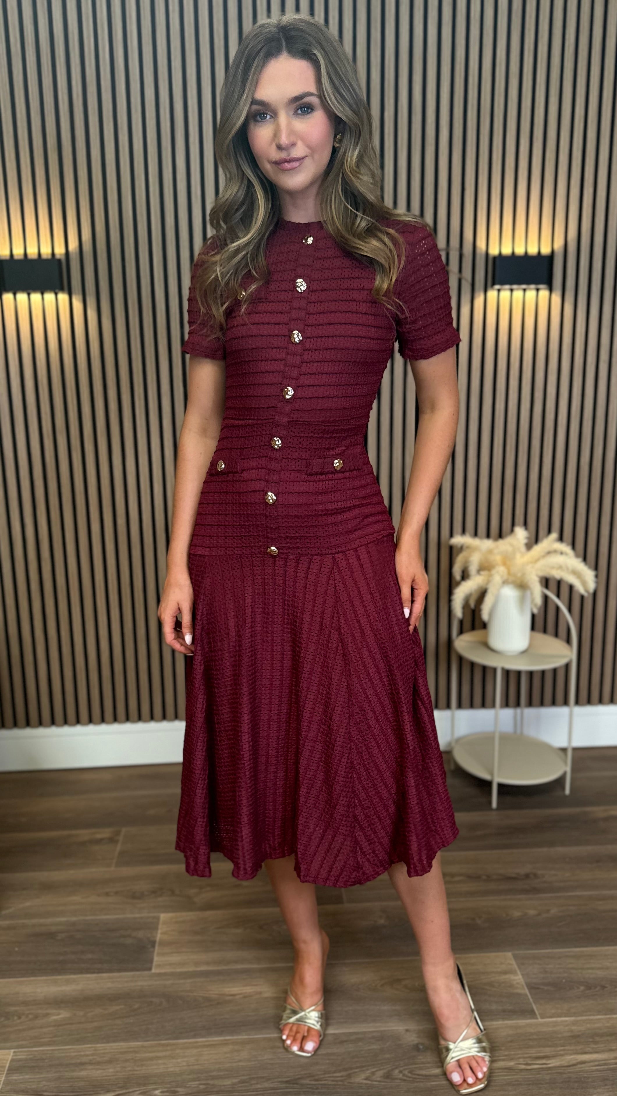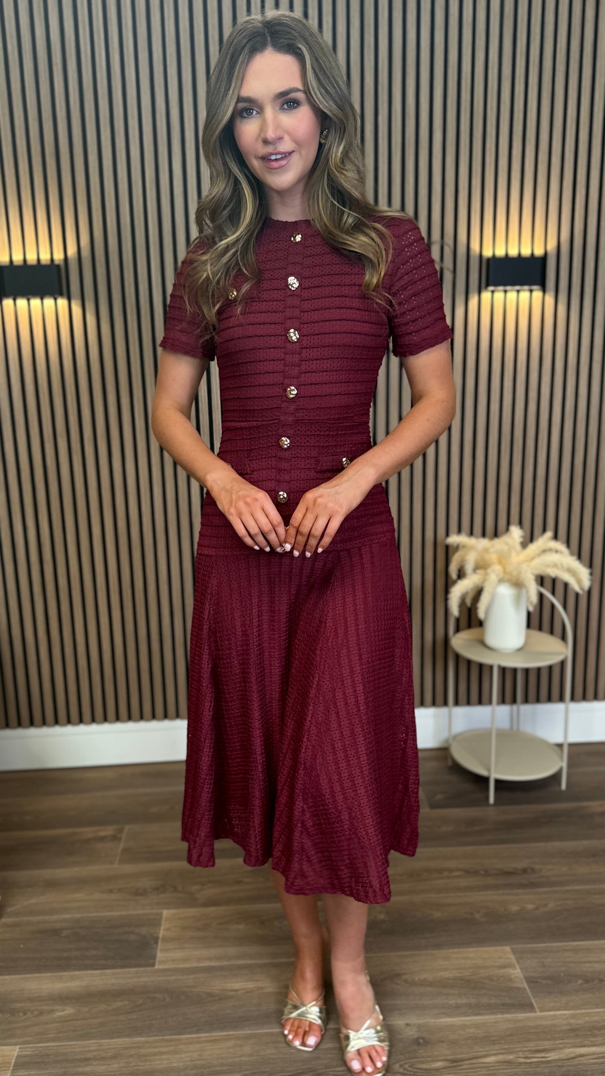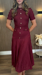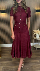 Phil Burgundy Textured Button Detail Midi Dress