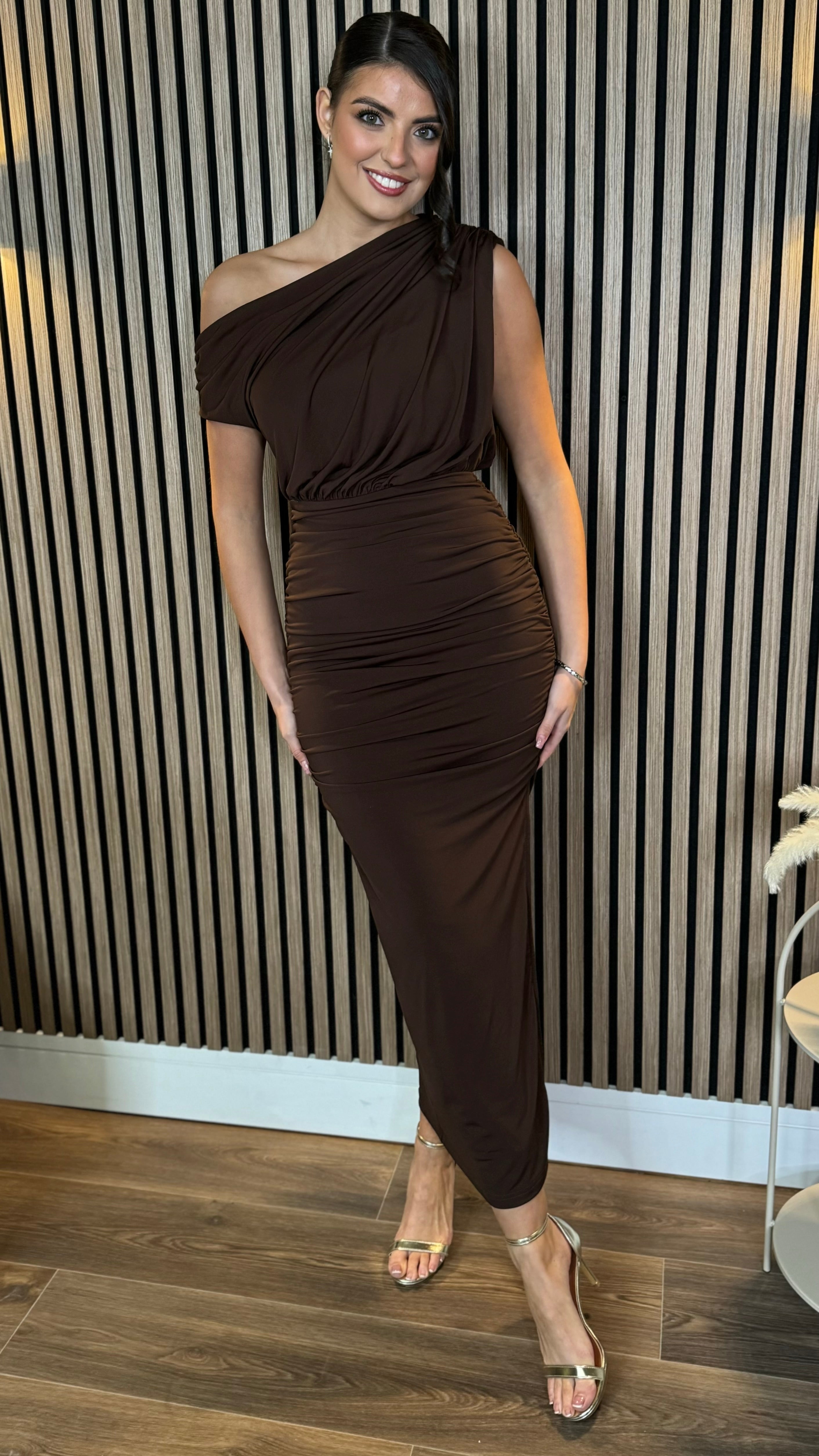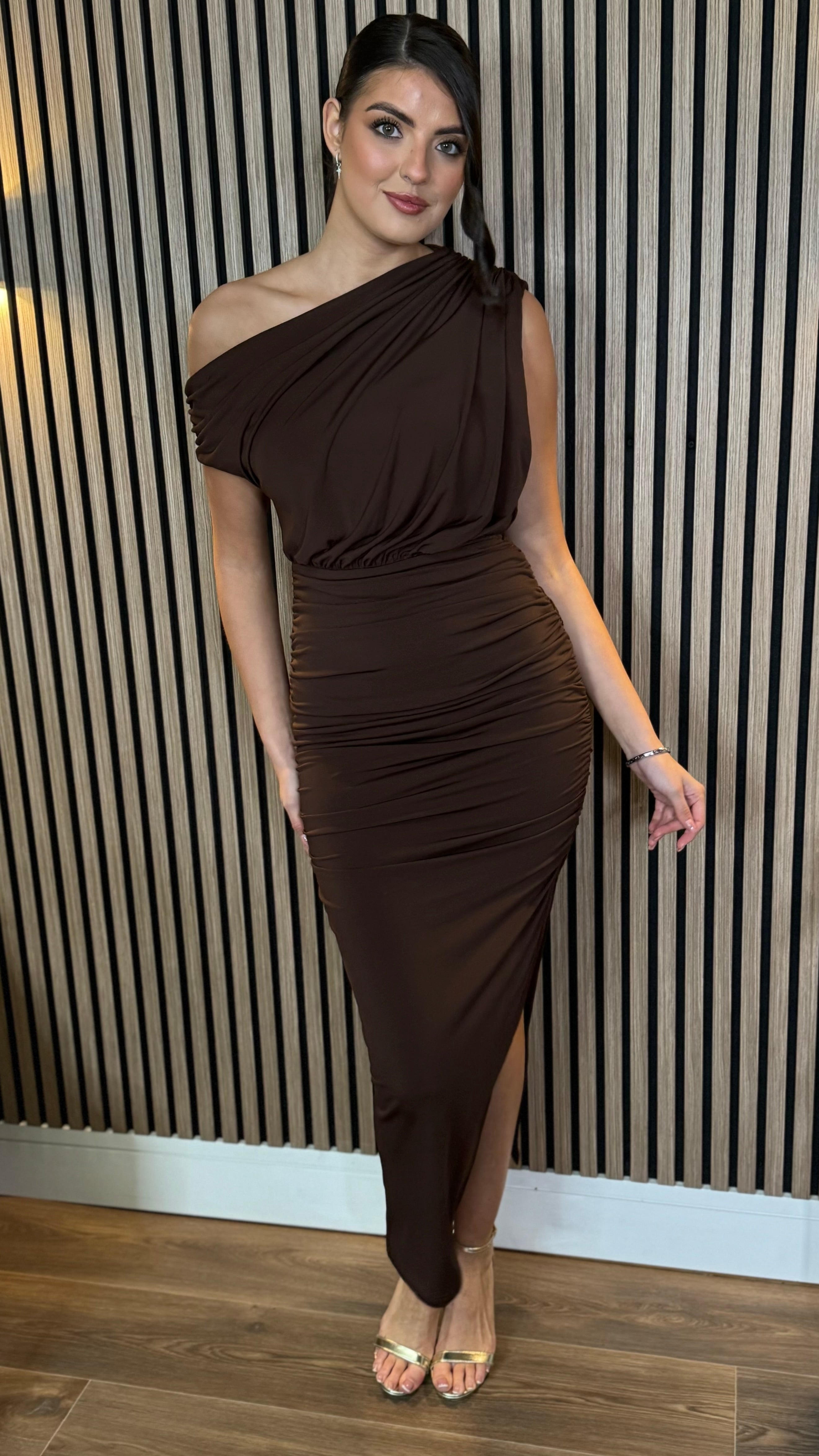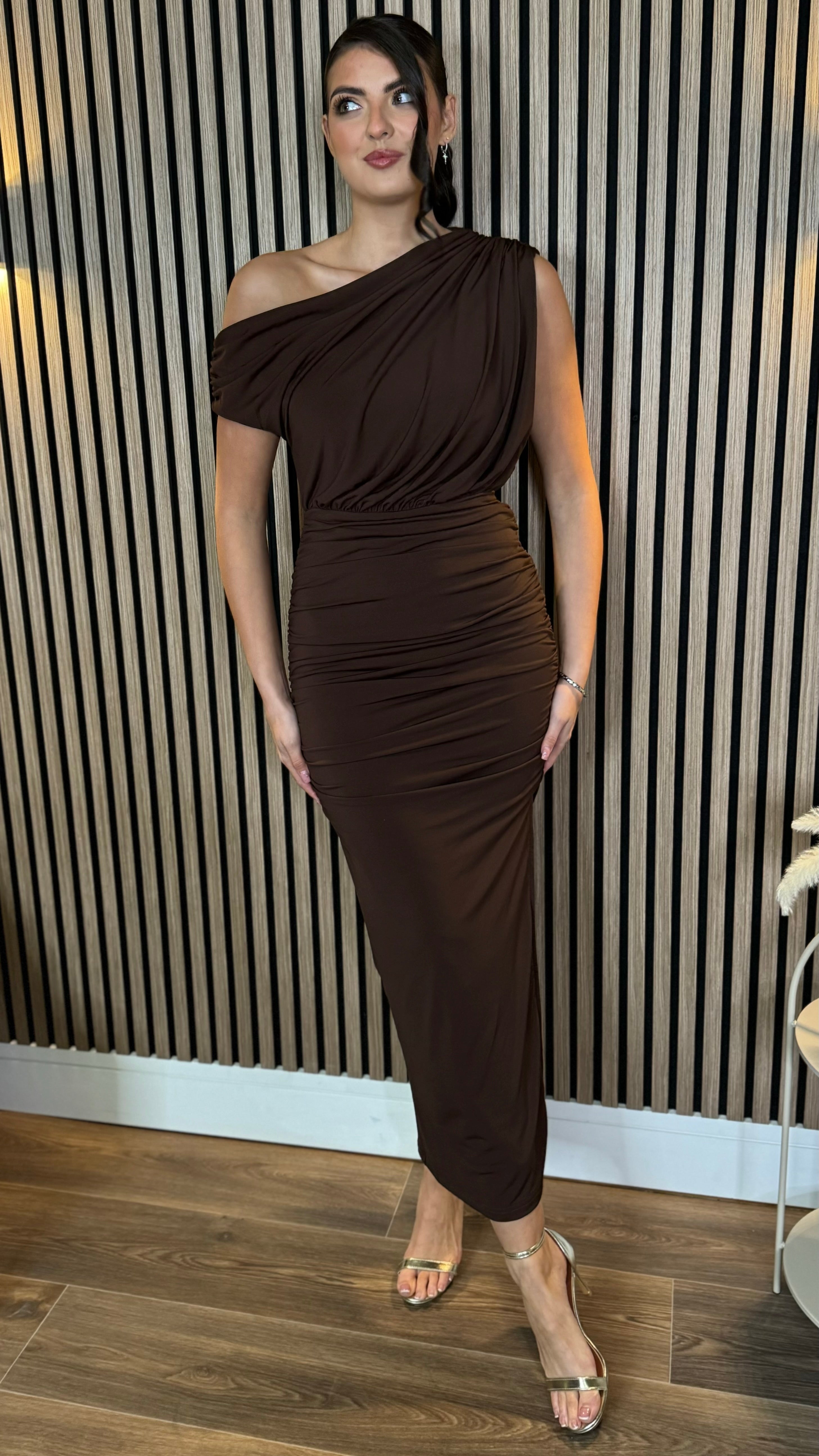 Presley Chocolate Off The Shoulder Draped Top Midi Dress