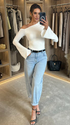 Unleash your edgy side with the Priya Asymmetric Long Sleeve Top! This playful piece features a chic asymmetric neckline that adds instant edge, paired with flattering bell sleeves for a touch of retro flair. Crafted from soft, stretchy fabric, it moves with you all day. Perfect for dressing up or down, this versatile top brings attitude and comfort together in one fabulous package.
