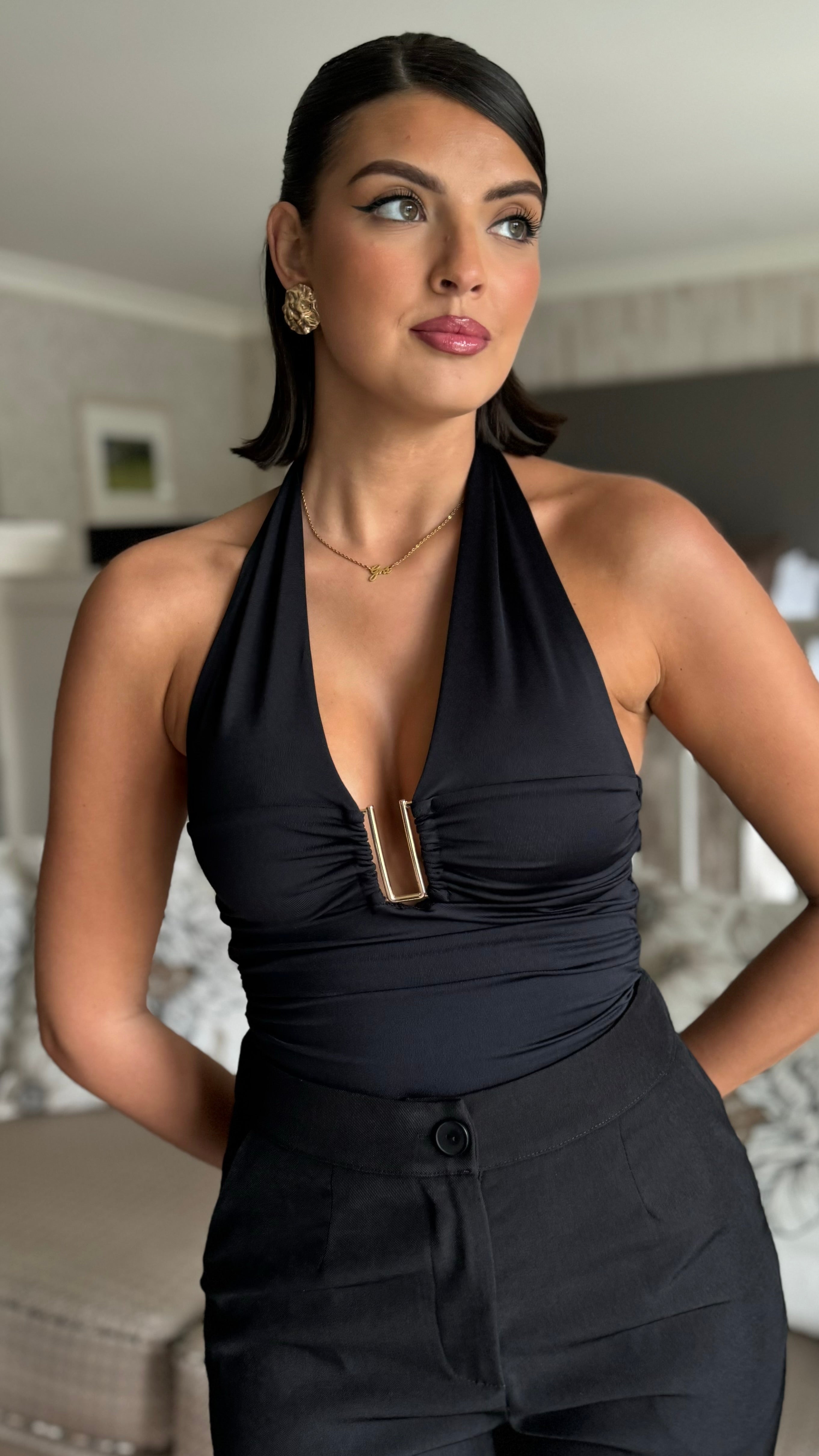 Striking halterneck top with a daring plunge neckline and a distinctive gold bar detail at the bust. Ties securely at the back of the neck for a flattering, adjustable fit. The leopard print adds edge and versatility to your wardrobe, pairing effortlessly with tailored trousers, skirts, or layered under sheer pieces. A contemporary essential for confident styling.