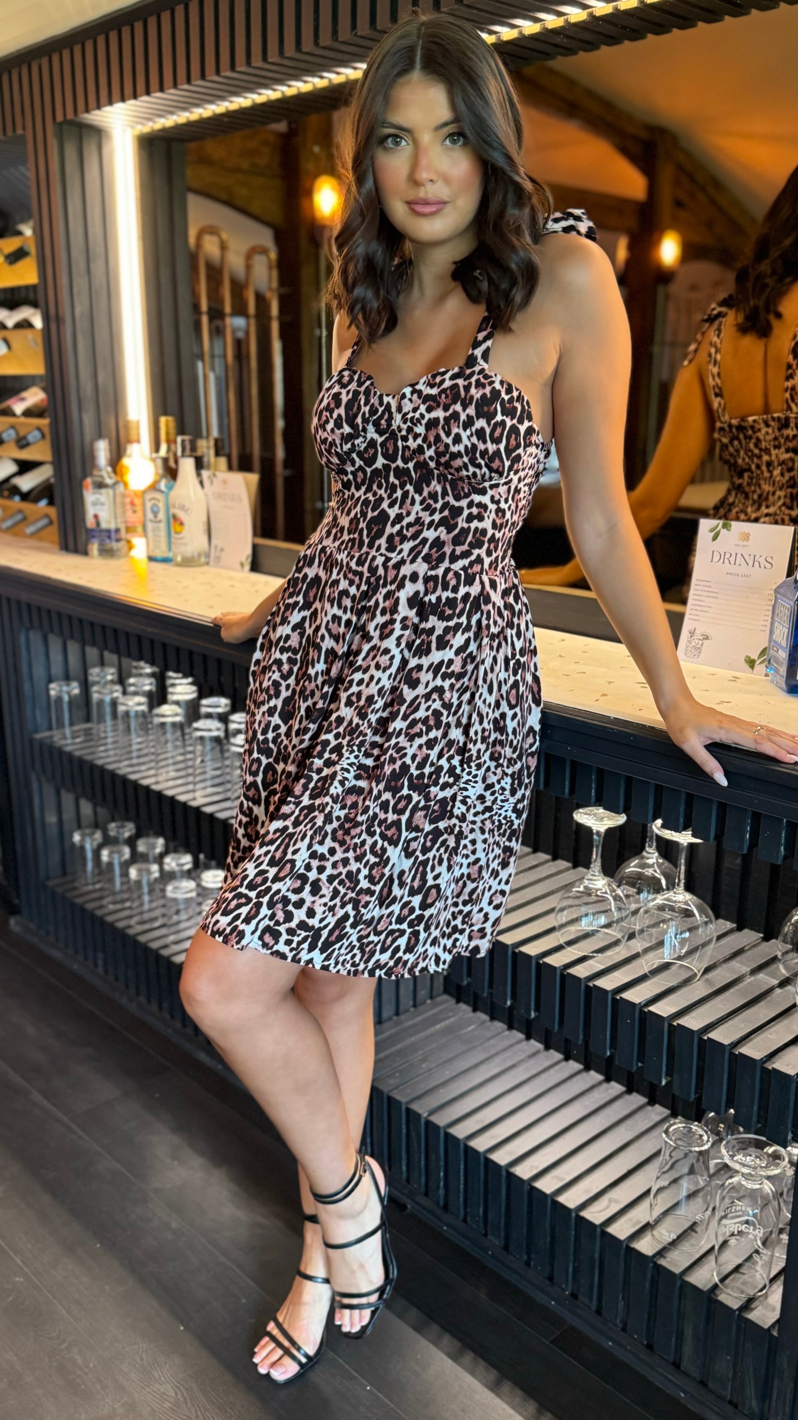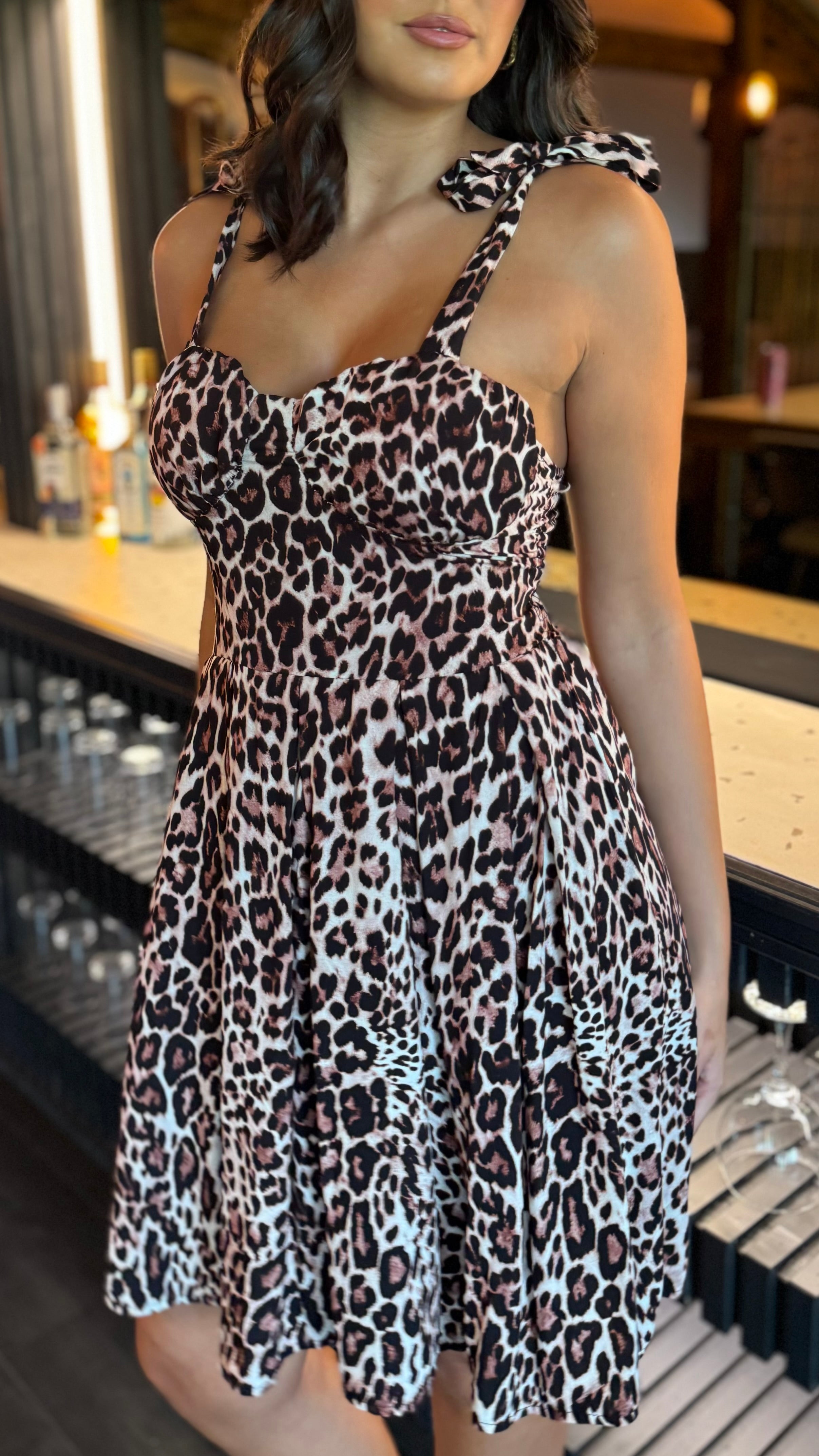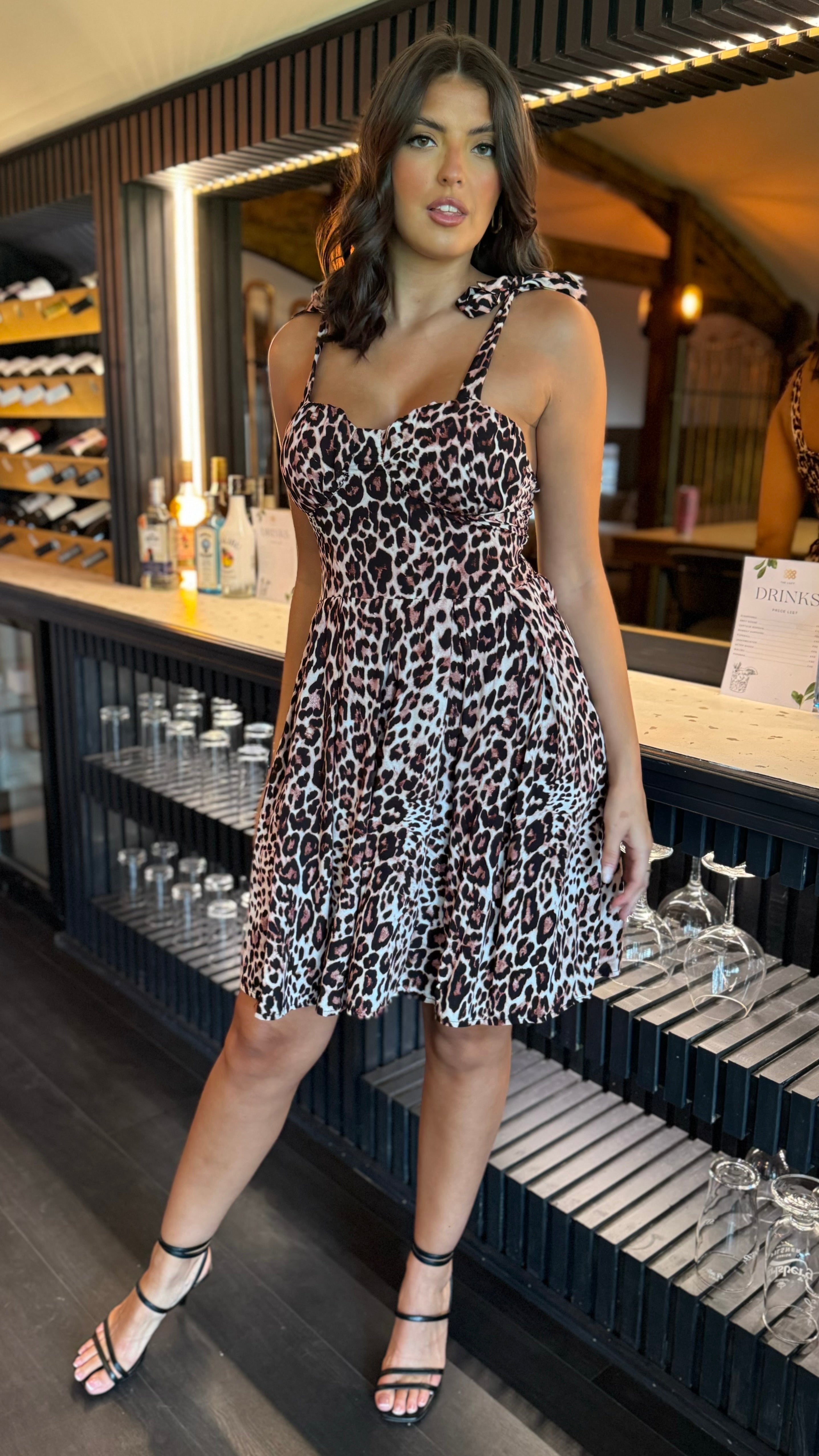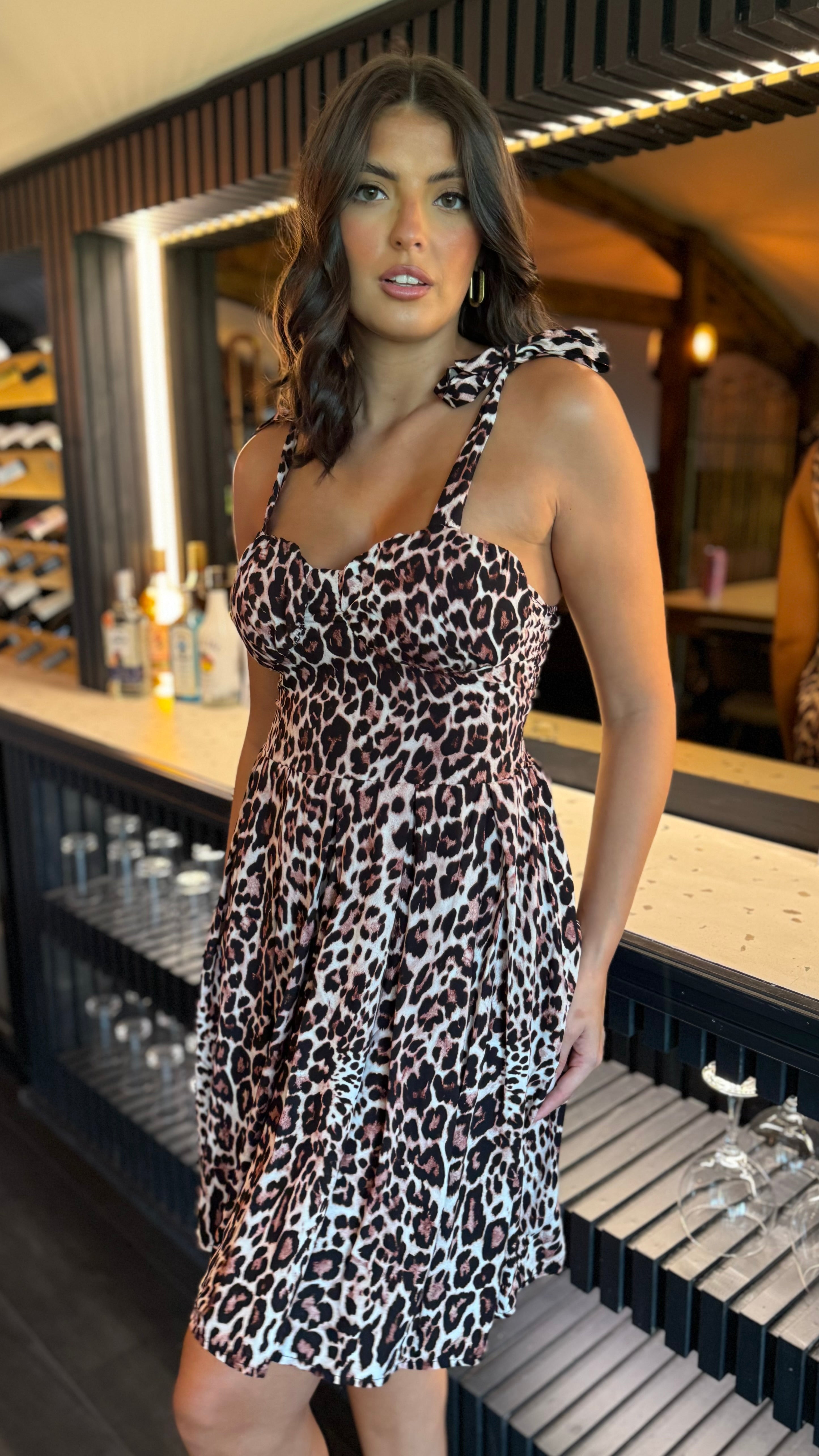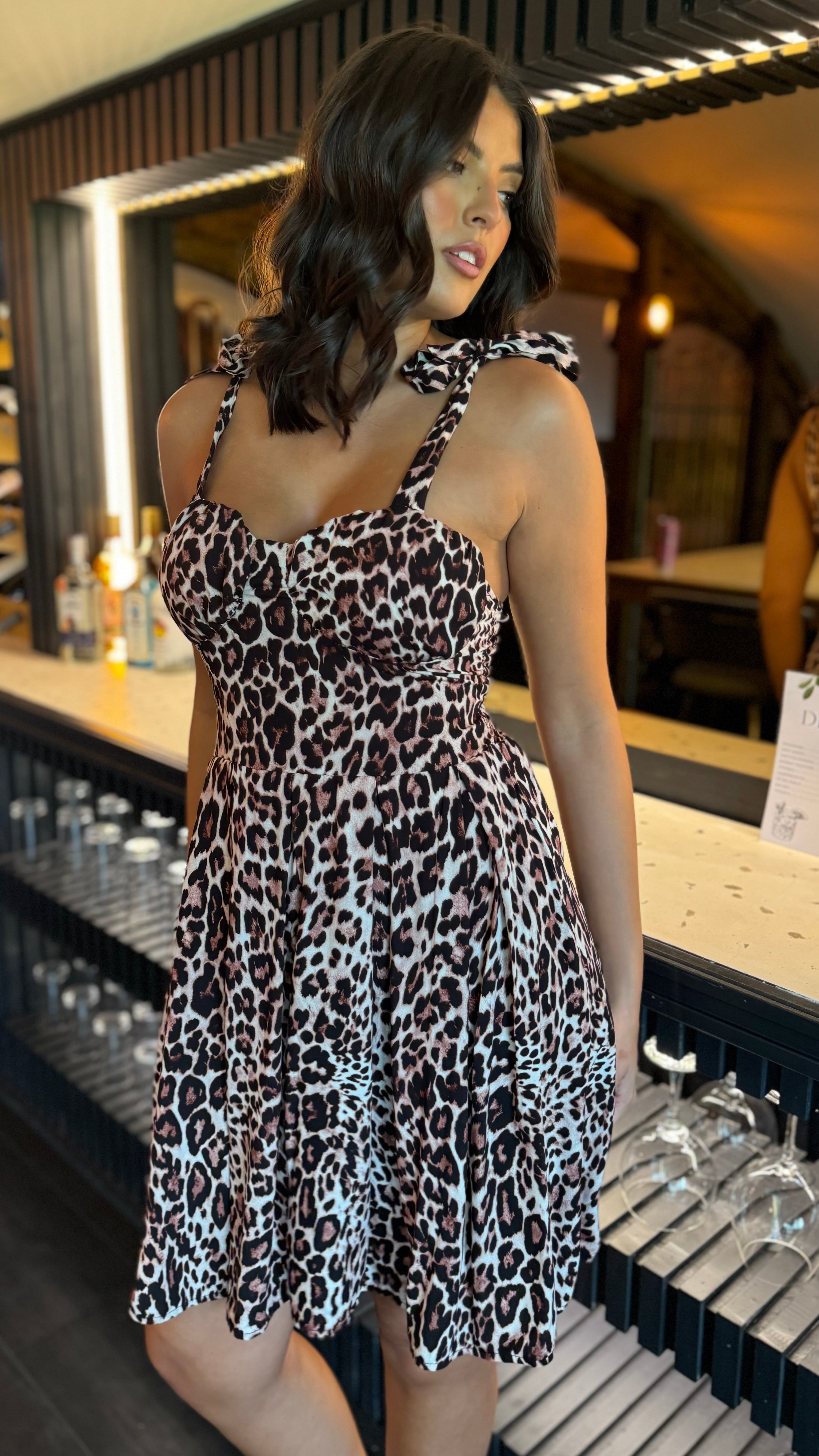 Raegan Beige & Black Leopard Print Tie Shoulder Cupped Mini Dress