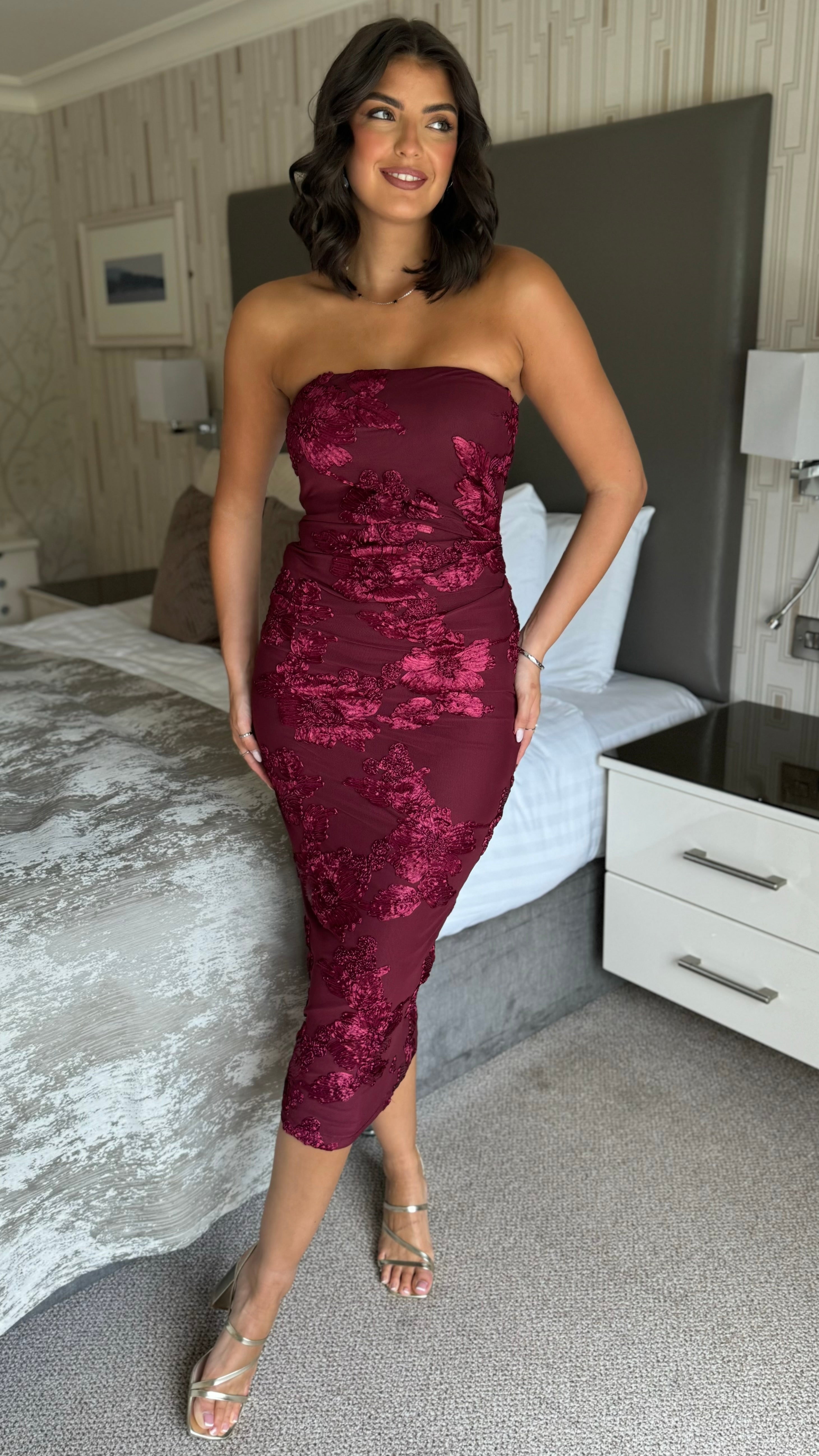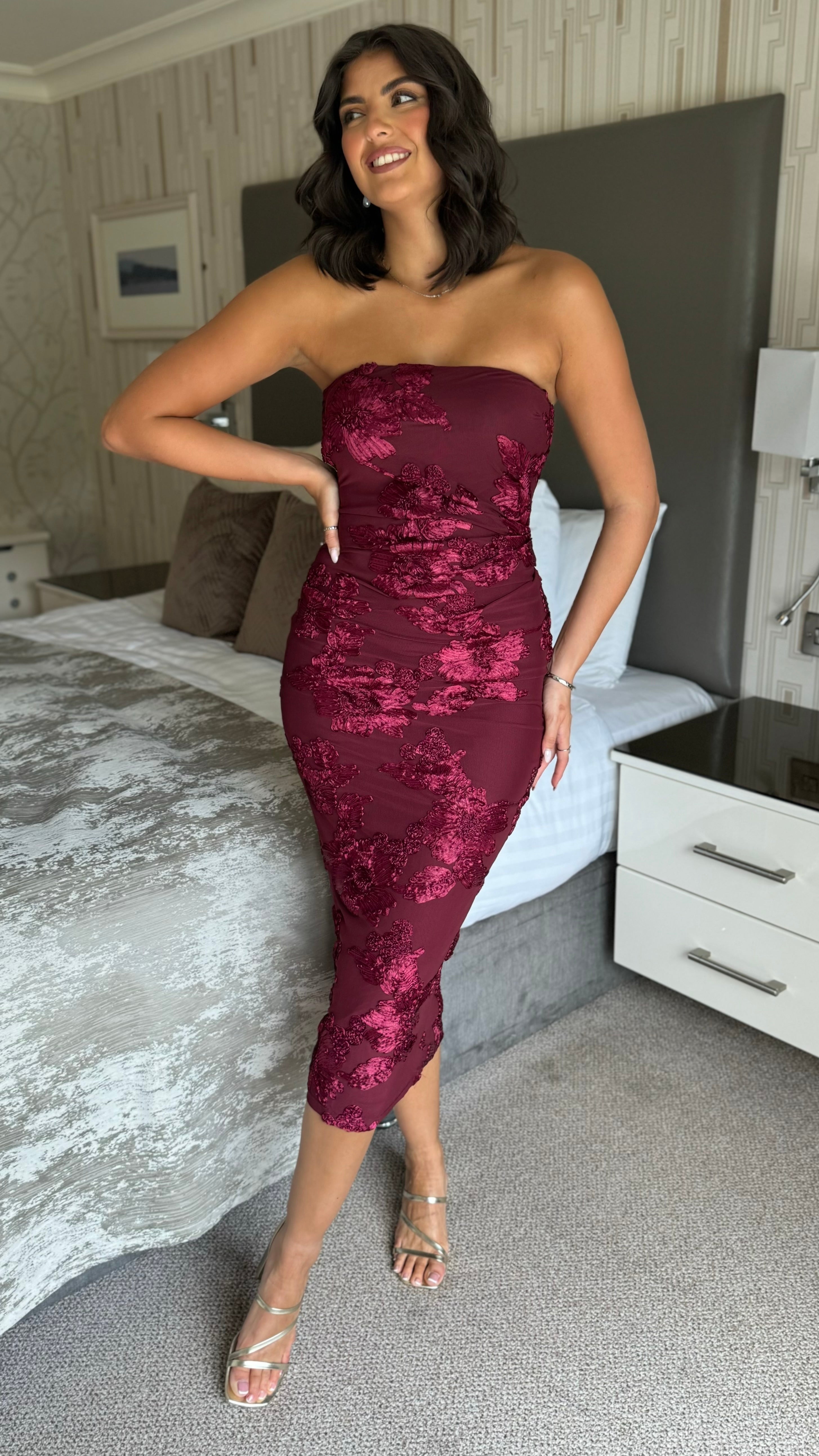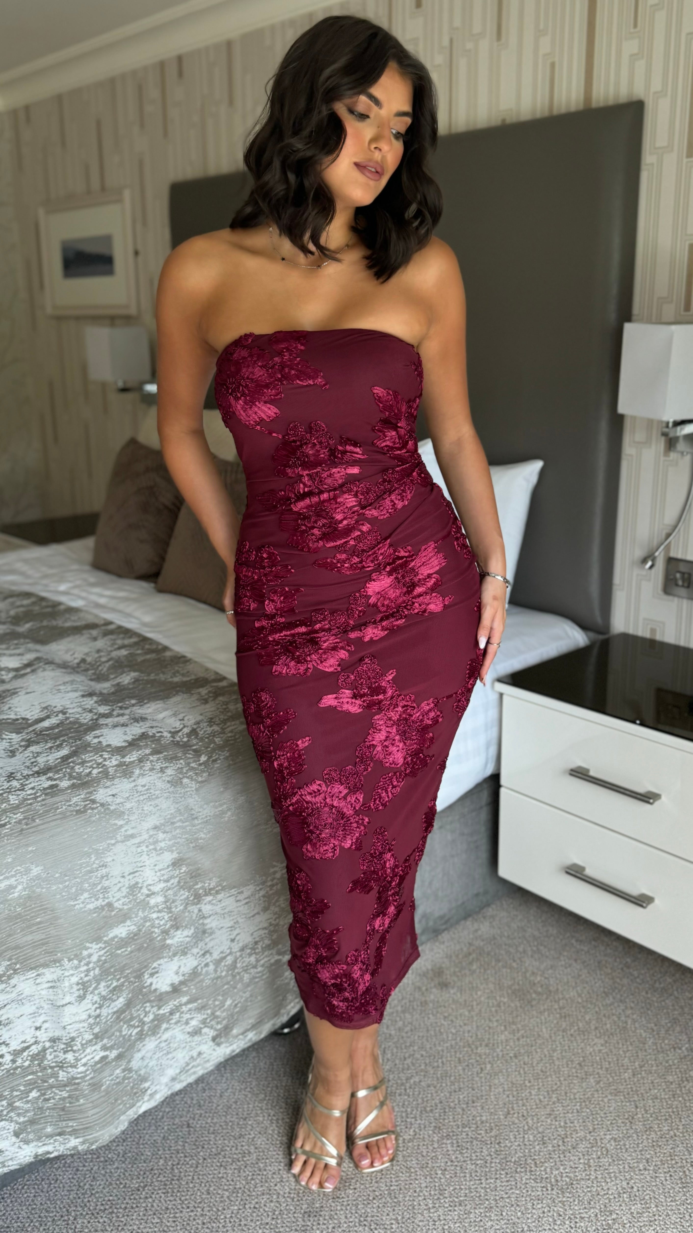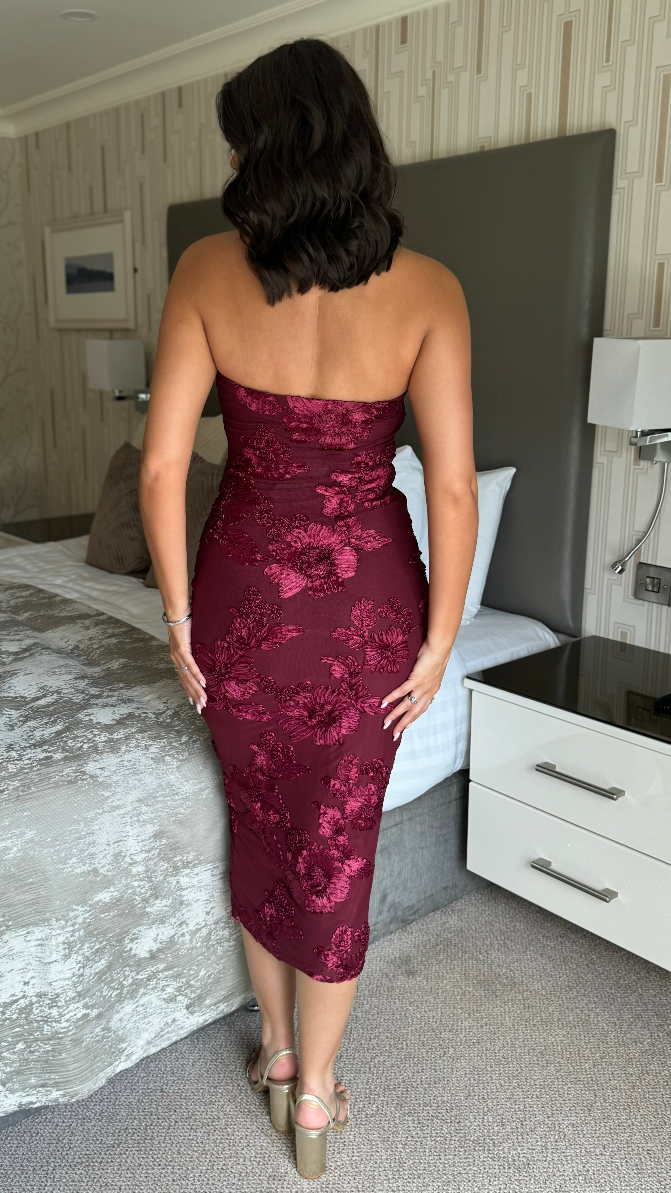The Rayanne Cherry Floral Strapless Midi Dress combines classic elegance with modern design. Its strapless silhouette highlights the shoulders, while the midi length offers a poised and graceful look. Adorned with a subtle cherry floral print, this dress brings a refined touch of nature-inspired beauty to your ensemble. Ideal for formal events or stylish daytime occasions, it promises both comfort and sophistication.