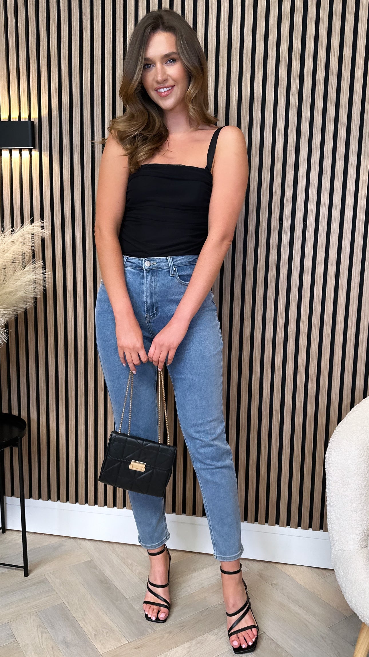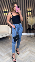 Get ready to turn heads in our Renata Black Corset Detail Top! Made from soft mesh in a stunning midnight black, this top features a square neckline, double straps, and a corset bodice to accentuate your figure. With a back zip for support, it's perfect for a night out with the squad or a VIP event. Dress it up with jeans or a skirt and slay the new season! 💃🏽