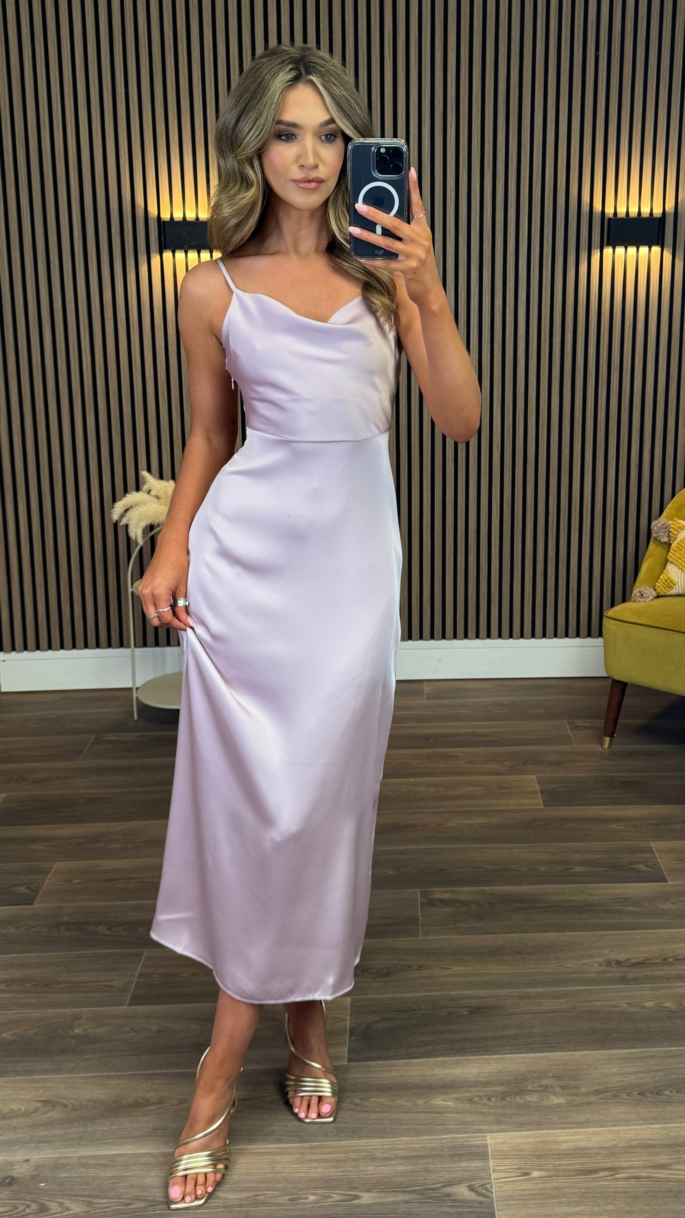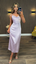 Twirl into the spotlight with our Rosaleen Lilac Satin Cowl Neck Maxi Dress! This gorgeous cami-style showstopper features a flirty cowl neckline that dances with every movement. The silky satin fabric feels like a dream against your skin, while the floor-sweeping length ensures all eyes stay on you. Ready to be the life of the party or the belle of the ball?