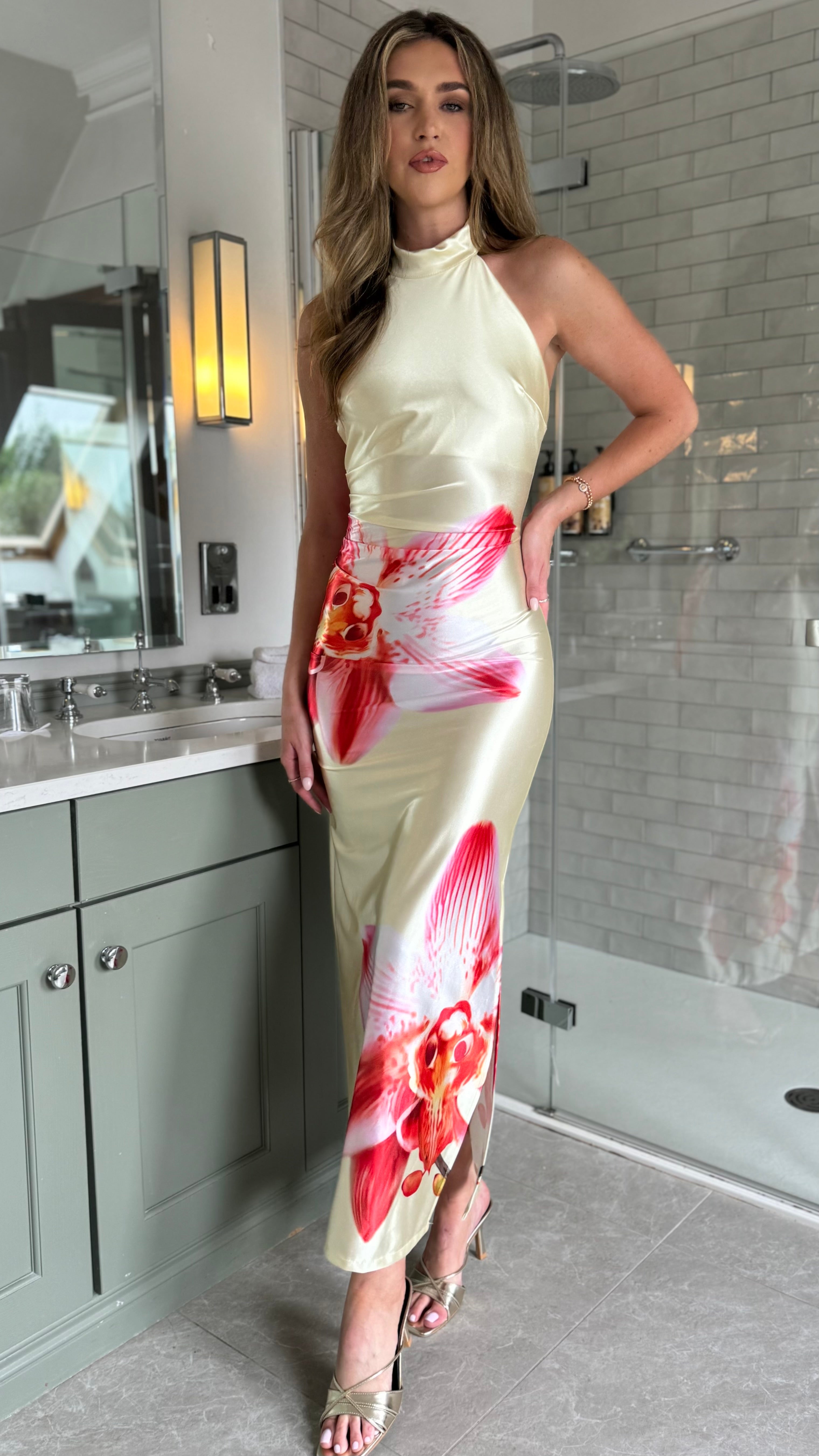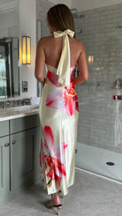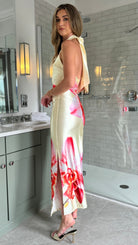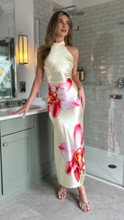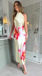 Rosalia Yellow & Pink Floral Halterneck Slit Satin Ruched Midi Dress