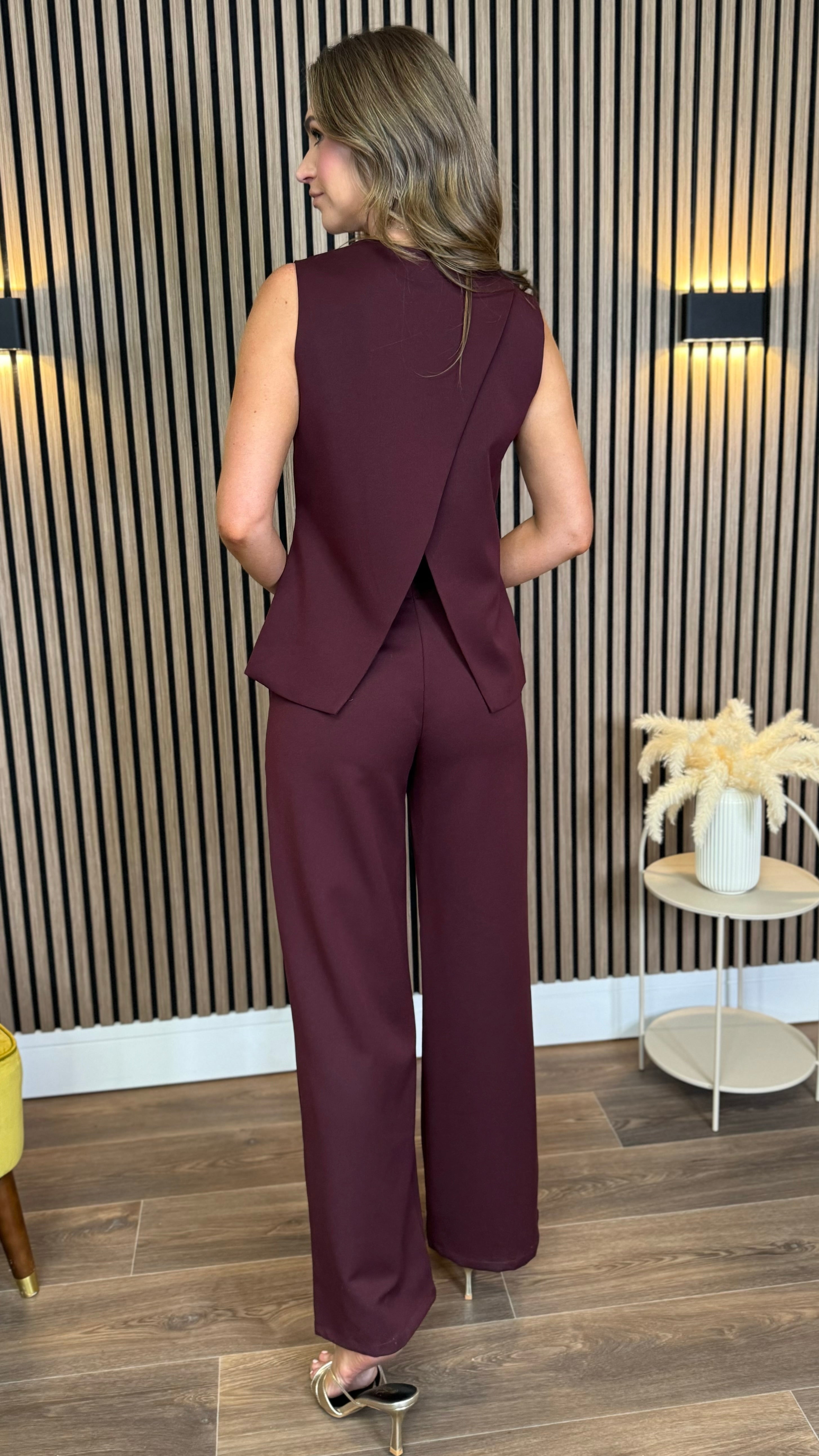 Discover timeless elegance with the Samara Wine Co-Ord, featuring a chic open-back waistcoat adorned with faux gold buttons and paired with flowing wide-leg trousers. This sophisticated set offers a perfect blend of style and comfort, ideal for making a refined statement at any occasion. ✨🍷