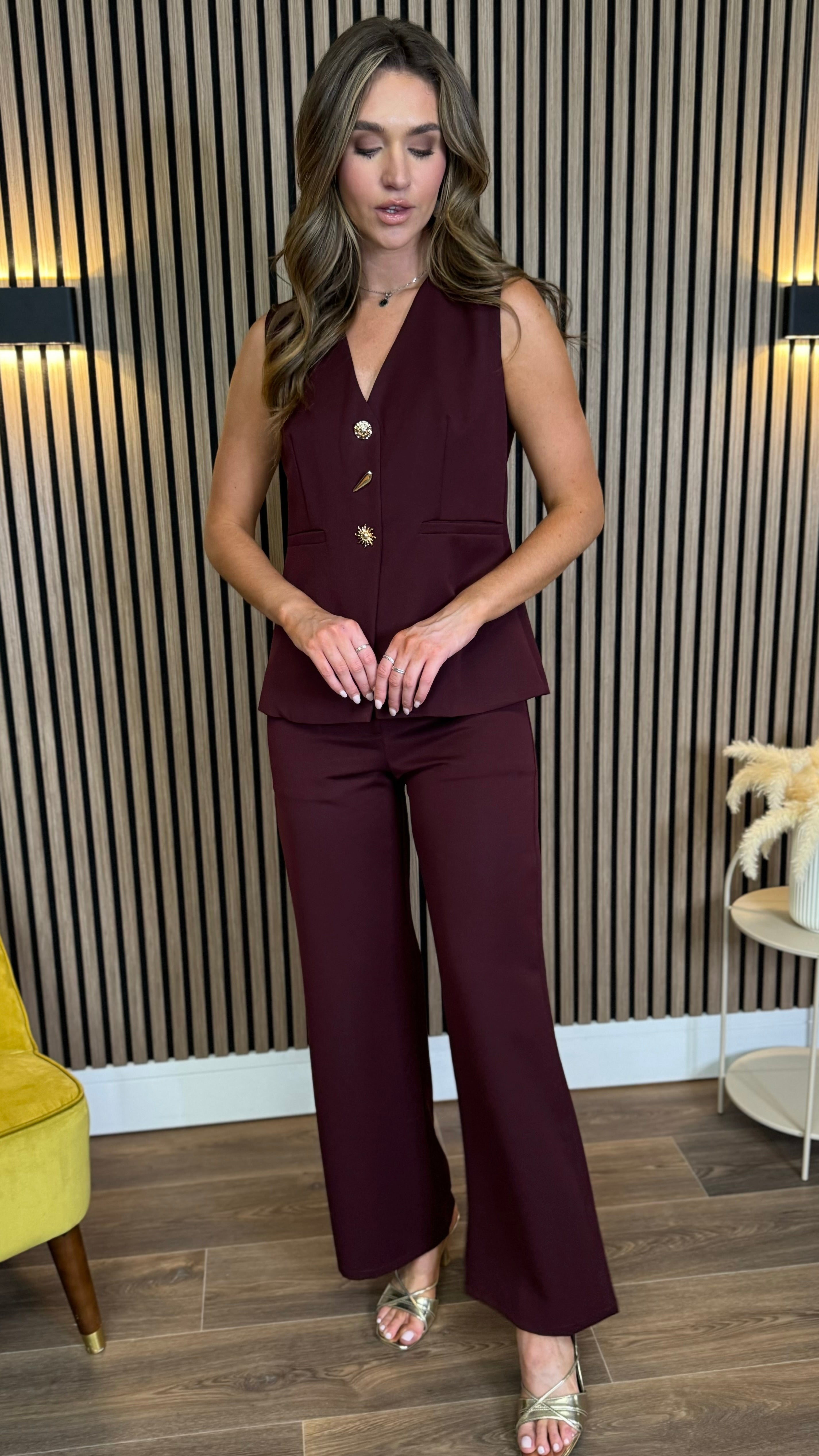 Samara Wine Open Back Faux Gold Button Detail Waistcoat & Wide Leg Trouser Co-Ord