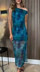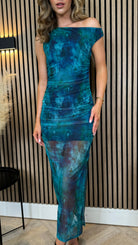 Get ready to party with our Sariah Green and Blue Printed Mesh Bodycon Midi Dress! Made from a playful printed mesh fabric, this dress has a ruched style and a sexy split seam. The attached slip lining ensures coverage while the off-shoulder straps add a touch of flirtiness. Just add heels and a clutch for a fun night out! 😉👠👛