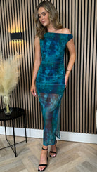Sariah Green and Blue Printed Mesh Bodycon Midi Dress